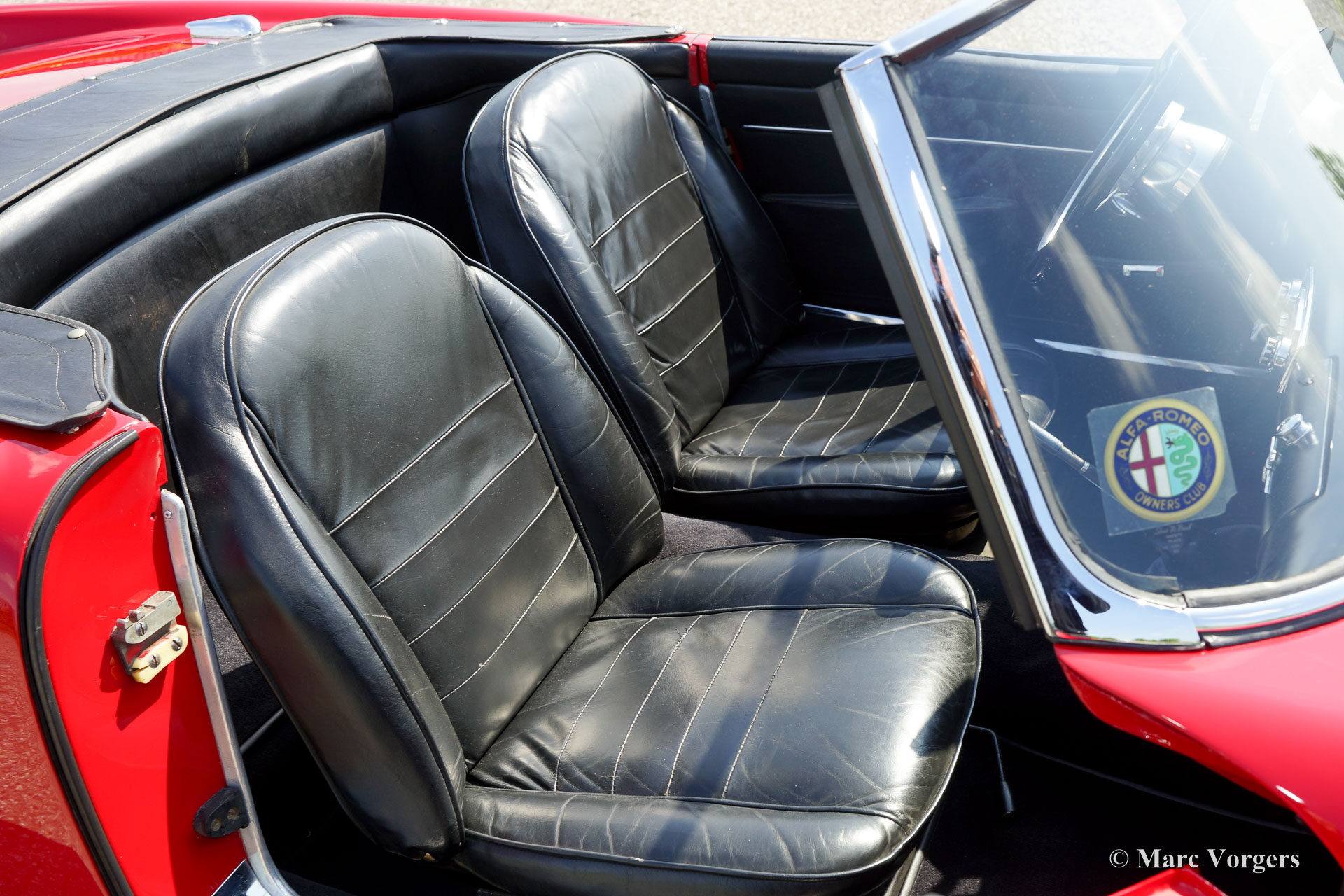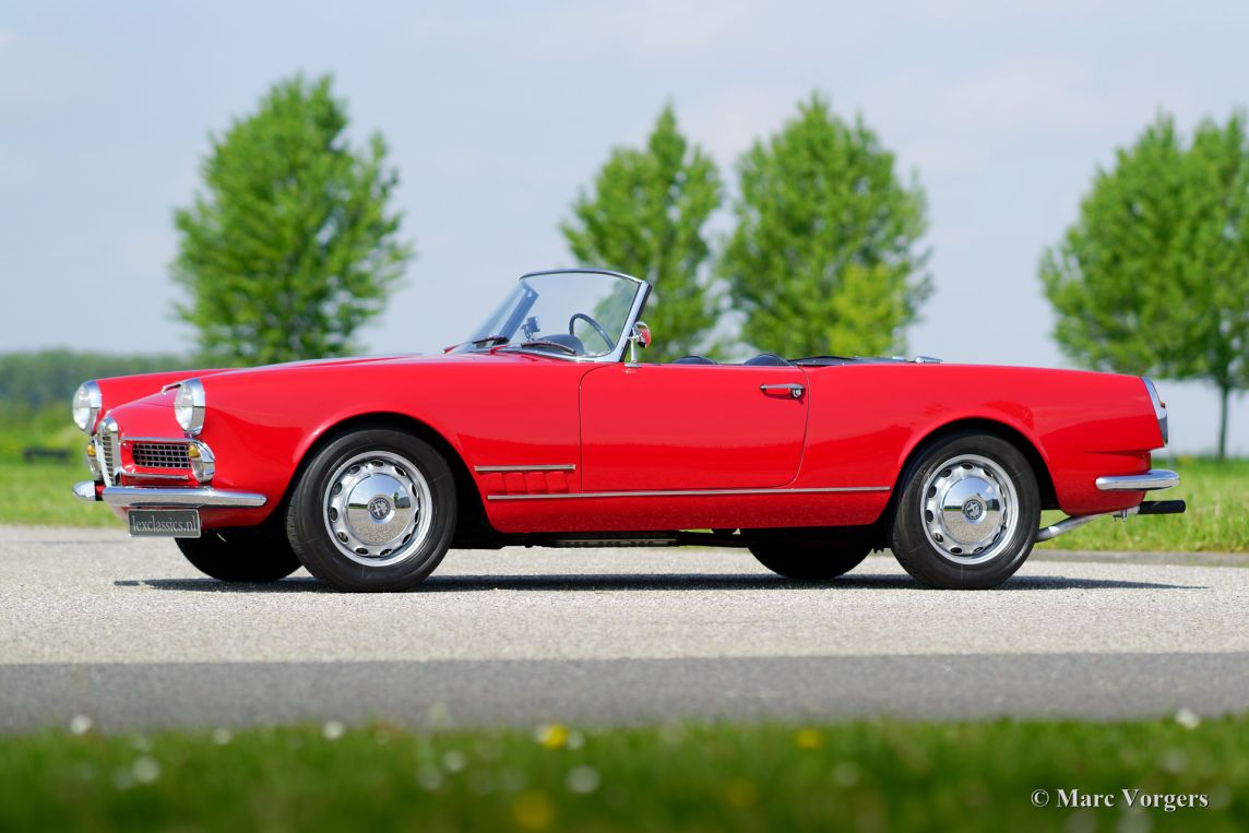 Alfa Romeo 2000 Touring Spider, année 1961. Couleur rouge (Alfa Rosso) avec un intérieur en cuir noir et tapis noir. Capot noir et couvercle de la hotte noir. La Alfa Romeo Spider offrant une magnifique expérience de conduite ouverte en combinaison avec un design à la mâchoire par Carrosseria Touring de Milan. Le moteur à quatre cylindres, à deux litres, avec des arbres à cames à tête double semble parfaitement et la boîte de vitesses à cinq rapports se déplace magnifiquement. Jouir la ‘gioia di vivere’ dans un style italien sportif et chic !