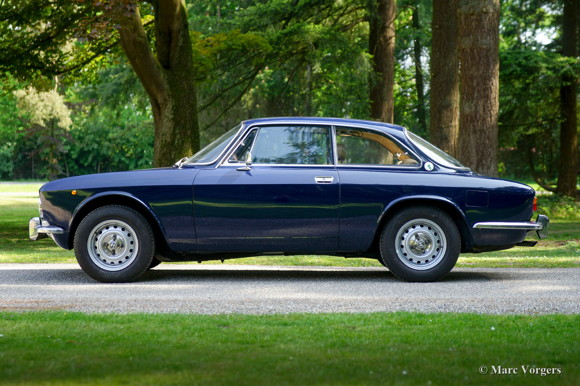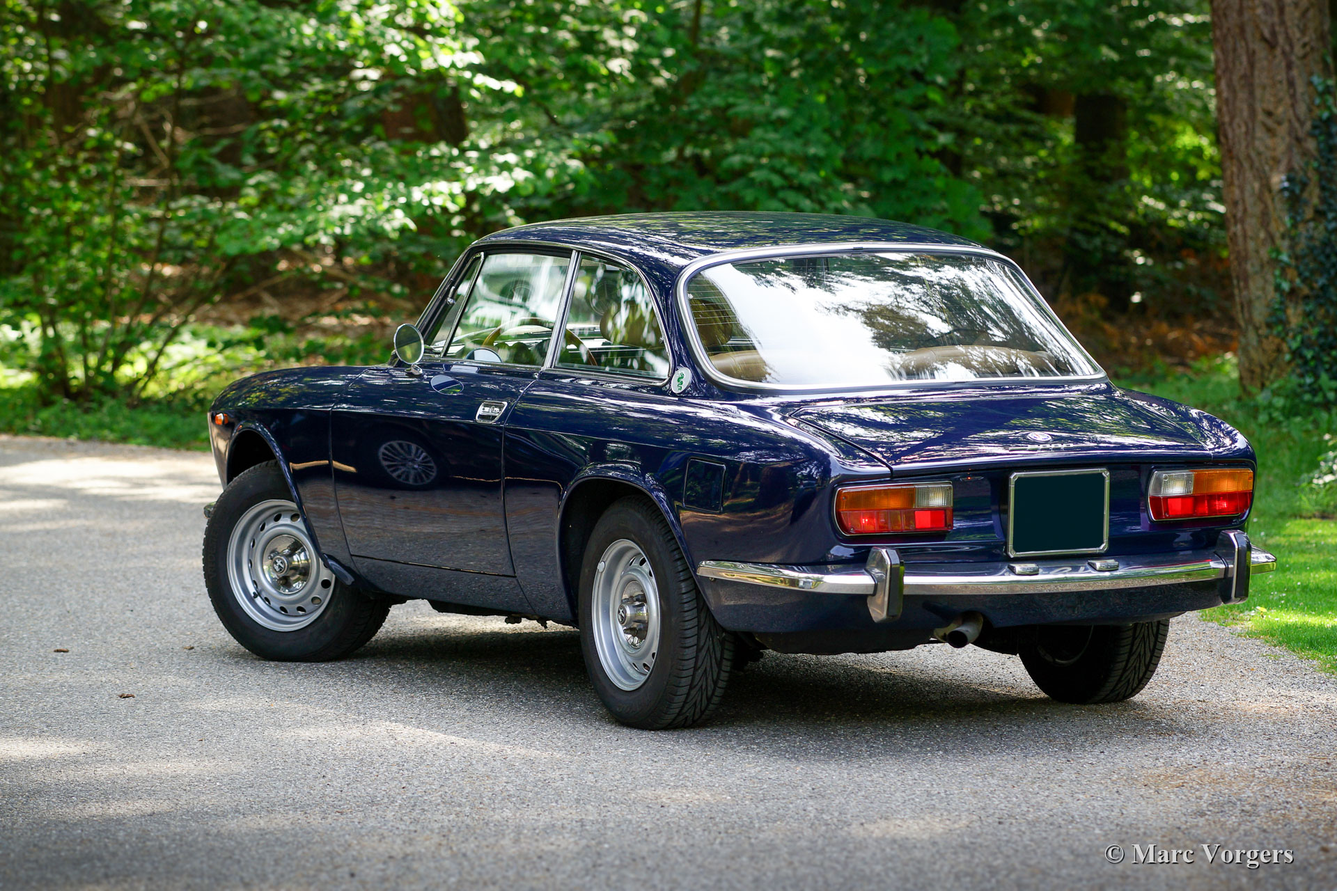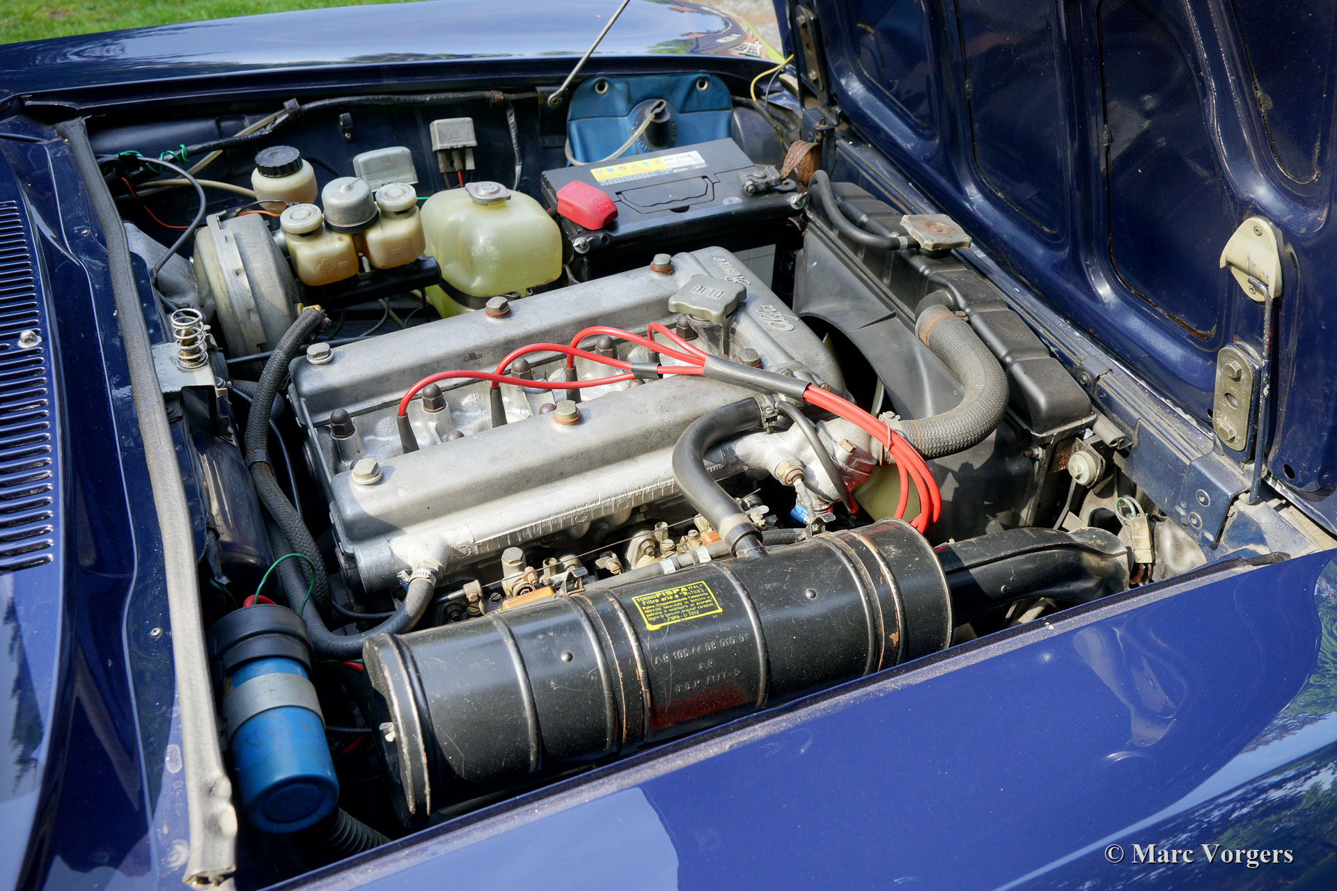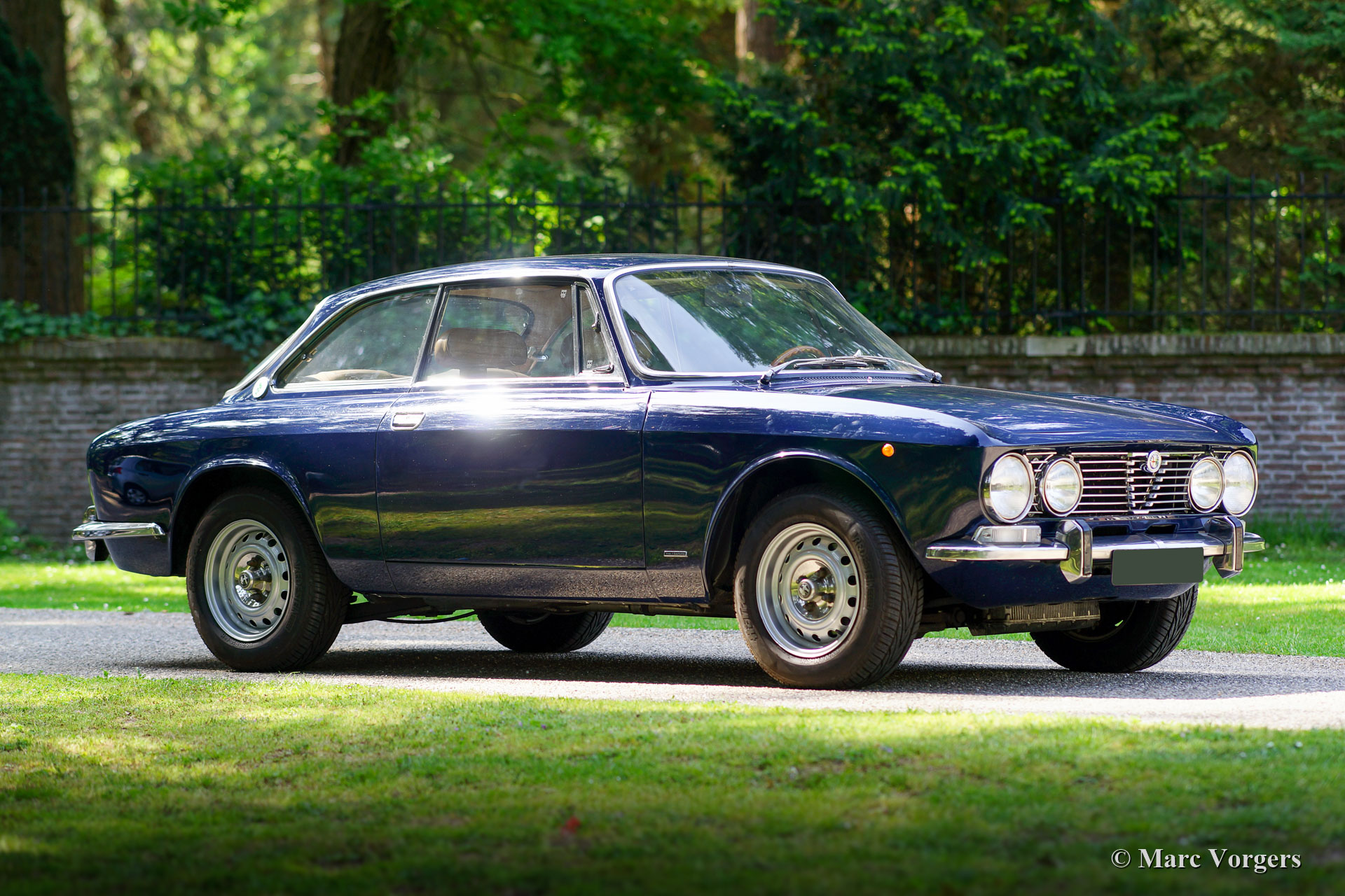 Alfa Romeo Giulia GTV 2000, année 1972. Couleur bleu foncé (Blu Olandese) combinée à un intérieur en similicuir beige et un tapis noir. Cette superbe Alfa Romeo « Bertone » était chérie par son propriétaire actuel depuis 2001. La voiture a remporté plusieurs prix pour son originalité dans les clubs et autres concours d’élégance. En 2005, la carrosserie fut remise en état top, la peinture bleue fut recouverte d’une couche de vernis transparent, puis polie à la perfection. En 2009, le moteur et la boîte de vitesses furent révisés par un spécialiste de la marque. Au cours du processus, des arbres à cames de type « fast road » furent installés. Cette Alfa Romeo GTV 2000 affiche tous les détails d'origine, l'intérieur est entièrement d'origine et l'aspect sous le capot a conservé tous les détails d'origine. Cette GTV 2000 est en excellent état avec de légères traces d'utilisation et d'âge (patine) en raison de la belle originalité. Ceci est un spécimen hautement souhaitable et honnête et une superbe voiture de conducteur !