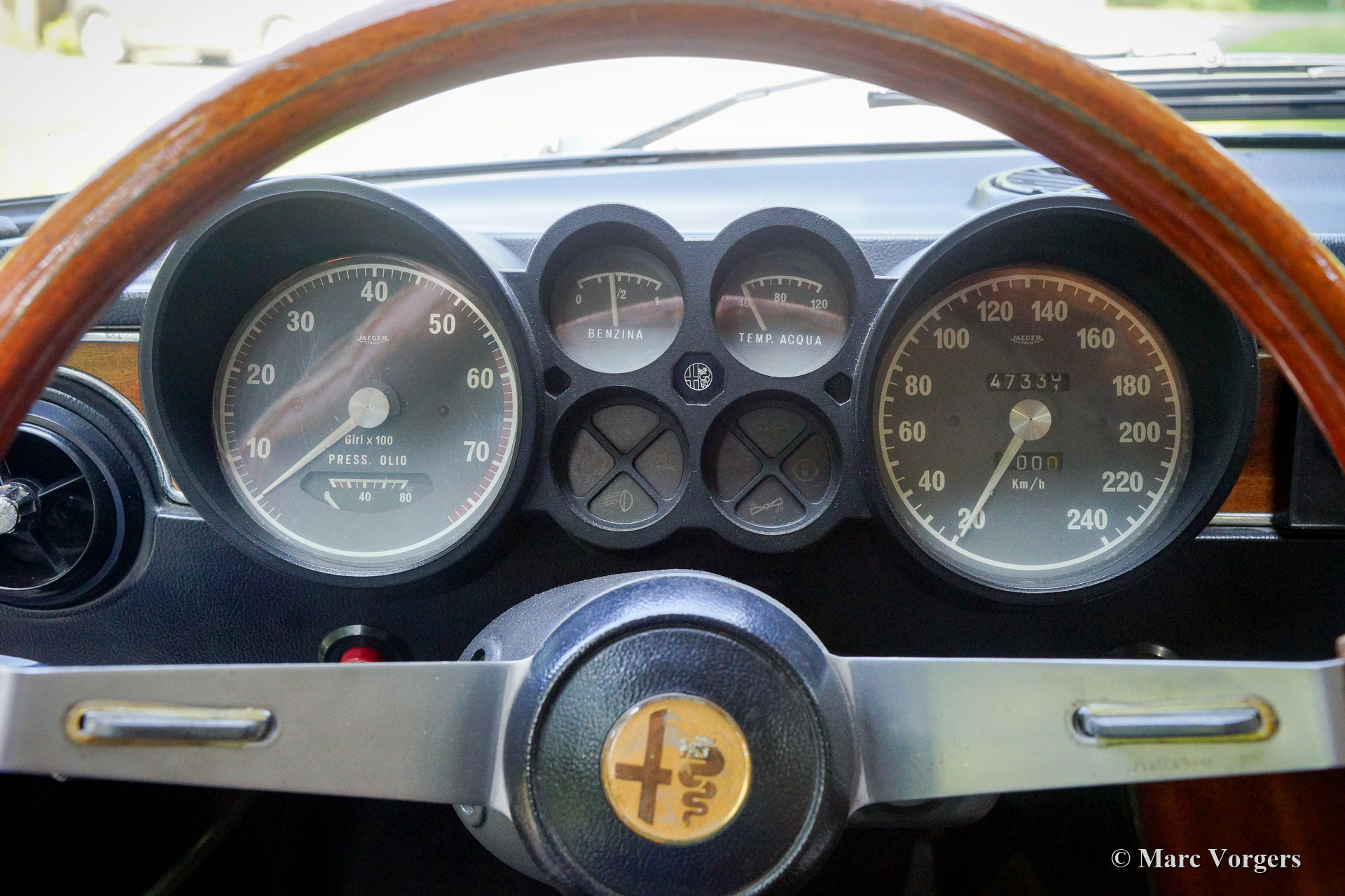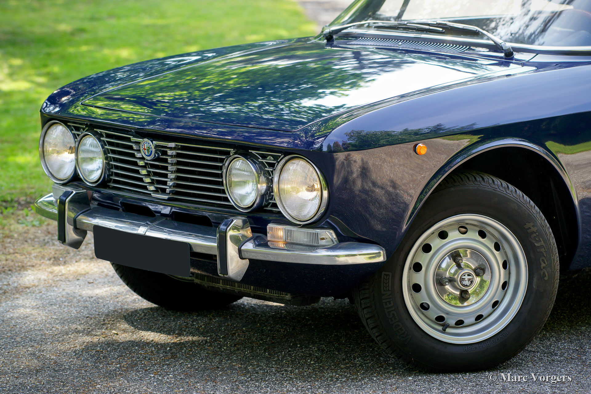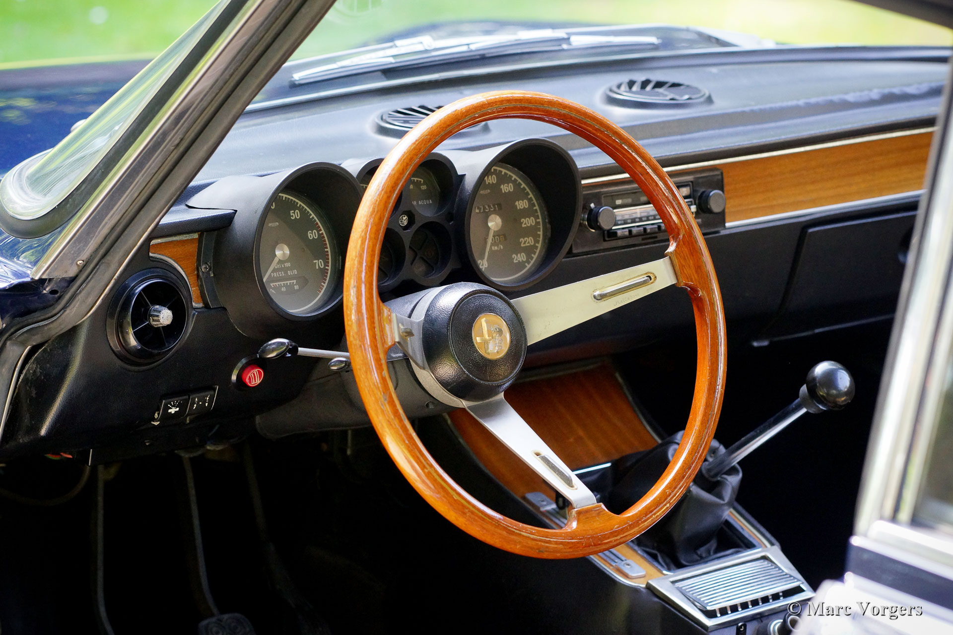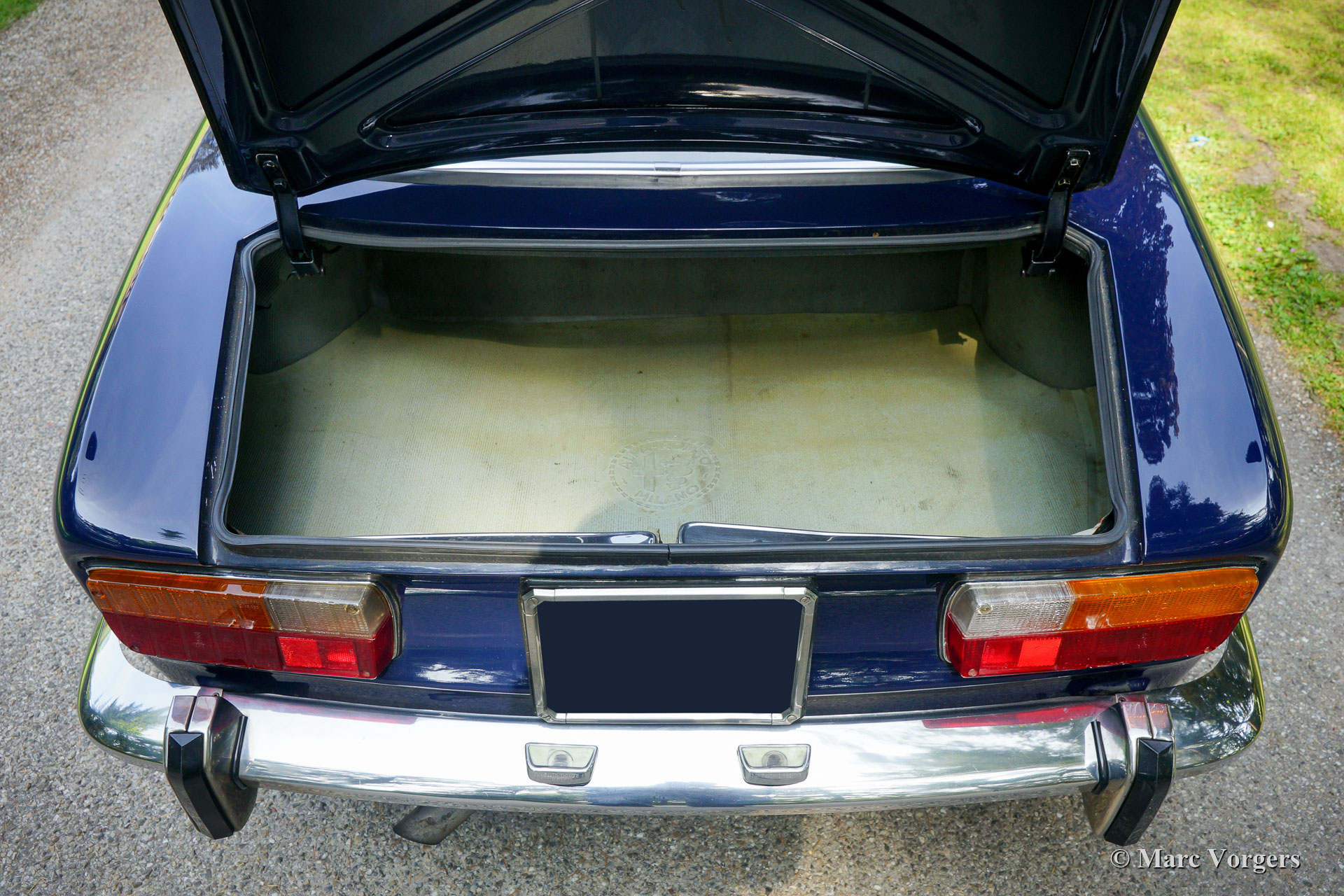 Alfa Romeo Giulia GTV 2000, année 1972. Couleur bleu foncé (Blu Olandese) combinée à un intérieur en similicuir beige et un tapis noir. Cette superbe Alfa Romeo « Bertone » était chérie par son propriétaire actuel depuis 2001. La voiture a remporté plusieurs prix pour son originalité dans les clubs et autres concours d’élégance. En 2005, la carrosserie fut remise en état top, la peinture bleue fut recouverte d’une couche de vernis transparent, puis polie à la perfection. En 2009, le moteur et la boîte de vitesses furent révisés par un spécialiste de la marque. Au cours du processus, des arbres à cames de type « fast road » furent installés. Cette Alfa Romeo GTV 2000 affiche tous les détails d'origine, l'intérieur est entièrement d'origine et l'aspect sous le capot a conservé tous les détails d'origine. Cette GTV 2000 est en excellent état avec de légères traces d'utilisation et d'âge (patine) en raison de la belle originalité. Ceci est un spécimen hautement souhaitable et honnête et une superbe voiture de conducteur !