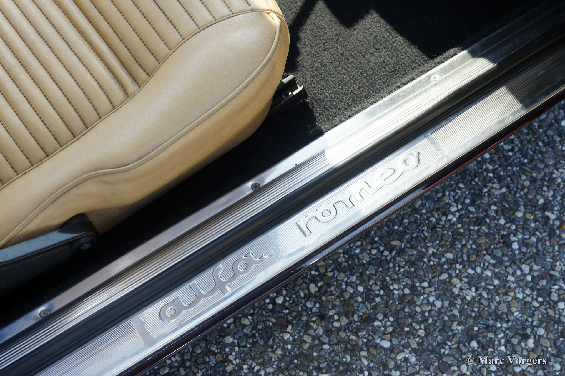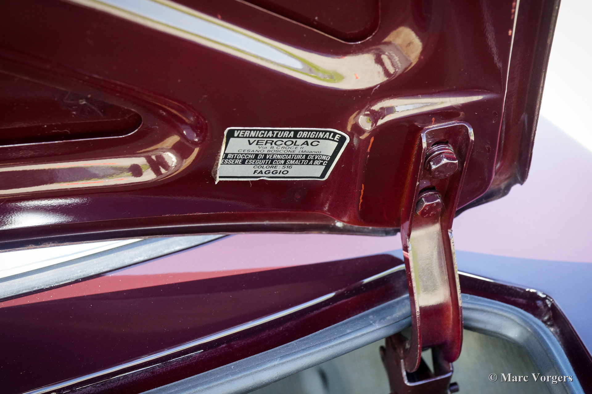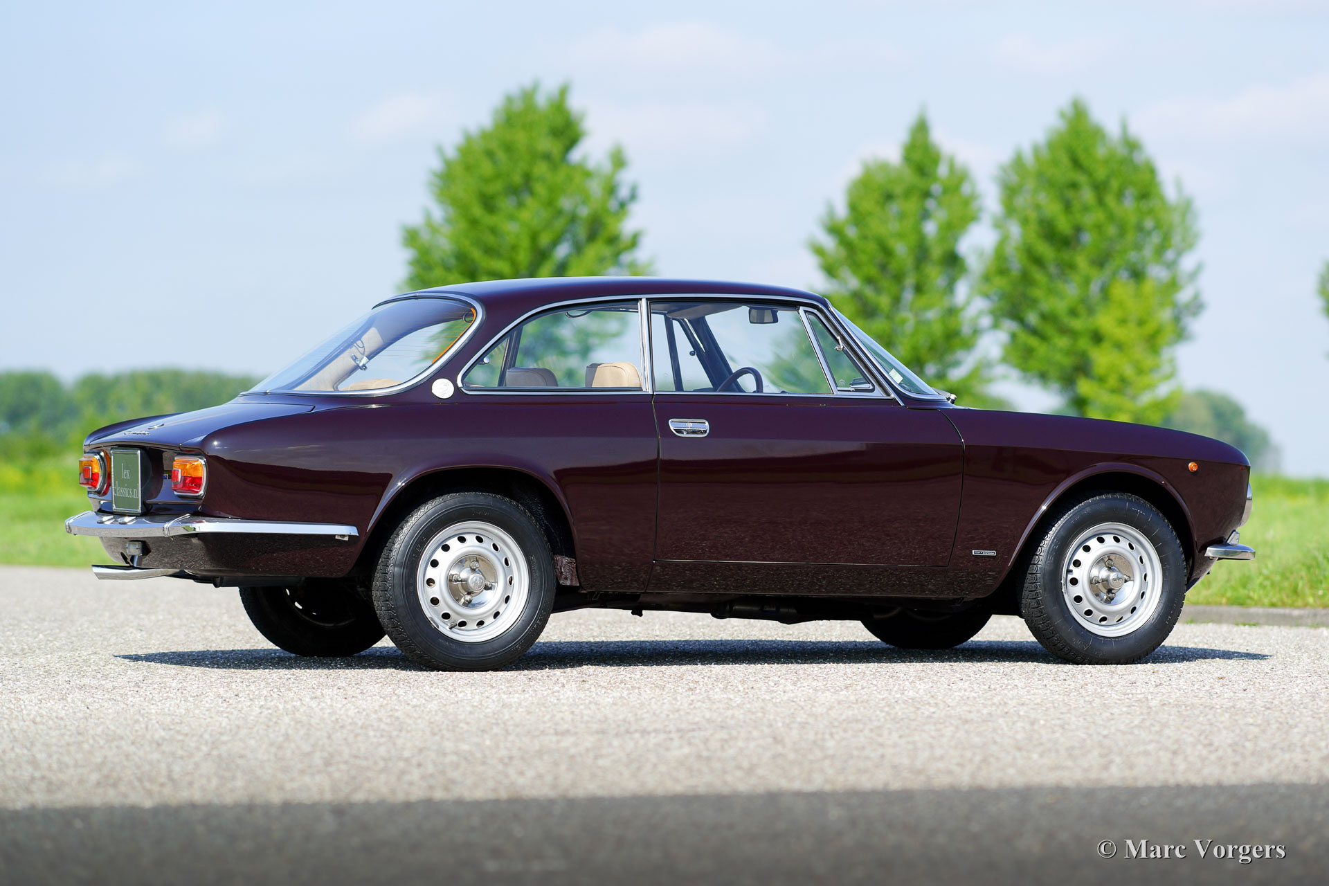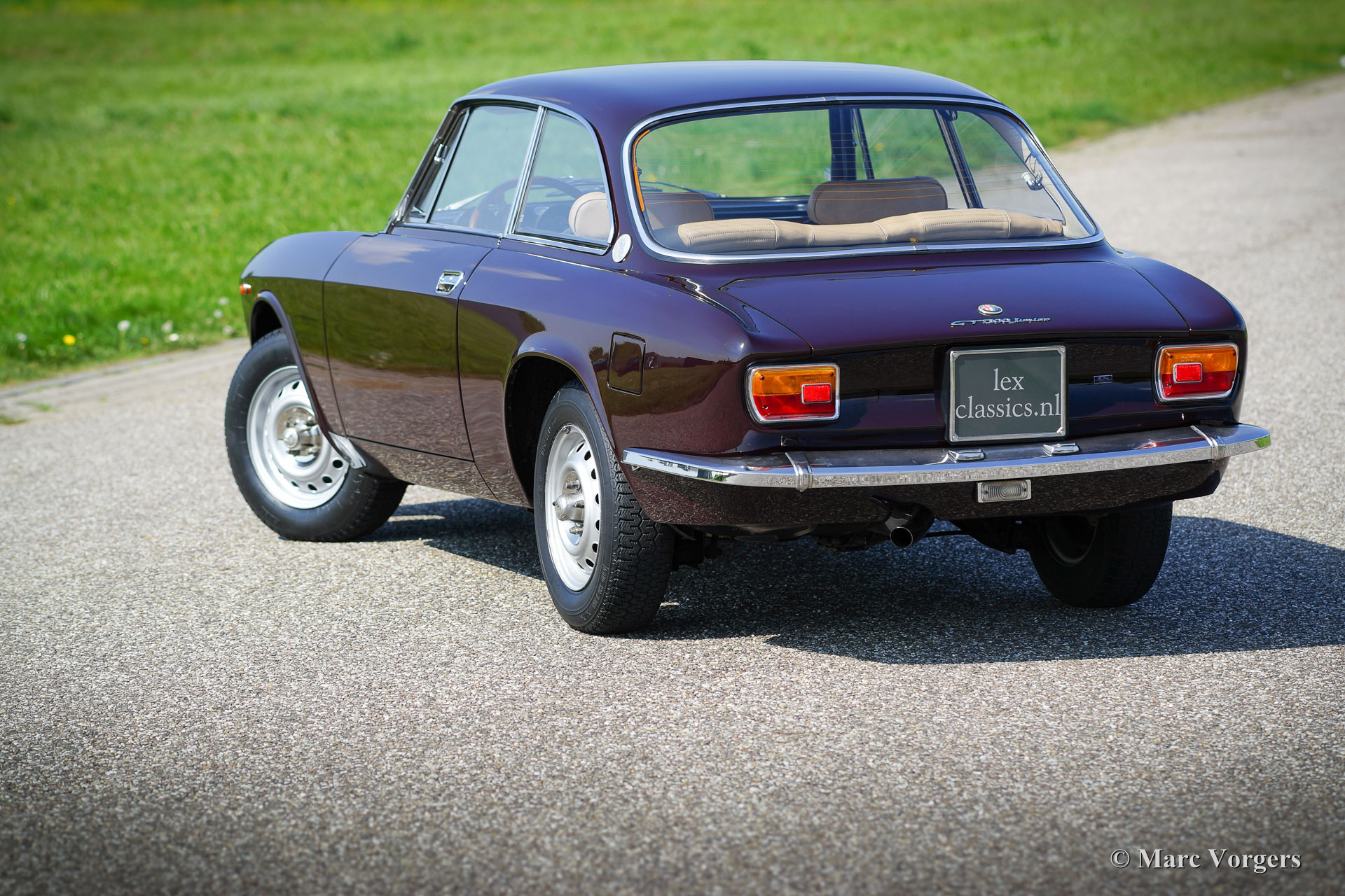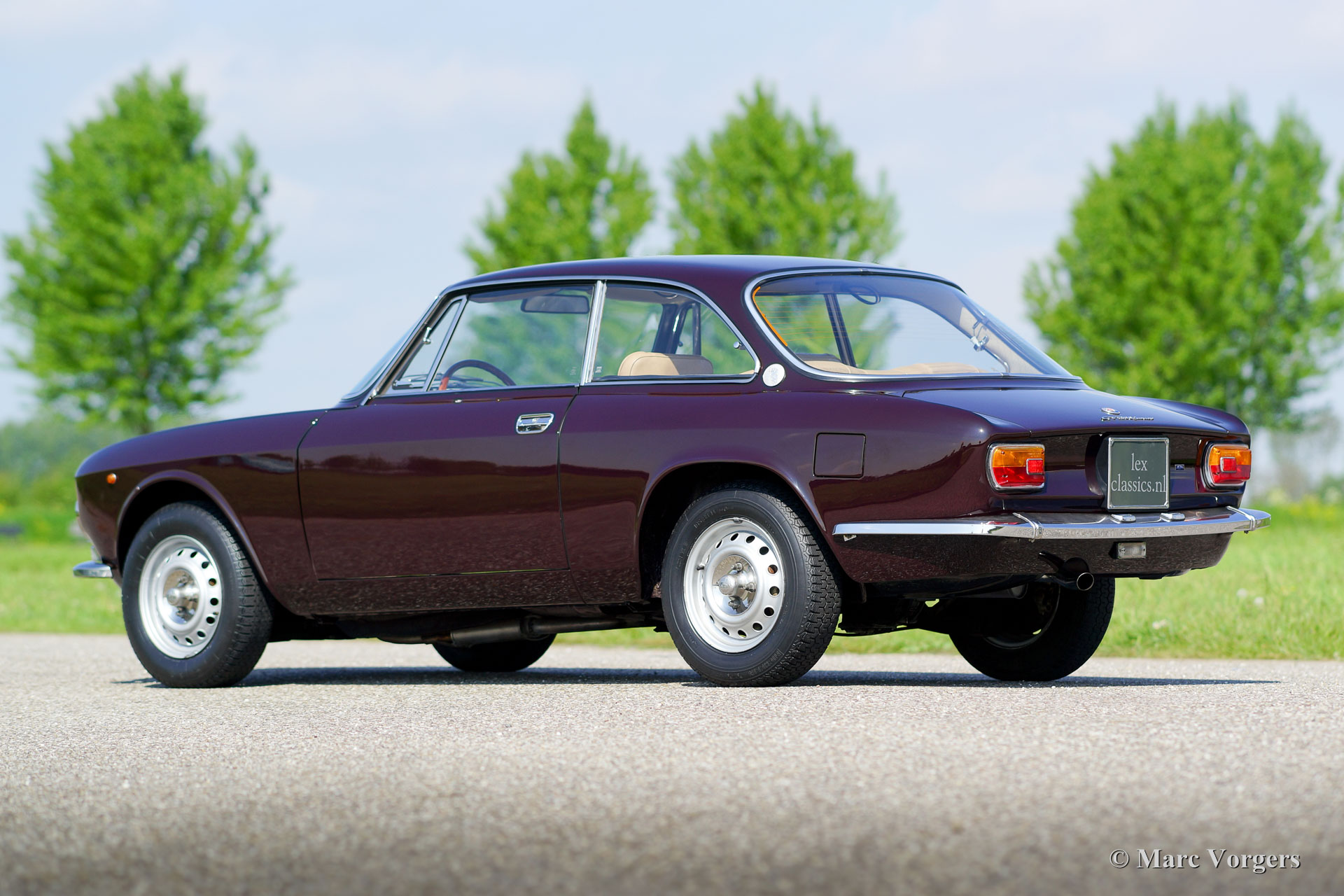 Alfa Romeo Giulia GT 1300 Junior ‘Lusso‘, année 1975. Couleur 'Faggio' (Rouge Bourgogne foncé, code couleur Alfa AR 516) avec un intérieur en similicuir beige et tapis noir. Ce magnifique Alfa Romeo GT 1300 Junior, également nommé «Bertone» par les amateurs, a été livré neuf à Rome, en Italie, le 20 février 1975. Cet Alfa Romeo est en superbe état et la voiture n'a parcouru qu'à 75.600 kilomètres de la nouvelle. La voiture fut parfaitement repeinte dans la couleur d'origine il y a des années. Tous les détails originaux sont présents, ainsi que les autocollants d'usine sous le capot et dans le tronc. La voiture n'a jamais été équipée d'une radio, de sorte que la bande de tableau de bord en bois conserve encore sa virginité. Cette belle Alfa Romeo est livré avec l'ensemble d'outils original et complet. La partie d'échappement arrière a été échangée par une unité sportive qui ajoute une «présence» au son du moteur. Ce GT 1300 Junior est un modèle dite 'Lusso' (de luxe). C'est le dernier modèle de cette gamme avec l'intérieur, l'insonorisation et la grille du Giulia GTV 2000 haut de gamme. Il conserve toujours les pare-chocs et les feux arrière des voitures précédentes. Ce type de voitures classiques super originales et jamais restaurées en excellente qualité est le Saint Graal pour les enthousiastes sérieux et les collectionneurs - Une restauration de première classe ne peut pas correspondre à l'originalité parfaite et au charme que les années ont ajouté à son pedigree.