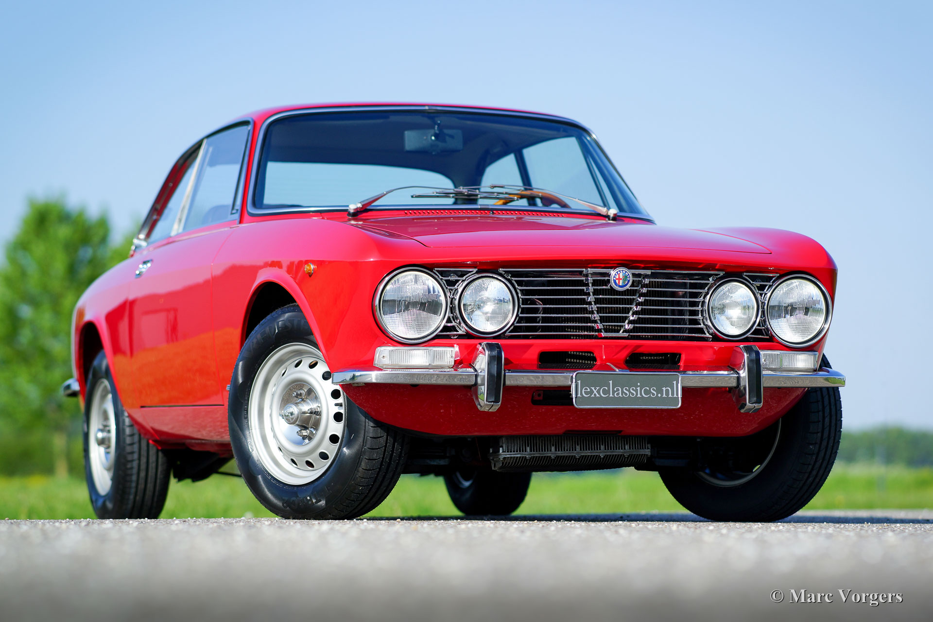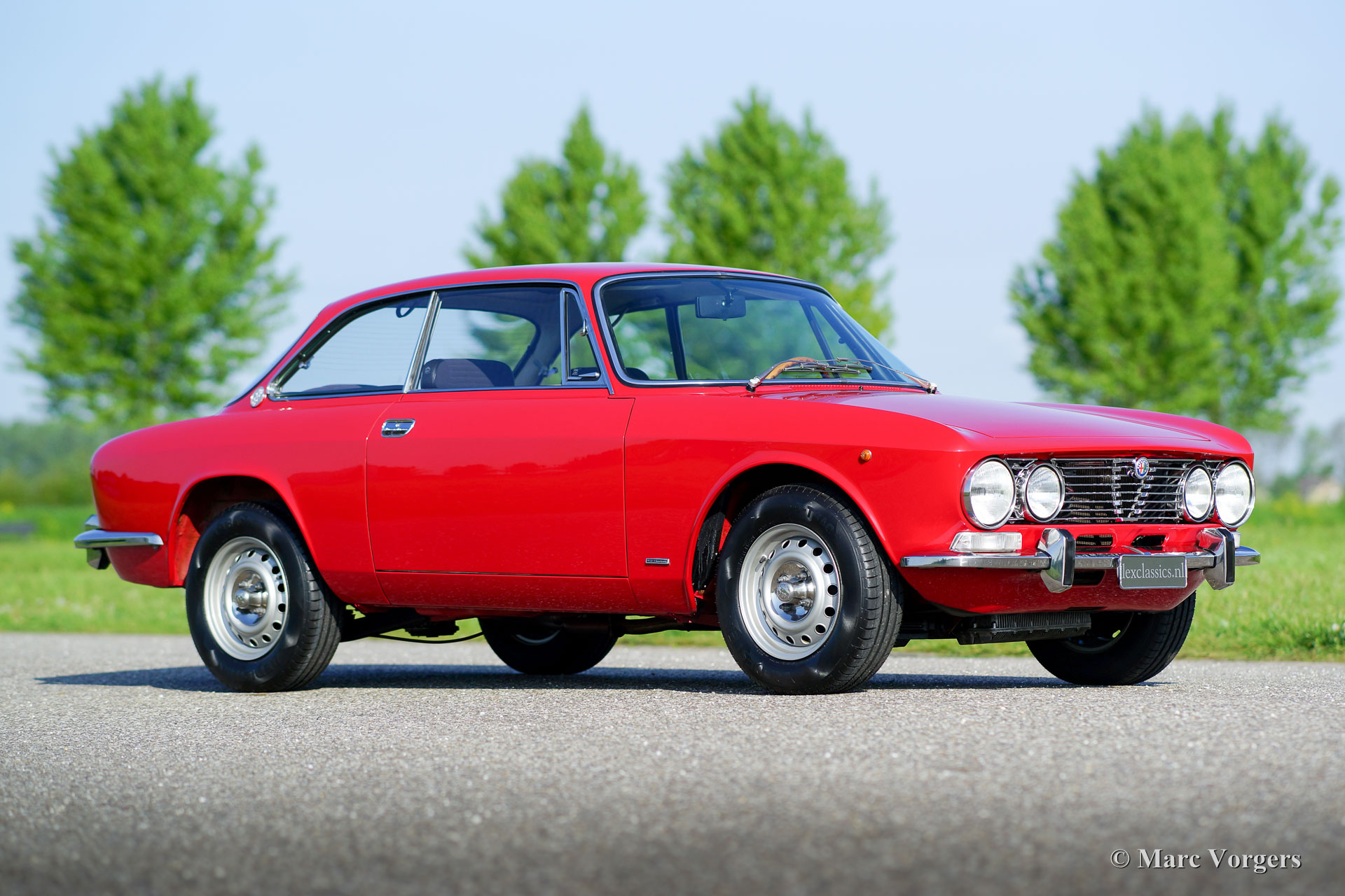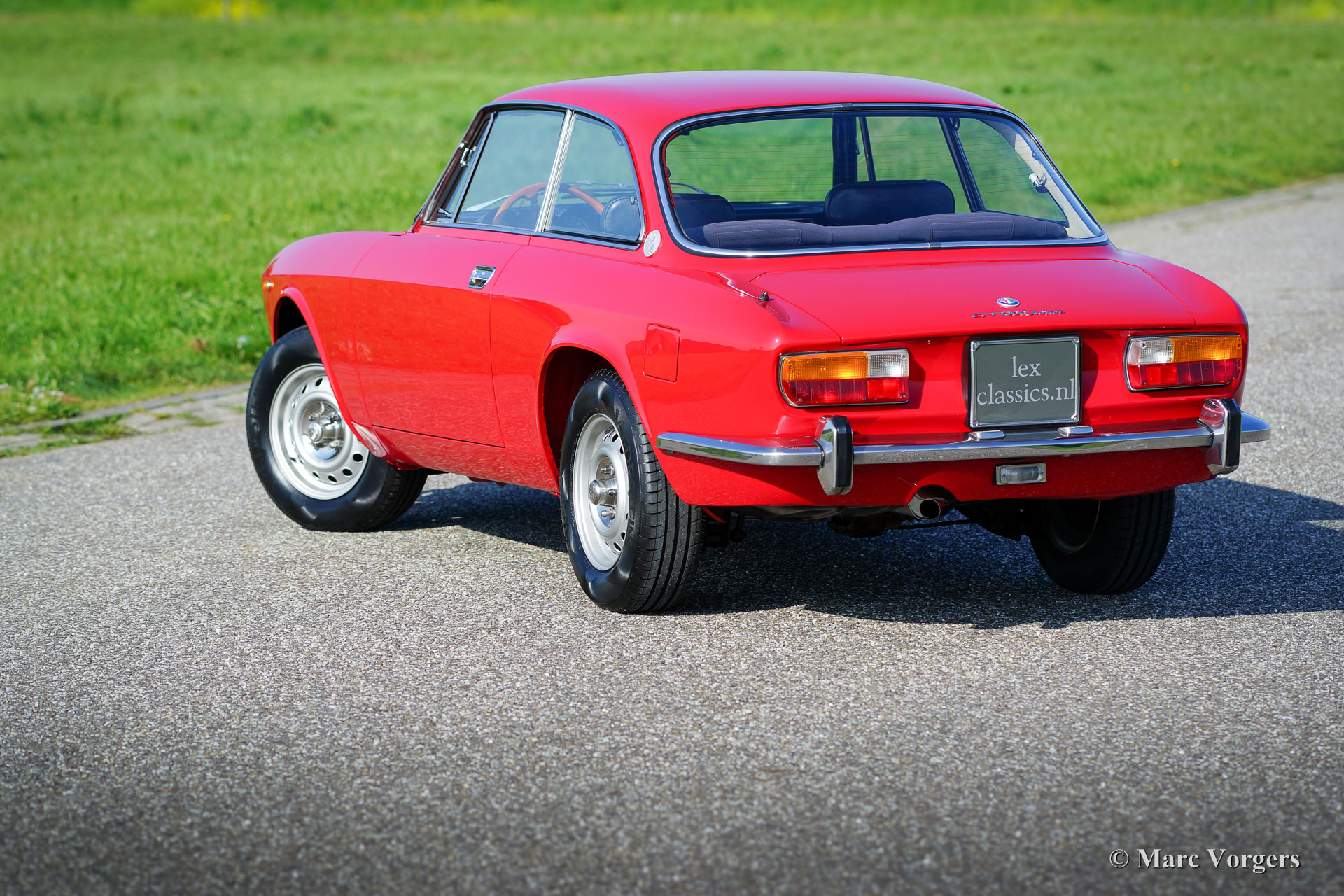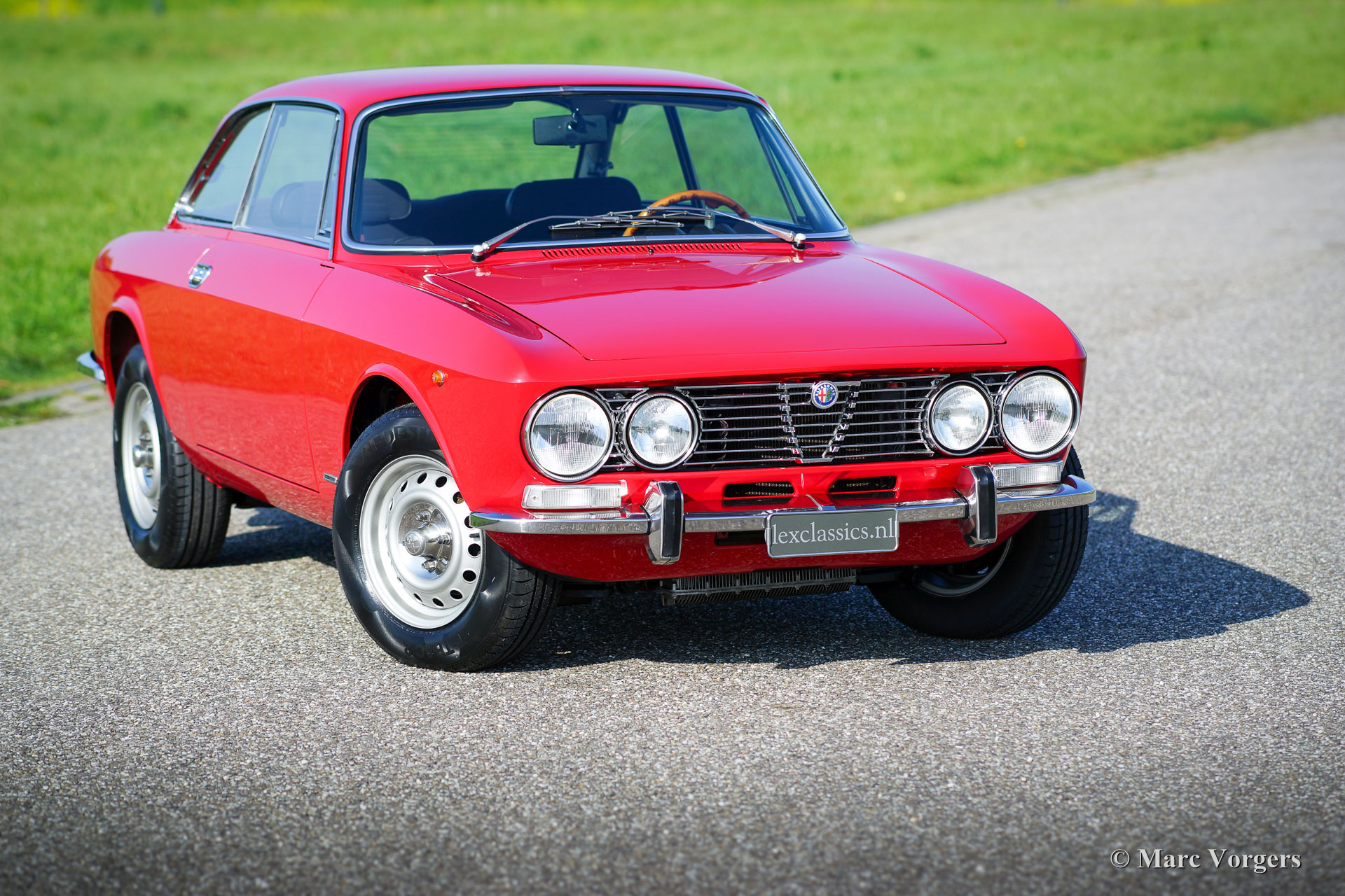 Alfa Romeo GT 1300 Junior 'Lusso', année 1975. Numéro de châssis AR10530 * 0001302. Couleur rouge (Alfa Rosso 501) avec un intérieur en similicuir et de tissu noir / gris et tapis noir. Cette magnifique Alfa Romeo Giulia GT 1300 Junior, également appelée «Bertone» par les passionnés, provient du premier propriétaire italien! Ce super original Alfa Romeo fut importé récemment aux Pays-Bas. La voiture a conduit seulement 55.055 kilomètres de nouveau ! Cette Alfa Romeo en état TOP, concours ! Le corps n'a jamais été soudé, rien n'a été restauré, la voiture n'a reçu qu'une nouvelle peinture parfaite dans la couleur d'origine ! Ce magnifique ‘Bertone’ montre tous les détails originaux, l'ensemble d'outils original est présent, tout comme les livres d'origine. La voiture est équipée d'une belle radio Grundig. Ce GT 1300 Junior est un modèle dite ‘Lusso’ (de luxe). C'est le dernier modèle de la série avec l'intérieur, l'insonorisation, la grille, les arrière-lumières et les pare-chocs du Giulia GTV 2000 haut de gamme. Ce type de voitures classiques super originales et jamais restaurées dans Excellente à la première condition sont le Saint Graal pour les enthousiastes sérieux et les collectionneurs - Une restauration de première classe ne peut pas correspondre à l'originalité parfaite et le charme que les années ont ajouté à son pedigree.