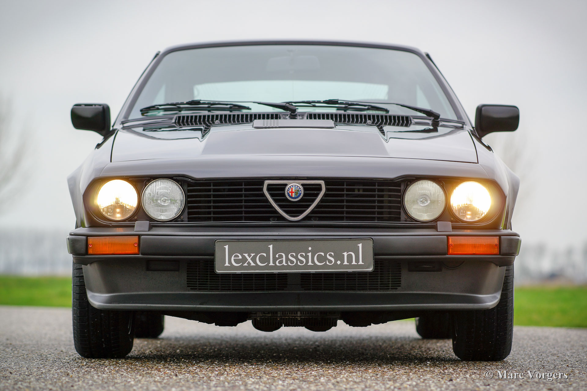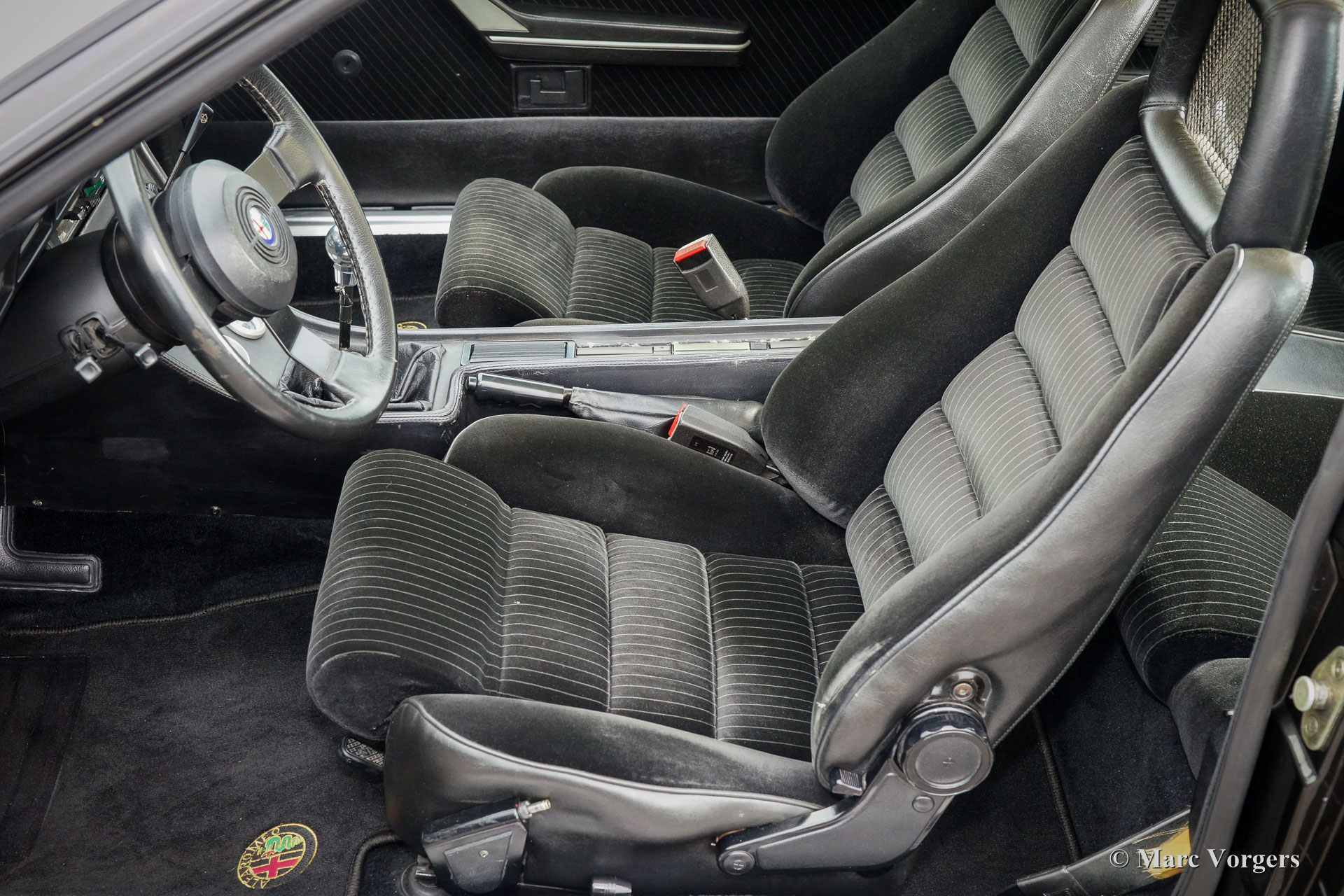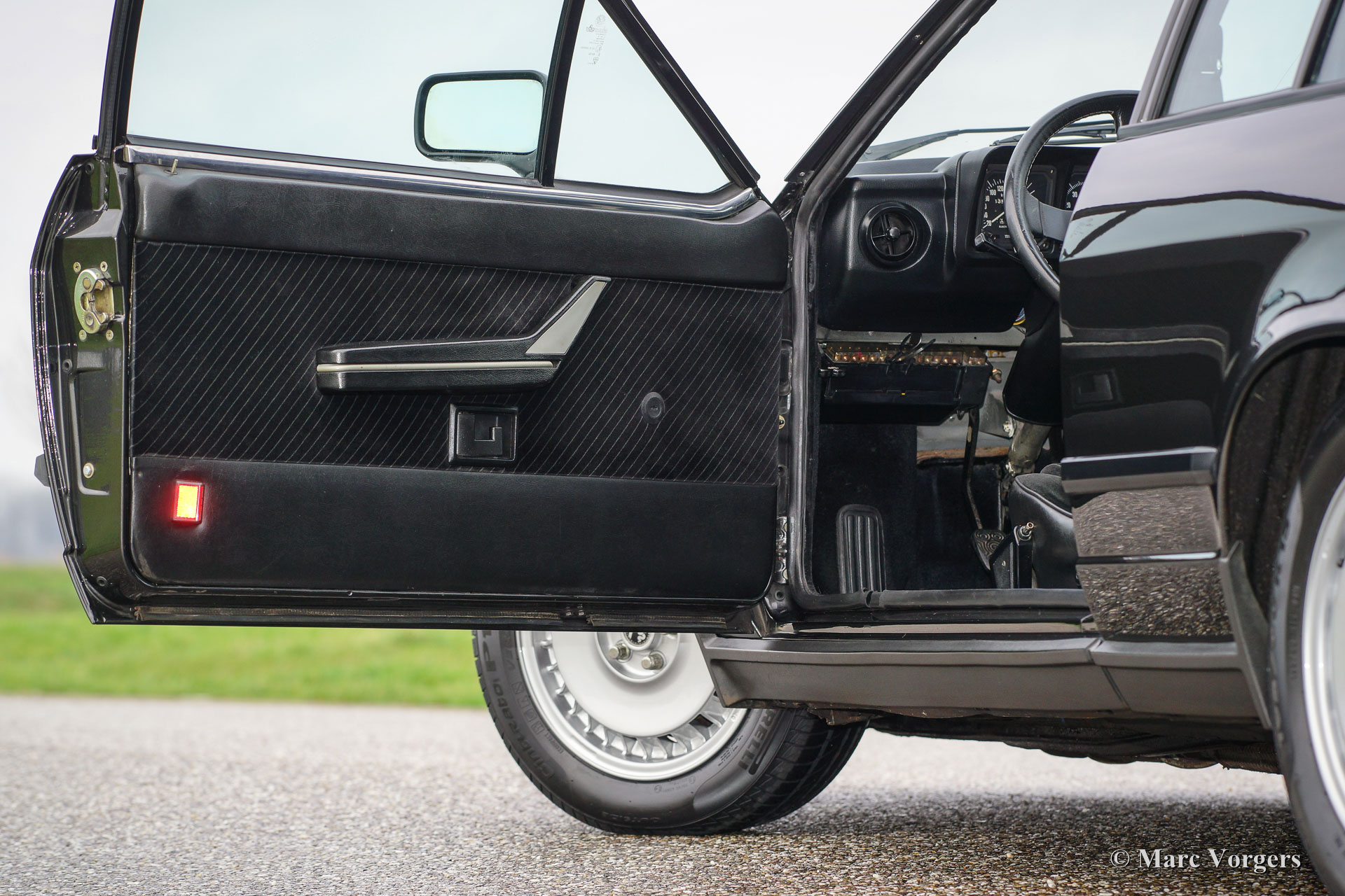 Alfa Romeo GTV6 2.5, année 1984. Couleur anthracite métallisé avec un interieur tissu noir et tapis noir. Ce magnifique Alfa Romeo GTV6 a été vendue neuve aux Pays-Bas par le représentant Alfa Romeo 'Albatros' à Amsterdam. Cette GTV6 est en très bon état et très original ! Il y a quelques années, la voiture a été donnée belle nouvelle peinture. L'intérieur est entièrement original et très bon avec quelques traces d'utilisation. Le moteur V6 est un joyau fournir beaucoup de couple et un son magnifique. La boîte de vitesses «transaxle», qui est monté sur le différentiel arrière, décale parfaitement. Le GTV6 est le modèle top-of-the-line de la série Alfetta. Un bon et très original par exemple, comme cette voiture est difficile à trouver. La voiture dispose les roues en alliage léger d'origine. Les livrets service et d'instruction originaux sont présents.