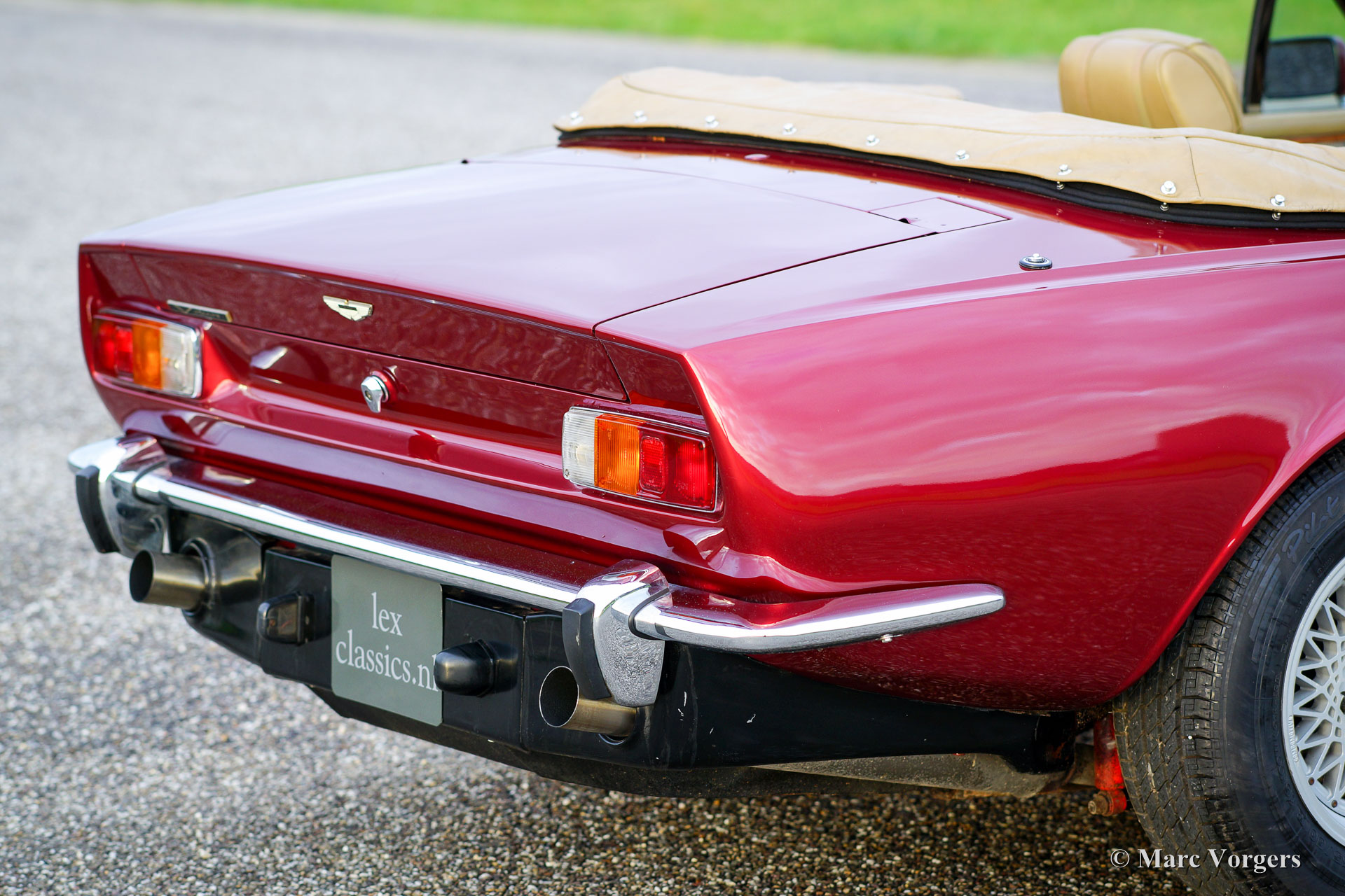 Aston Martin V8 Volante, année 1979. Couleur rouge métallique avec un intérieur en cuir beige et une capuche beige. Une Aston Martin super original.