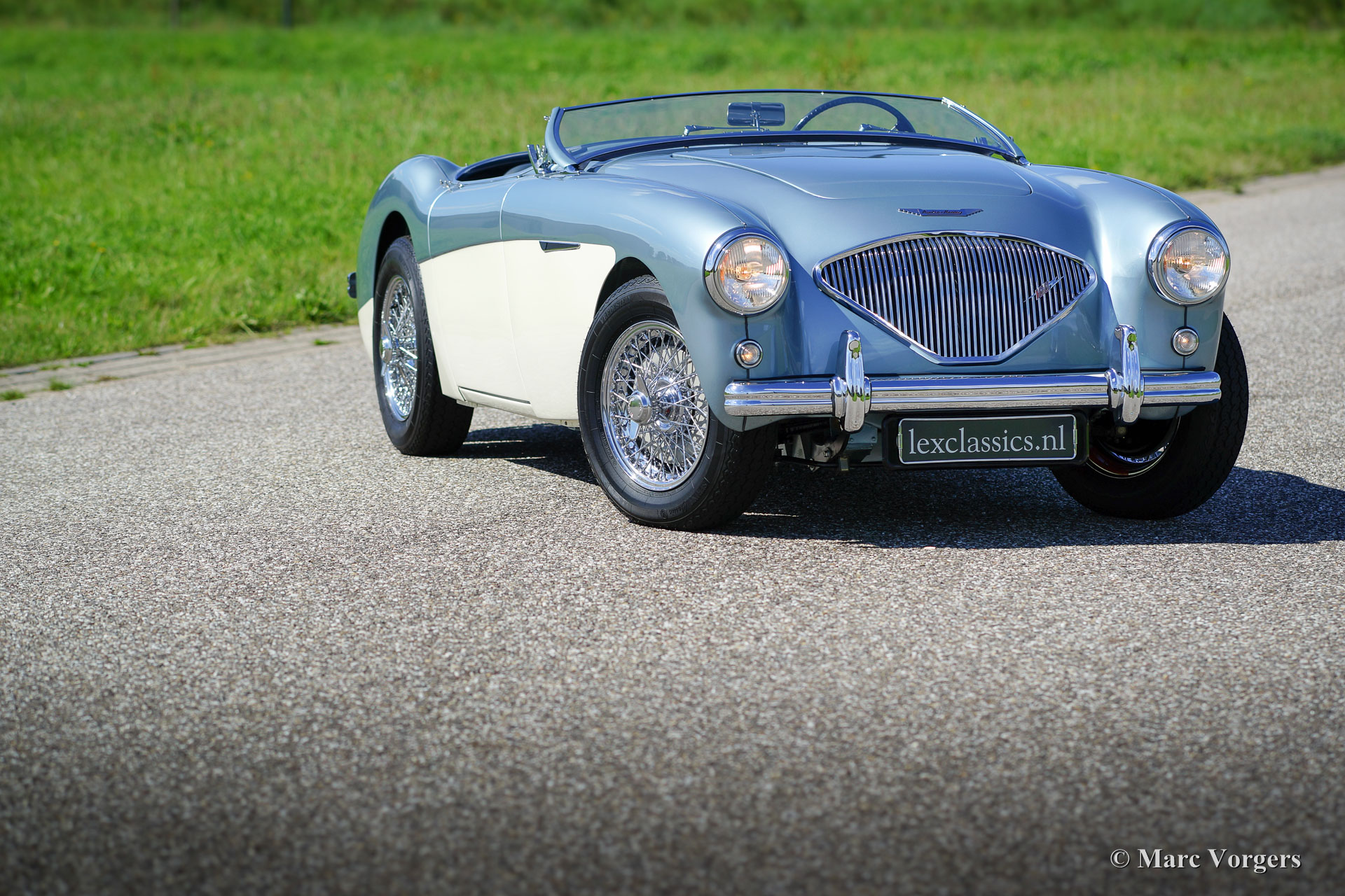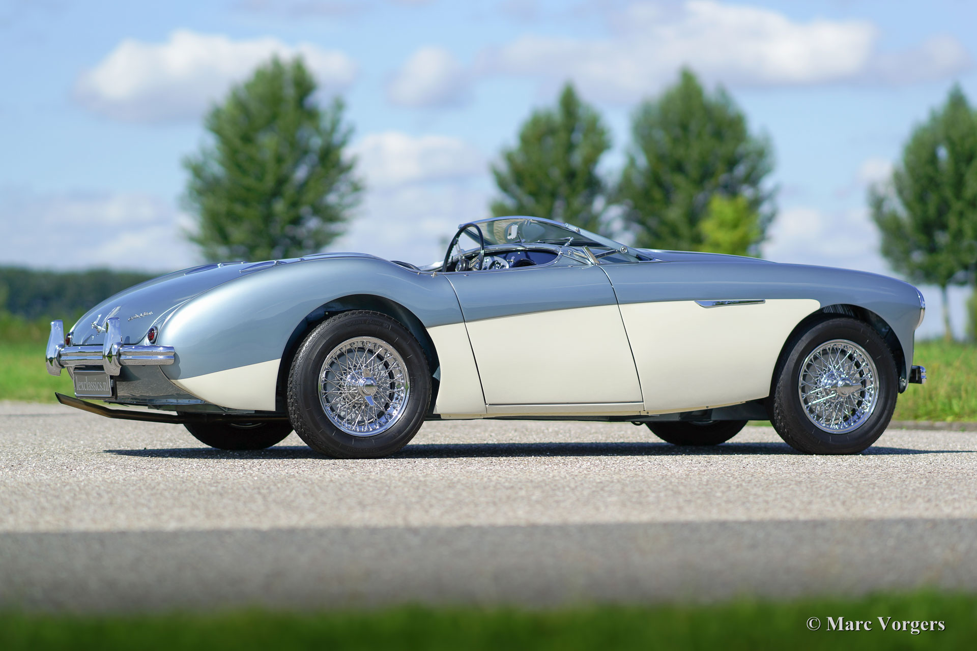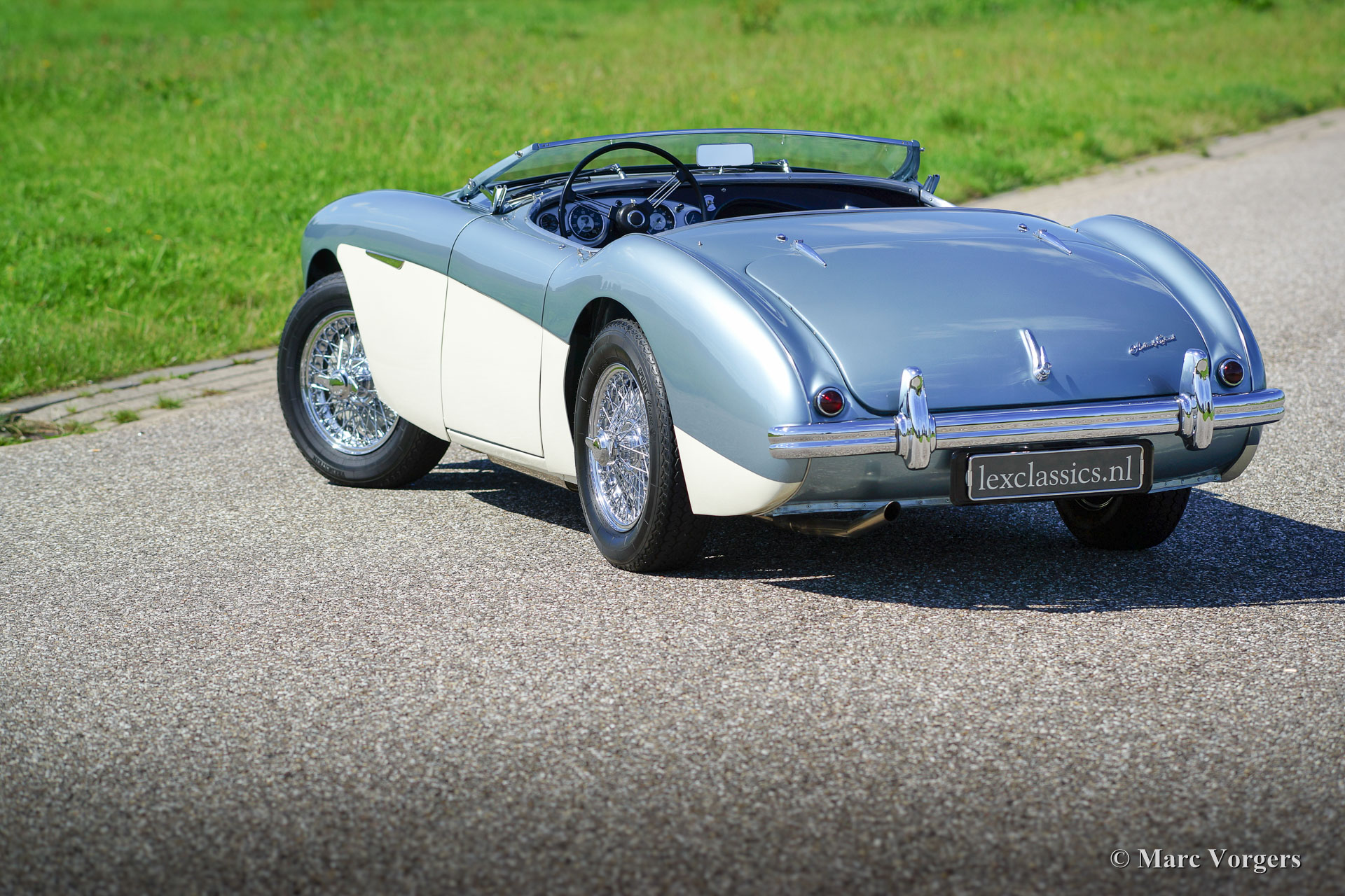 Austin Healey 100/4 (BN-1), année 1955. Numéro de châssis BN1-L / 521XX, numéro de moteur 1B / 2065XX; « matching numbers ». Couleur Ice blue (bleu glacier) métallique sur crème blanche. Intérieur en cuir bleu et tapis bleu. Ce magnifique Austin Healey 100/4 a été restauré détaillé. L'automobile est en superbe état haut ; concours ! Un reportage photo de la restauration est présent. Ce fantastique Healey ‘100-four’ dispose d'une overdrive et roues à rayons chromees. Cette ‘Big Healey’ roule superbement, un très beau spécimen pour le vrai passionné.