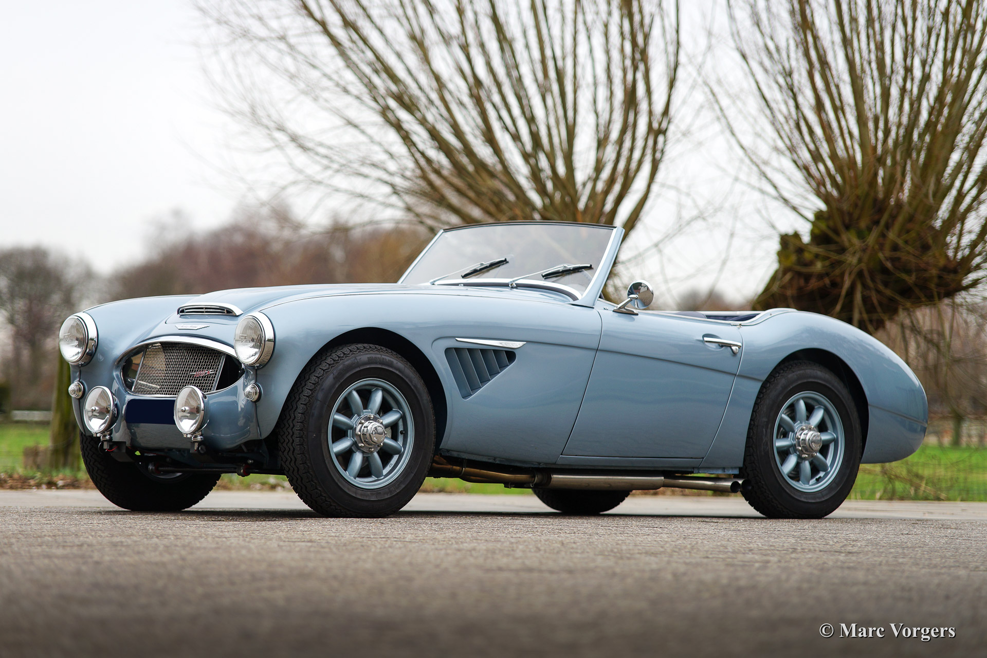 Austin Healey 100/6 (BN-4), year 1957. Colour Ice blue metallic with a blue leather interior and a blue soft top. This fantastic Austin Healey 100/6 was recently extensively restored and overhauled, the automobile is in superb (excellent++) condition!