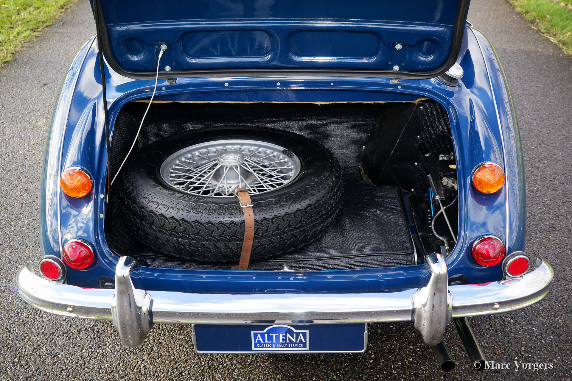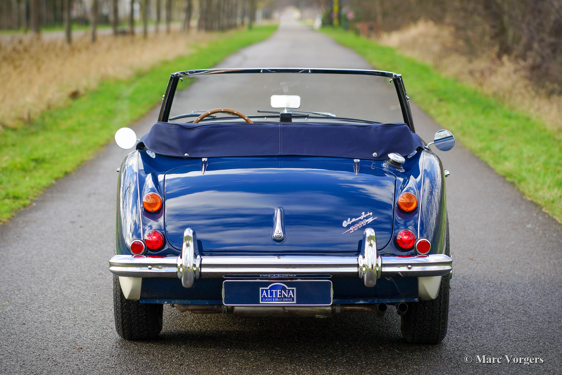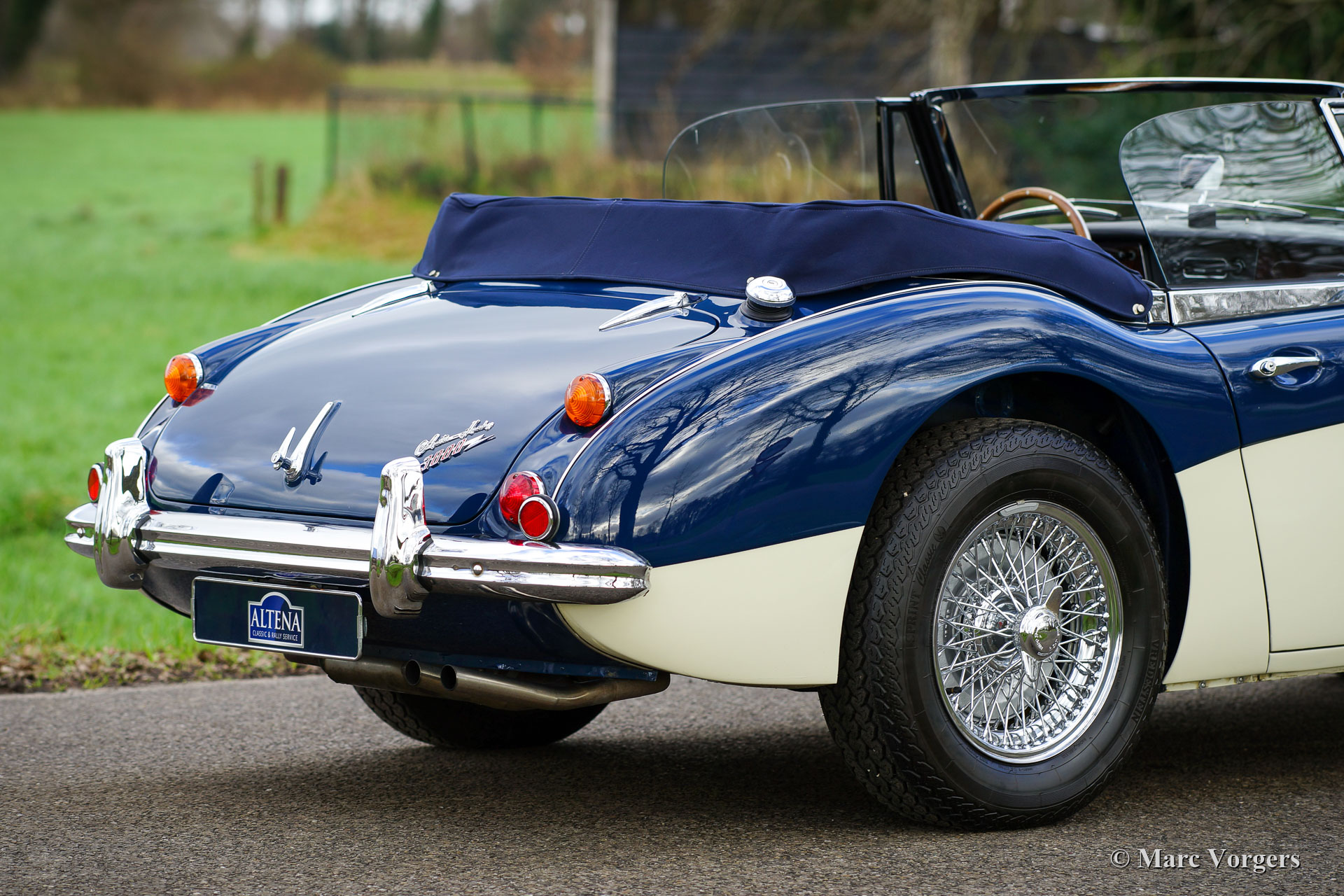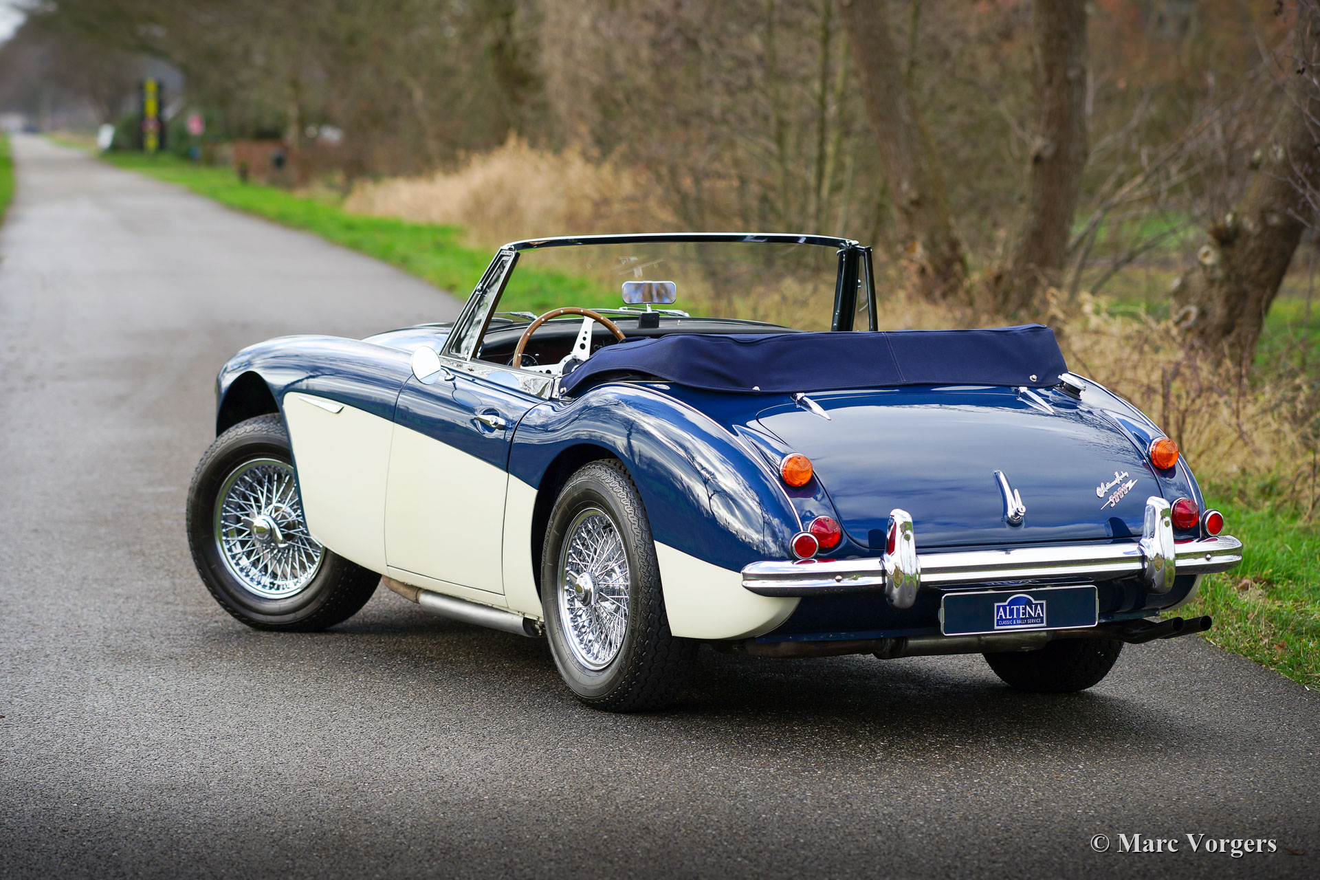Austin Healey 3000 Mk III Phase 2, année 1967. Couleur Bleu foncé (bleu basilique) sur blanc crème (une palette de couleurs Healey rare et originale) combinée avec un intérieur en cuir bleu foncé et un tapis bleu foncé. Capote bleue et un couvercle tonneau en mohair bleu. Ce fantastique « Big Healey » a été vendue neuve dans l’Illinois (États-Unis) en 1967. En 1988, la voiture a été expédiée aux Pays-Bas. En 1999, le Healey fut acheté par Altena Classic Service pour être entièrement restauré pour un client. Au cours de la période 1999-2001, l'Austin Healey fut restauré détaillée à l'état concours. Les coûts et les efforts n'ont pas été épargnés dans le processus ; tout a été restauré, révisé et / ou renouvelé. Un dossier contenant toutes les factures, le rapport de restauration photographique et les documents historiques est présent. Ce fantastique Austin Healey a été très bien entretenu au fil des ans ; cette Healey est en superbe état de TOP ! La voiture est équipée d’une surmultiplié « overdrive », roues à rayons chromés à 72 rayons, de pneus Vredestein Classic Sprint 185/15, d'un échappement en acier inoxydable et d'une barre de badge chromée avec deux projecteurs longue portée Lucas SLR576. Le titre américain d'origine et les documents d'importation sont présents ; cet Austin Healey peut être importé dans n'importe quel pays du monde ! Ce « Big Healey » roule et pilote parfaitement ; Un exemple de première classe !