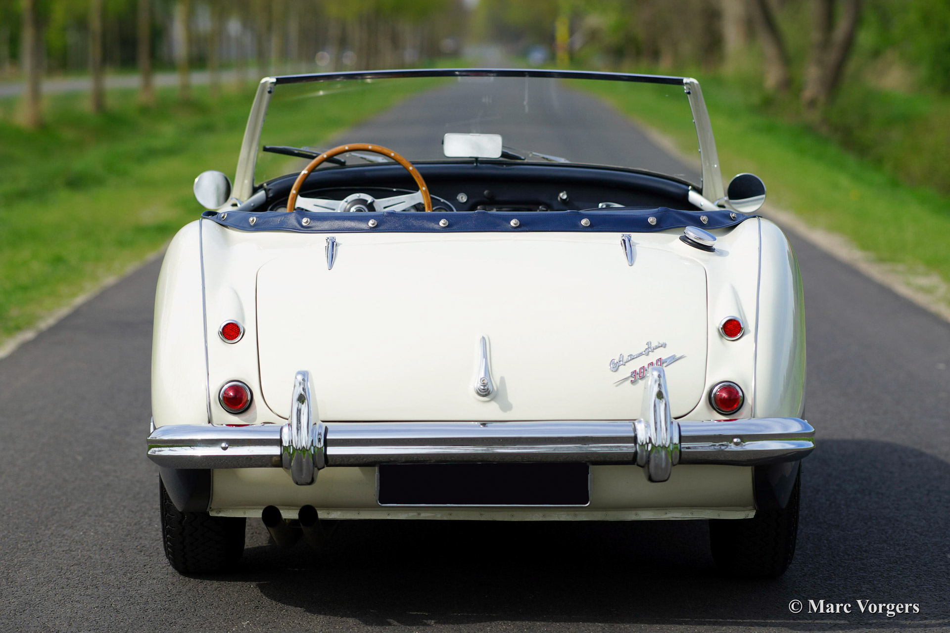 Austin Healey 3000 Mk II, year 1962. Colour crème white over dark blue. Blue leather interior and a blue tonneau cover.