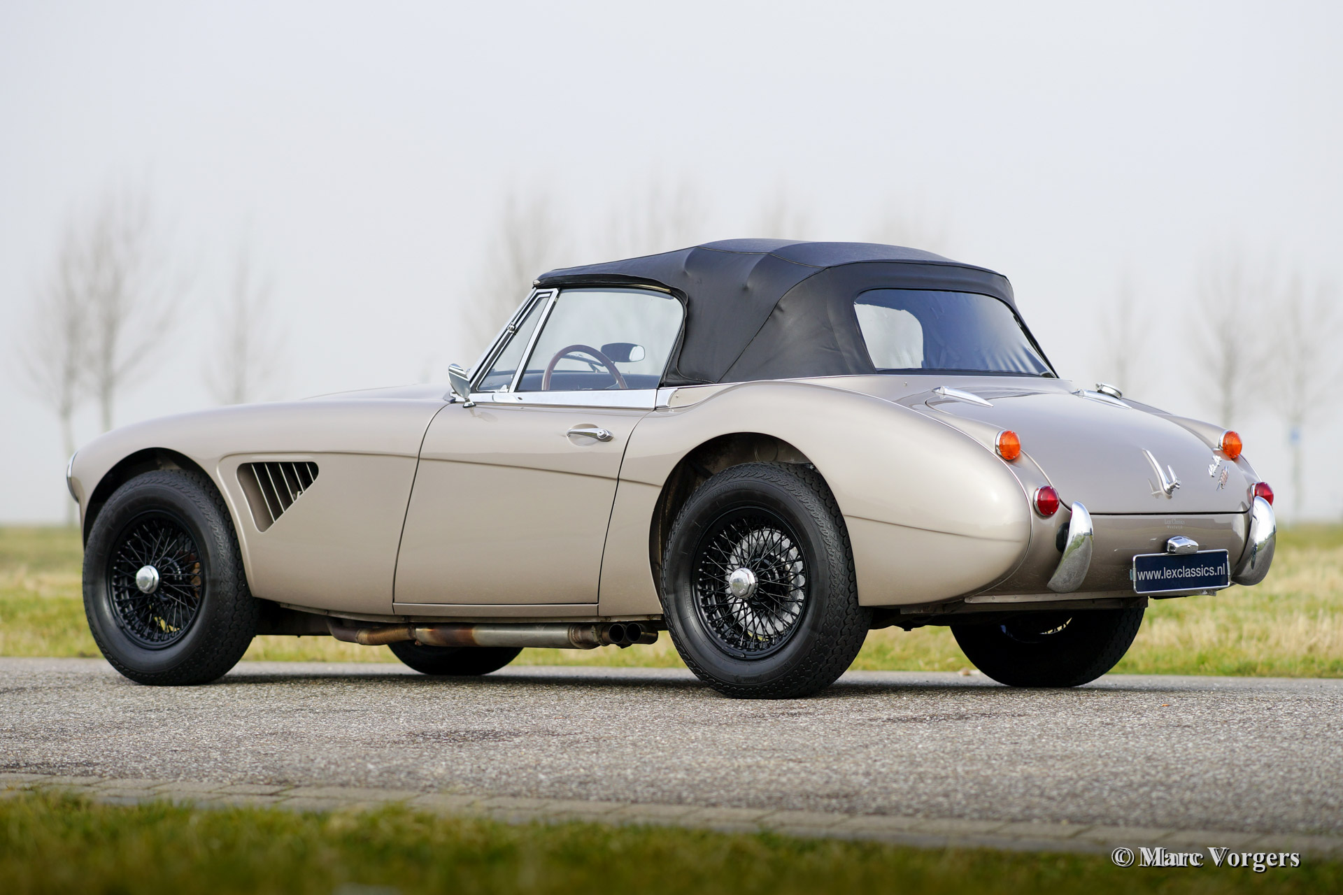 Austin Healey 3000 Mk III phase 2, 1968. Couleur metallic 'Golden Beige'. Intérieur en cuir noir. Soft top colour noir, roues de fil émaillé noir. Ce fantastique Healey a été 'restauré ‘body off’. L'automobile est en superbe etat! Cette voiture vient du dernier lot de 553 Austin Healey construit. Ces voitures ont été peints en couleur metallic 'Golden Beige’.