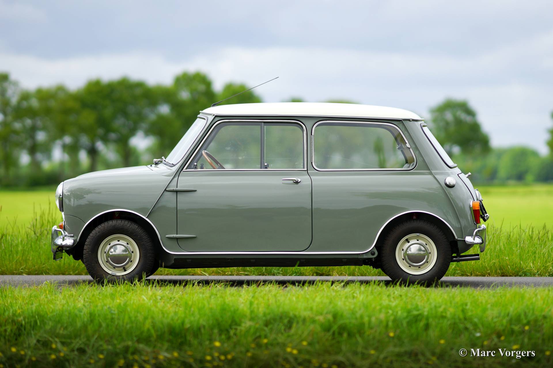 The Morris Mini saw the light of day in the year 1959. The Mini was designed by Sir Alec Issigonis (who also designed the Morris Minor) and is considered to be one of the greatest concepts in motorcar history. The Mini is a front wheel drive car; that was not new those days, but the transverse-engine packaging was. The Mini is a very small car, only 305 cm. long (the VW Beetle is 100 cm. longer!), but the interior offers lots of space, enough for four persons, because of the clever concept. The Mini is equipped with a unique "hydrolastic" suspension and the Mini's wheels are located at the outer corners of the car giving the Mini tremendous road-holding; like a go-cart.