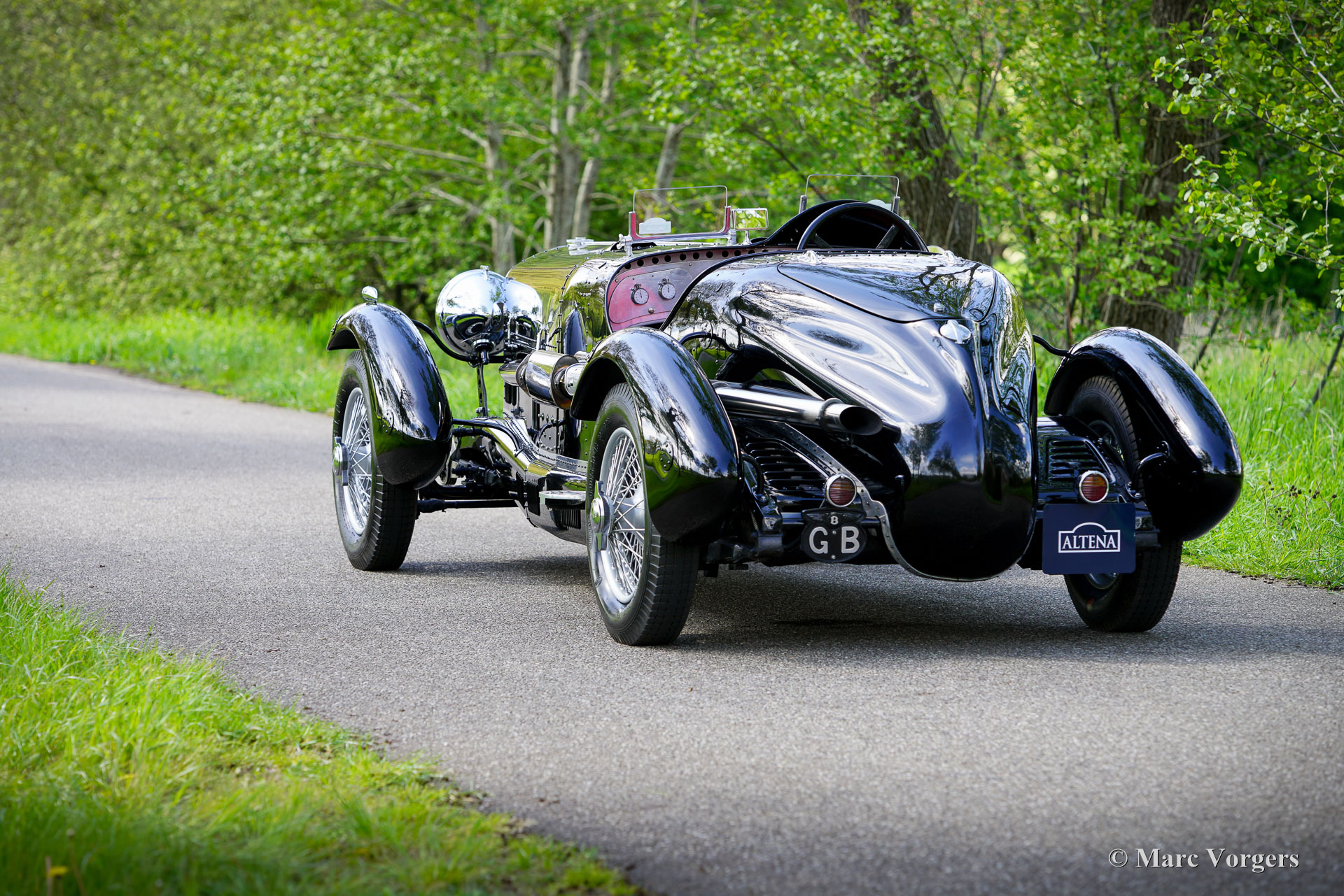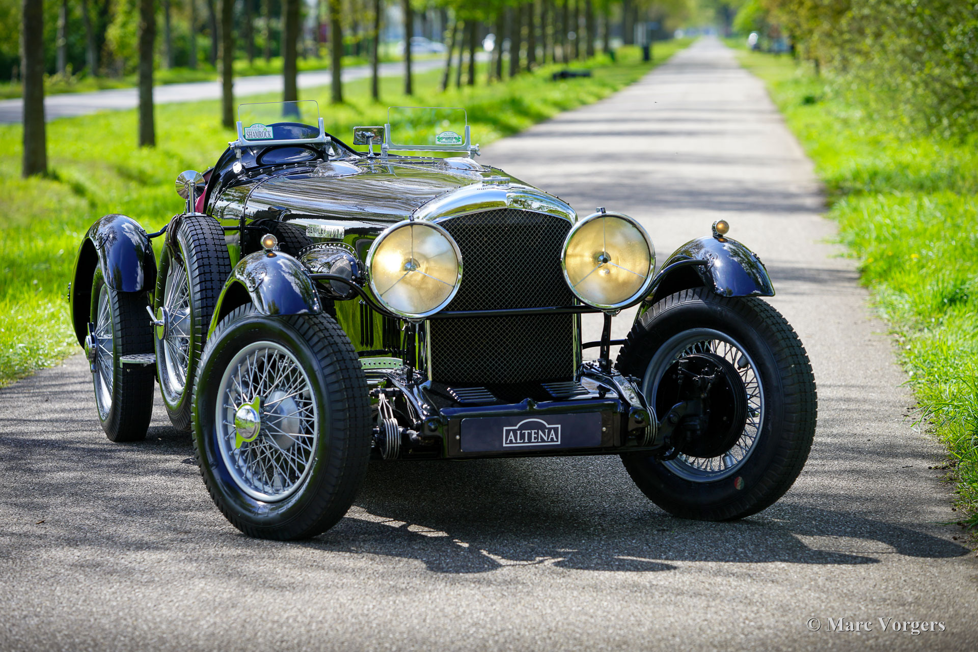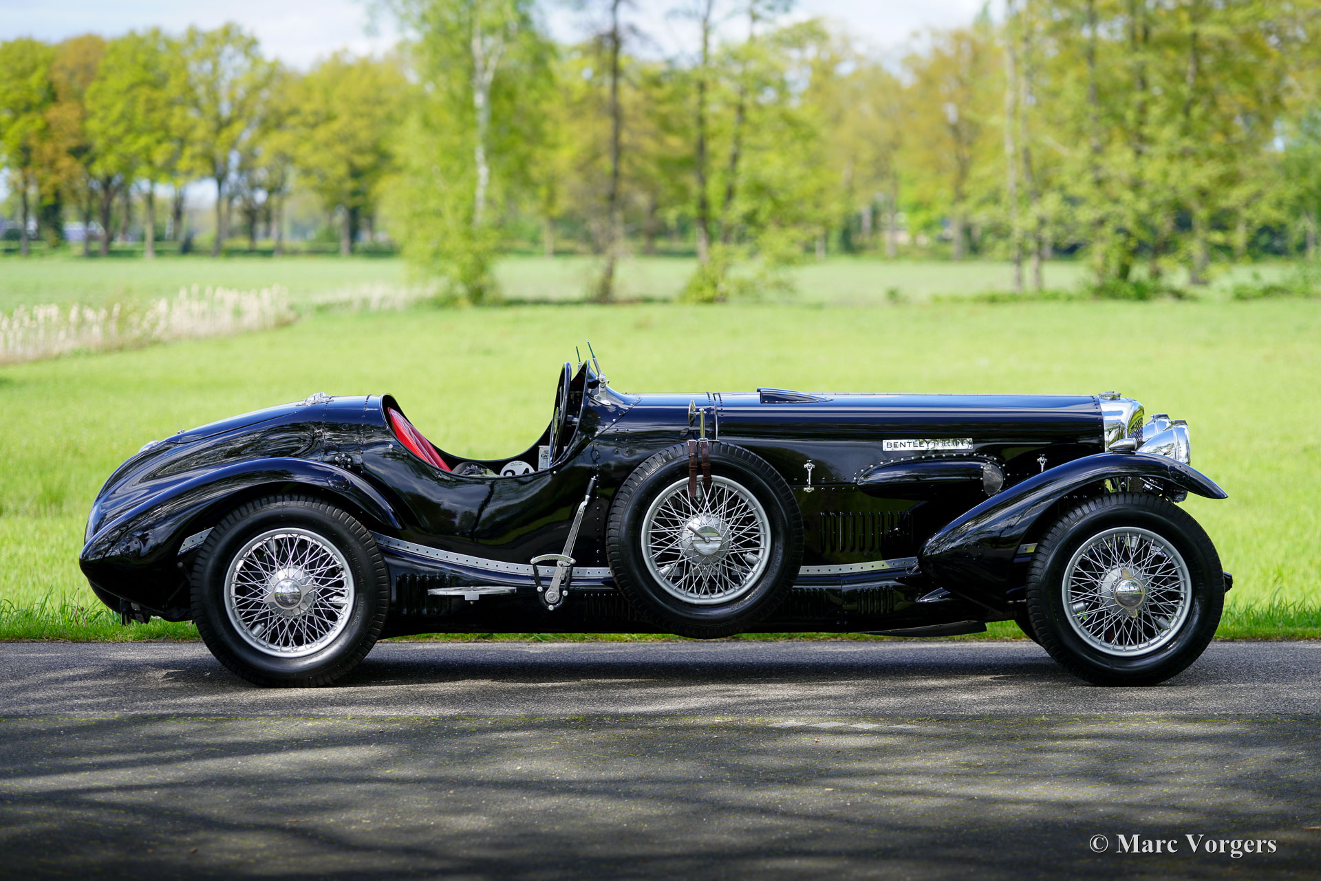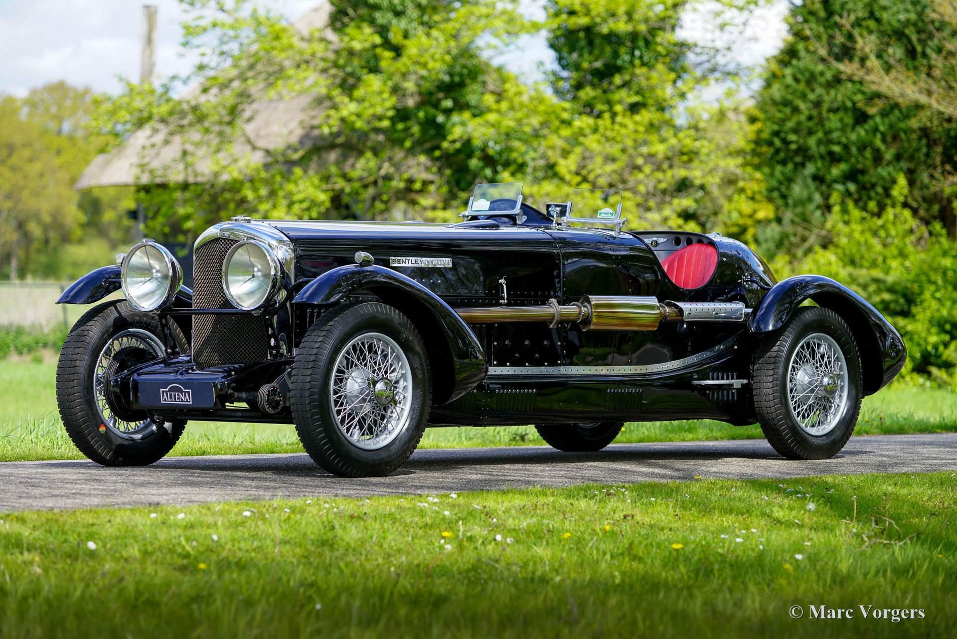 Bentley 3 ½ litres « Bologna » Special, année 1934. Couleur noire combinée à un intérieur noir équipé de sièges baquets en cuir rouge. Capote et couvre-capote en mohair noir. Cette voiture Bentley fut construite à l'origine dans l'usine Bentley « Derby » et vendue neuve au Royaume-Uni. Le châssis et le moteur sont toujours identiques à ceux d'origine de l'usine. Dans le passé, l'ancienne carrosserie était retirée et remplacée par l'actuelle carrosserie biplace spéciale « Bologna » avec une longueur de capot très impressionnante et ultra longue. La conversion fut exécutée par un spécialiste au Royaume-Uni, des photos de la restauration et de la modification sont présentes dans le vaste dossier historique.