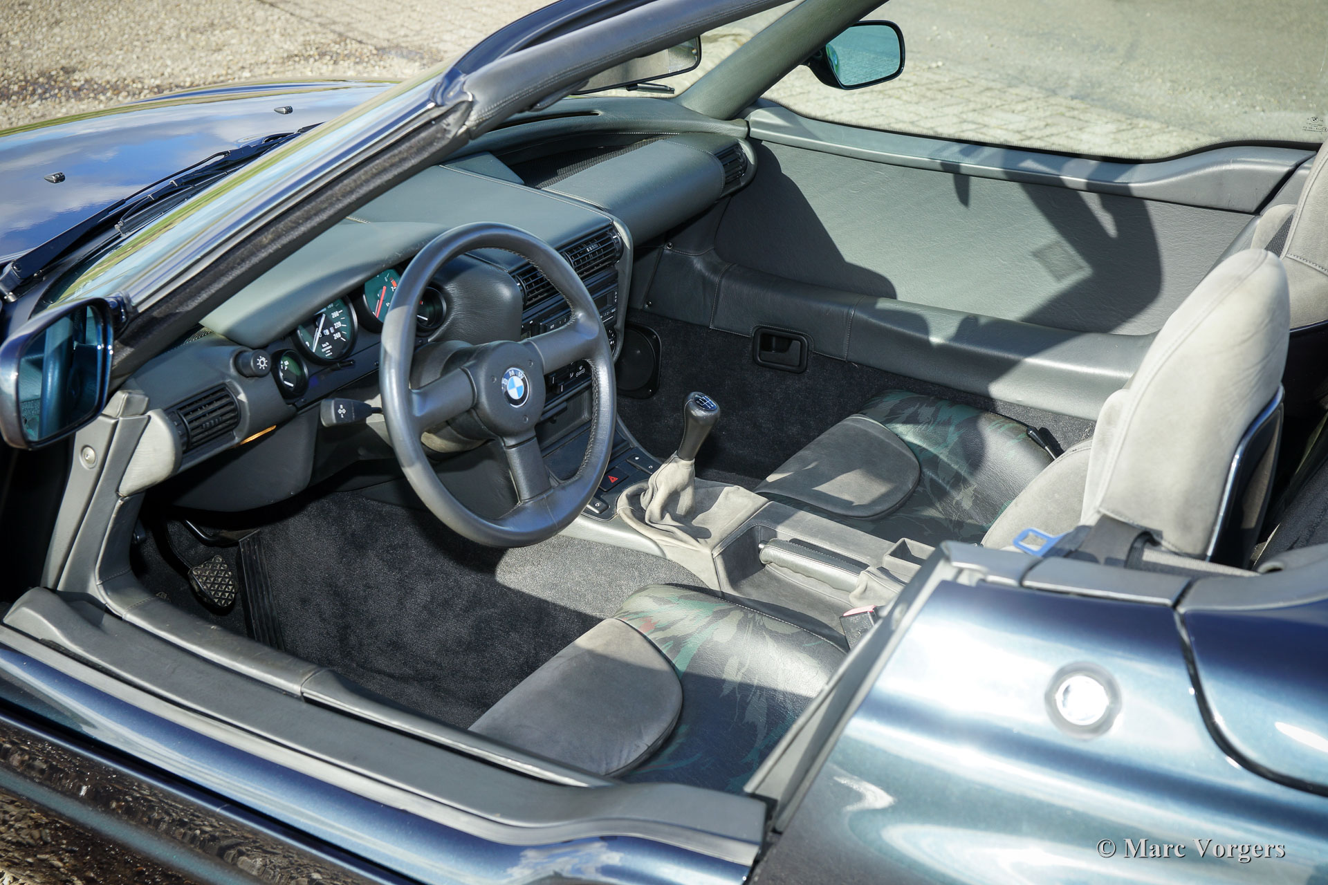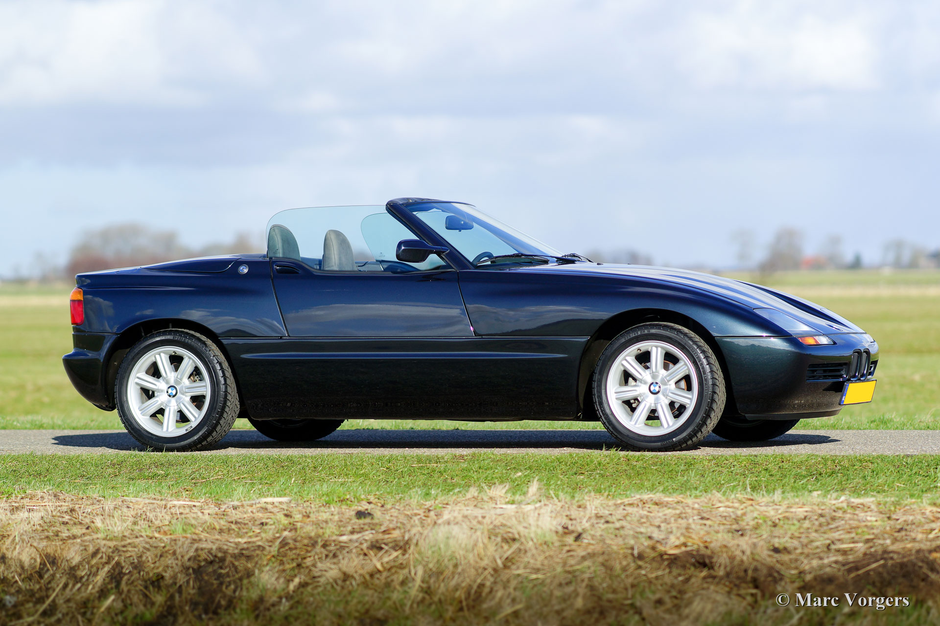 The BMW Z1 was presented at the Frankfurter Auto Show in the year 1987. BMW planned to build 4000 Z1 cars. Before start of the production they had already received 5000 signed orders from customers. BMW decided to build more Z1's and between 1987 and 1991 8000 cars were built. The BMW Z1 was developed under supervision of Dr. Ulrich Bez and the car was designed by the Dutch automotive designer Harm Lagaay. The Z1 was mechanically based upon the BMW 3 series (E30) 325i. The special chassis was constructed of steel with composite floor panels. For the rear wheel suspension a new 'multilink' construction was developed. The bodywork, with electric up and down sliding doors was manufactured of thermoplastic material (General Electric XENOY thermoplast). The body was fitted with an integrated roll over bar. The 'Z' of BMW Z1 stands for 'Zukunft', the German word for 'future'. Considering the innovative character of the construction certainly true. Regarding the concept the Z1 is a pure classic roadster as only the British could build them in the 1950'ies and 1960'ies. See the long bonnet, the six cylinder in line engine at front, rear wheel drive, seats just in front of the rear wheels and a soft top fully retracting within the bodywork. All these ingredients guarantee maximal driving fun with a playful 'tail' and a magnificent exhaust sound. The BMW Z1 feels very compact and robust, you can really become one with the car. The Z1 can be driven with the sliding doors opened or closed. In the USA however driving with the doors down is not allowed!