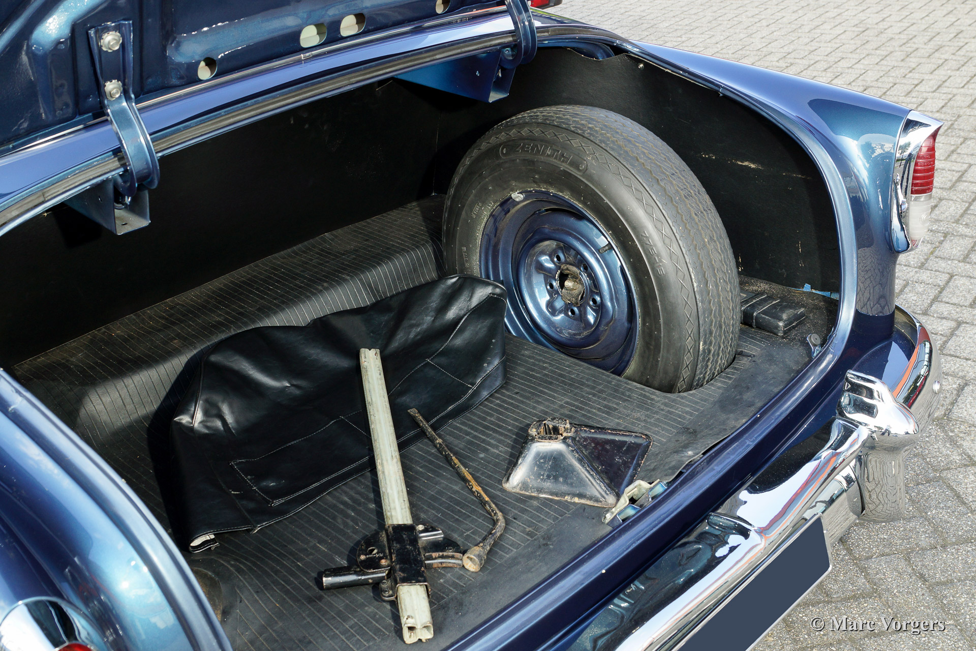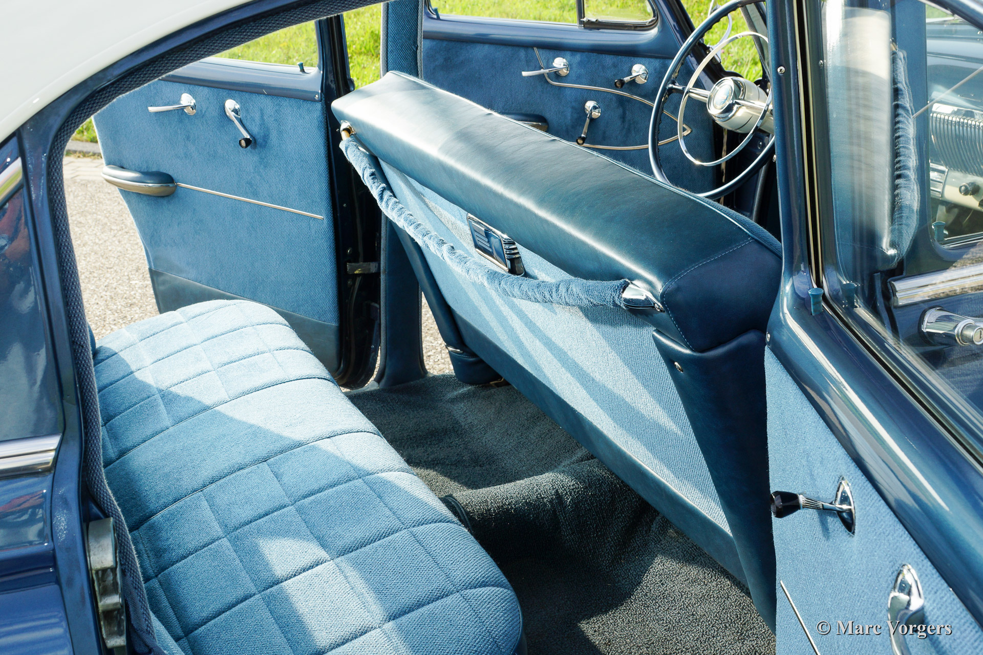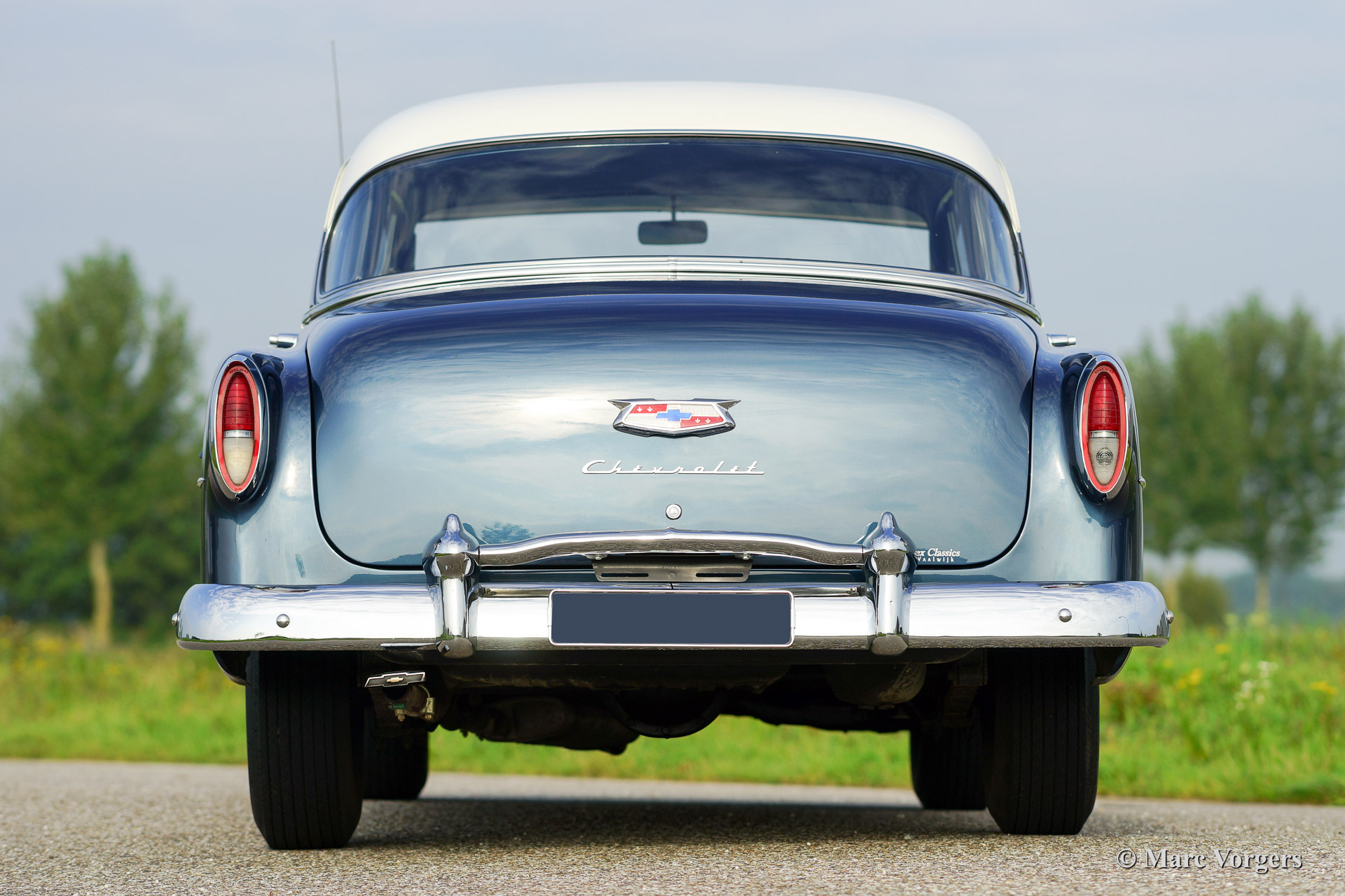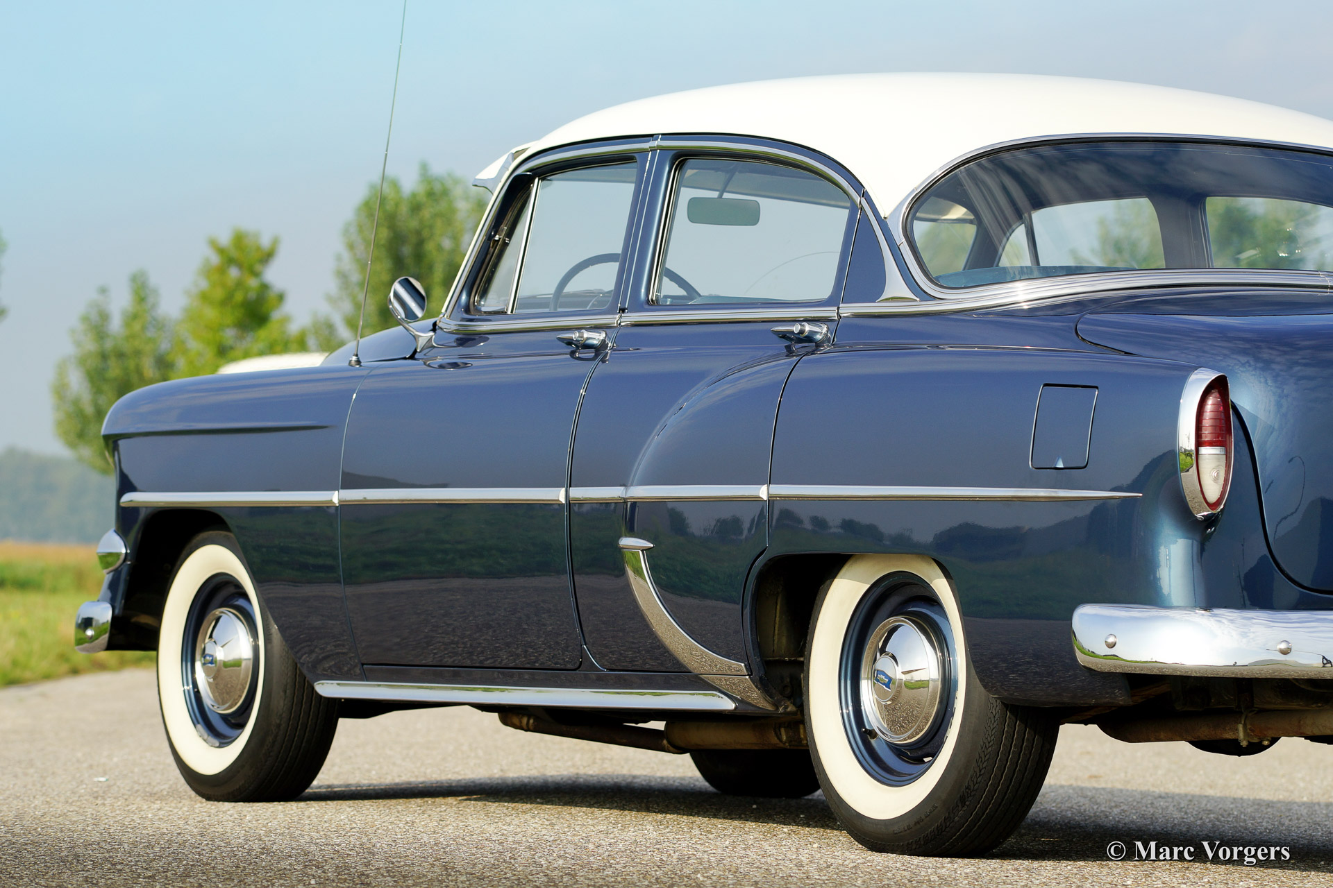 Chevrolet 210 sedan, year 1954. Chassis number 0795467FXXX. Colour blue metallic with a white roof top. blue cloth interior. This beautiful Chevrolet was extensively restored in the Netherlands. The automobile is in superb (excellent+) condition! This Chevrolet drives very comfortably, the car sports a smooth six cylinder engine and a manual 3-speed gearbox with steering column shift. This Chevrolet is fitted with a special sun shade above the windscreen, a period radio and tires with white side walls. A photo reportage of the restoration is present.