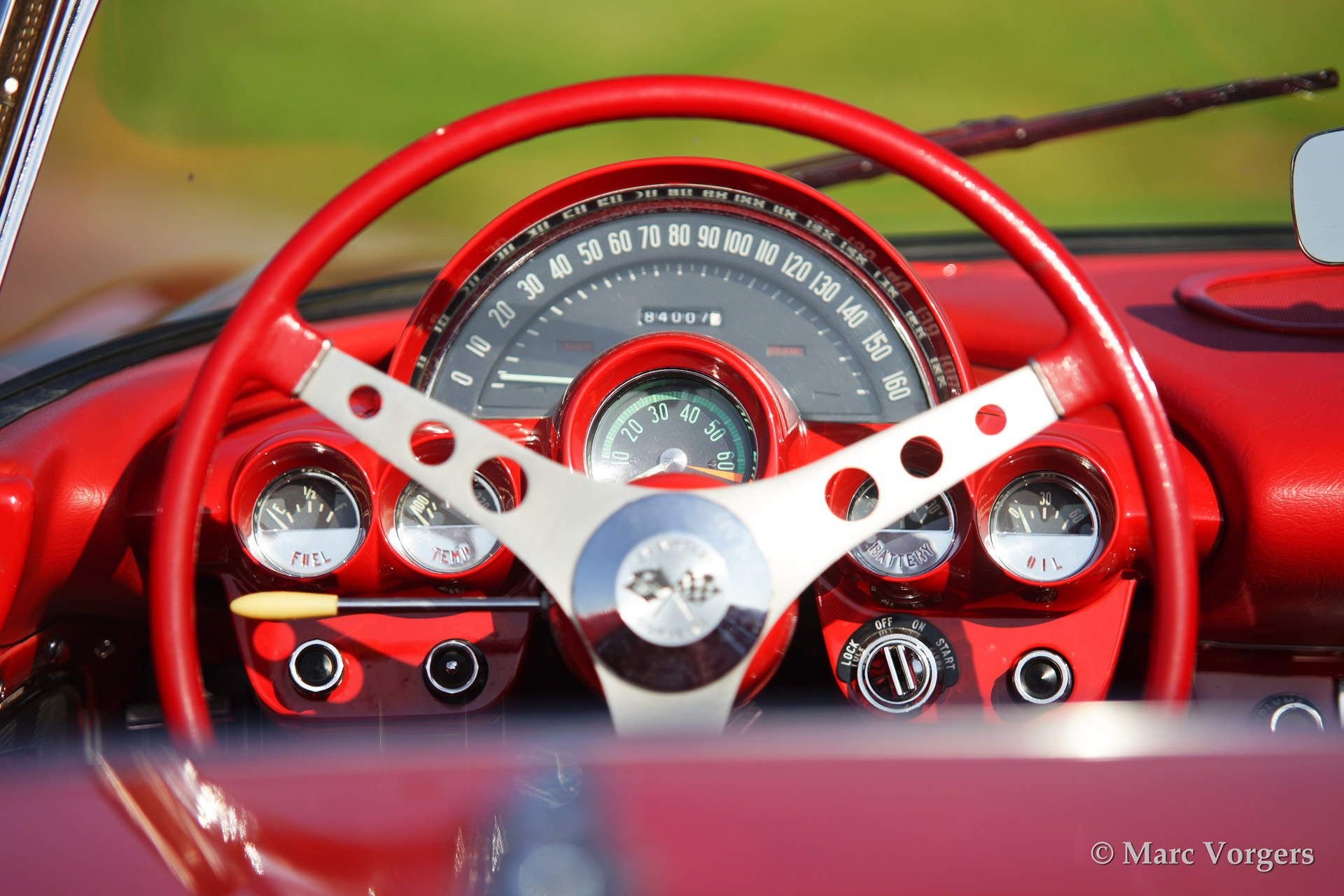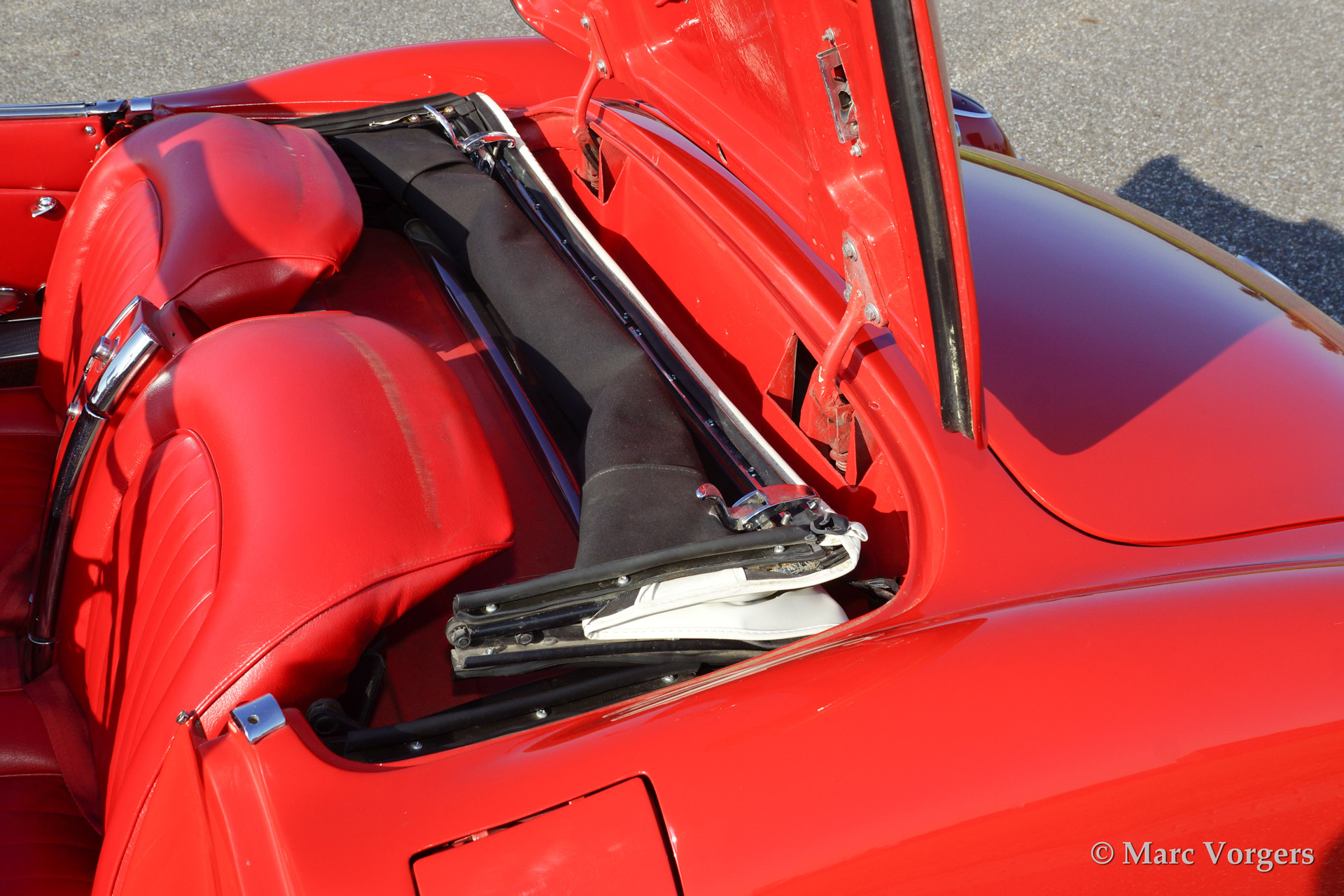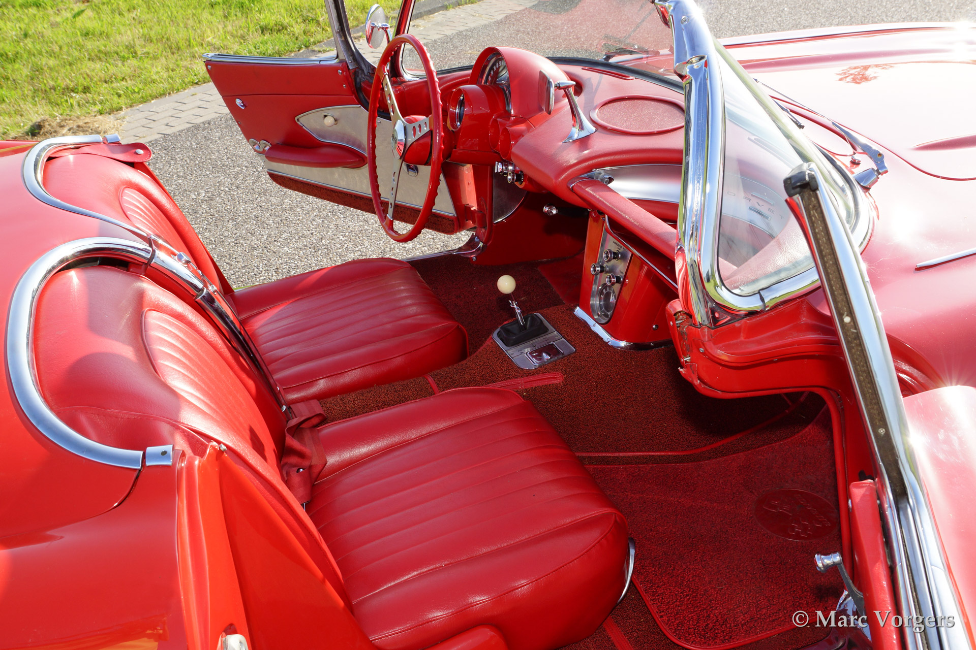 Chevrolet Corvette C1, year 1960. Colour red with white coves. Red interior and a white soft top. The car features the sought after 4- speed manual gearbox.