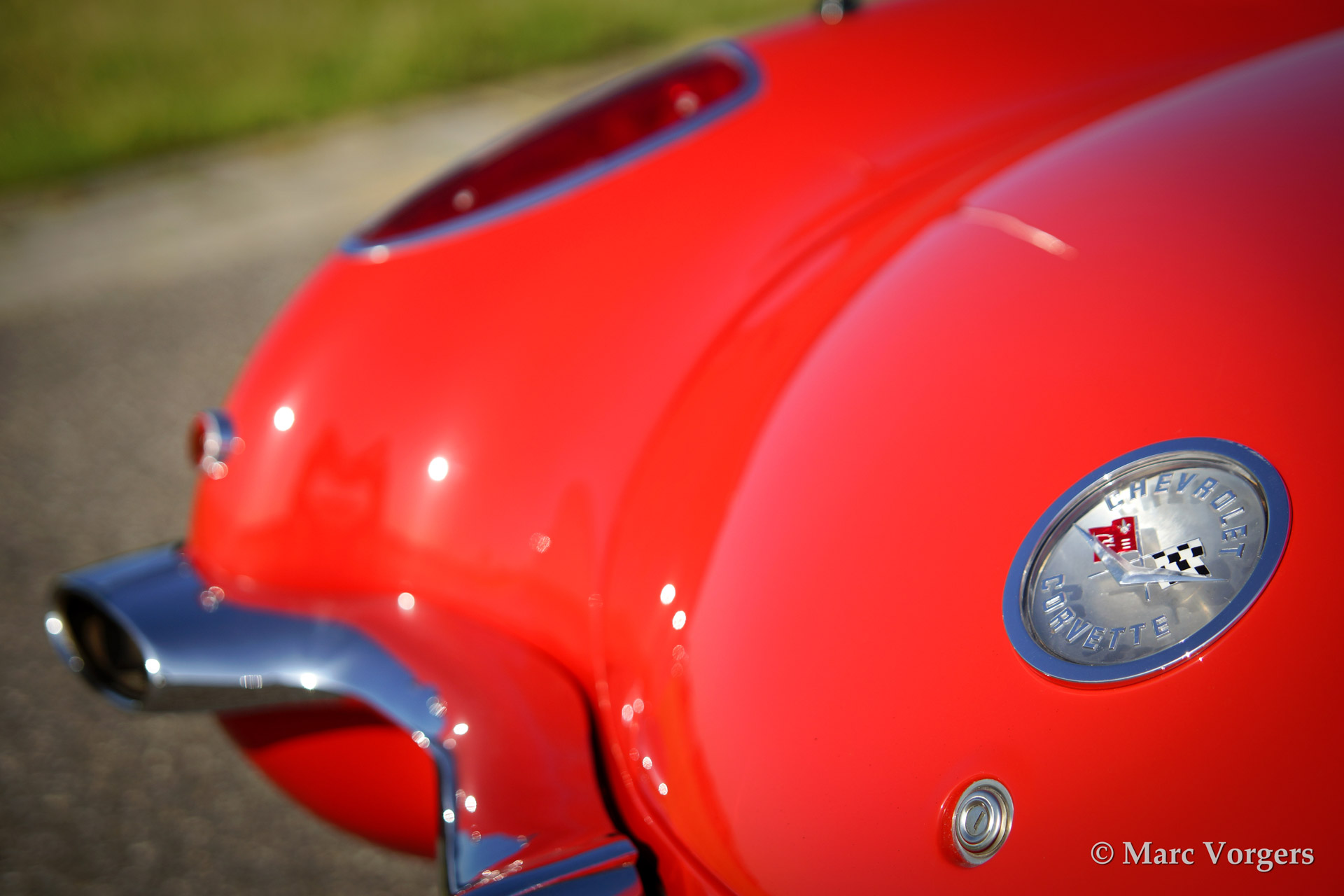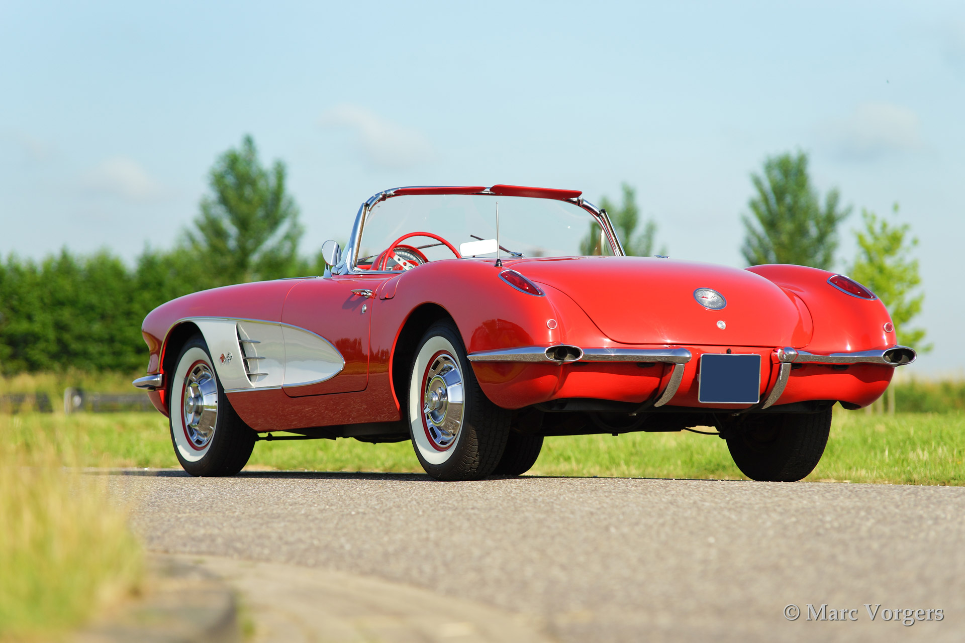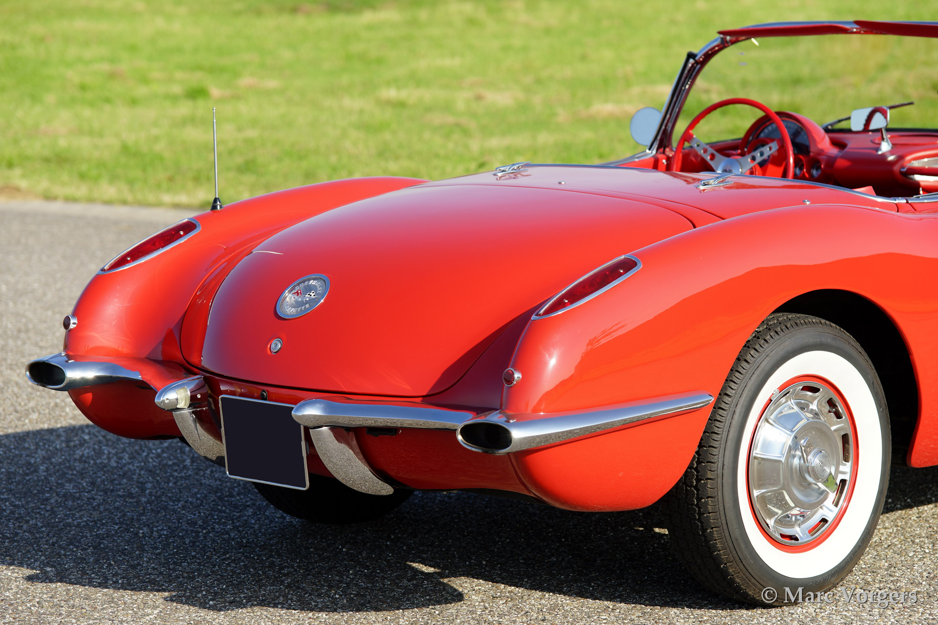 Chevrolet Corvette C1, year 1960. Colour red with white coves. Red interior and a white soft top. The car features the sought after 4- speed manual gearbox.