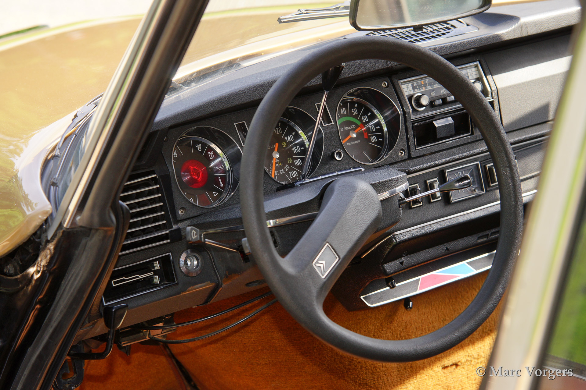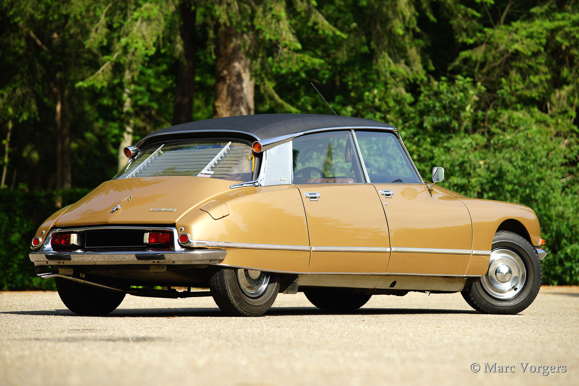 Citroen DS 23 Pallas, year 1974. Colour bronze metallic with a black vinyl roof top. Brown full leather interior and brown carpet. This fabulous Citroen DS 23 is a genuine Pallas featuring the magnificent round gauges and a semi-automatic gearbox. This DS shows all original details.