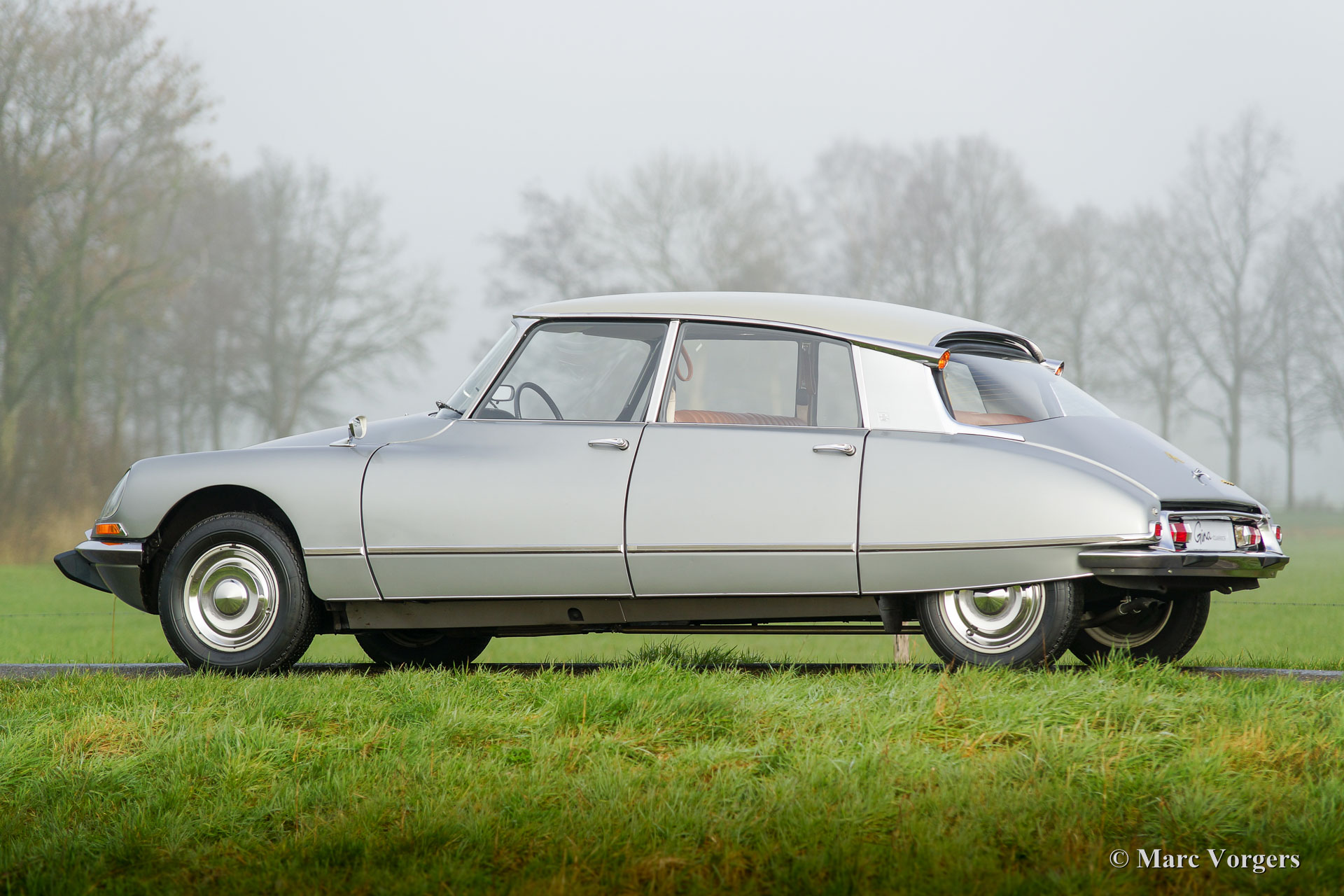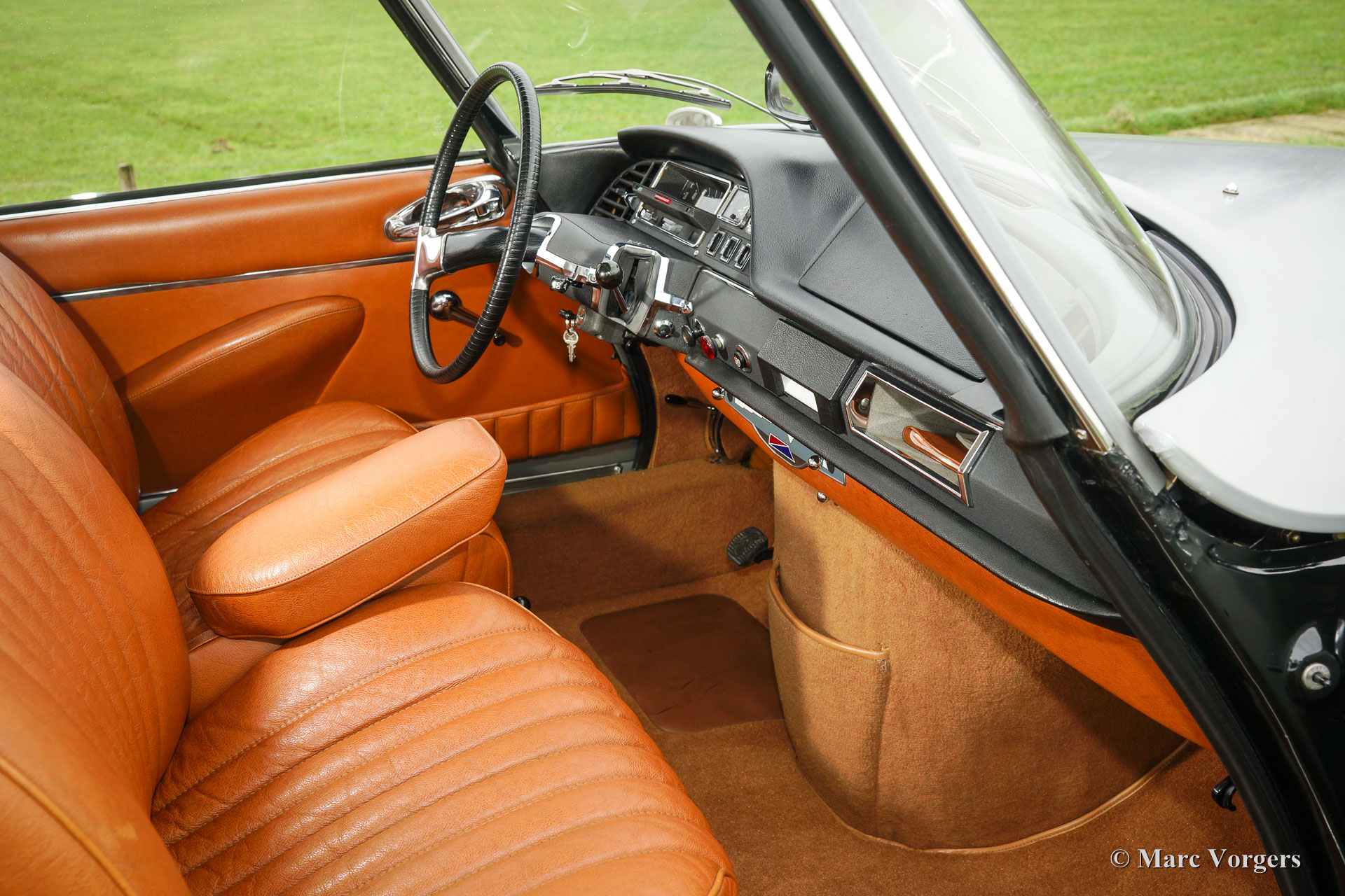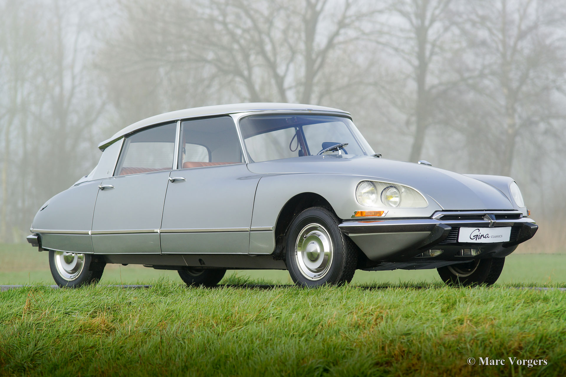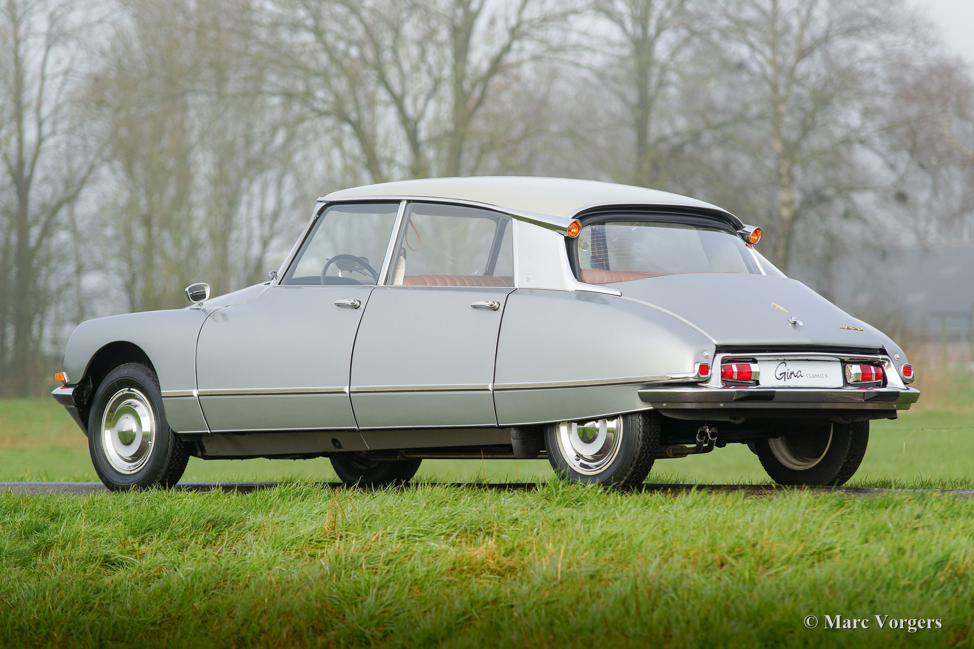 Citroën DS20 Pallas, année 1969. Couleur Gris-Nacré (métallique) avec un intérieur cuir cognac brun et moquette marron clair.