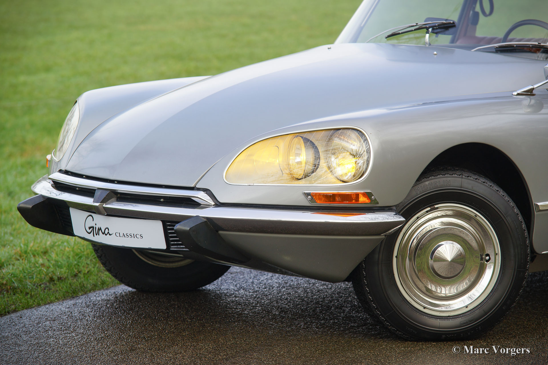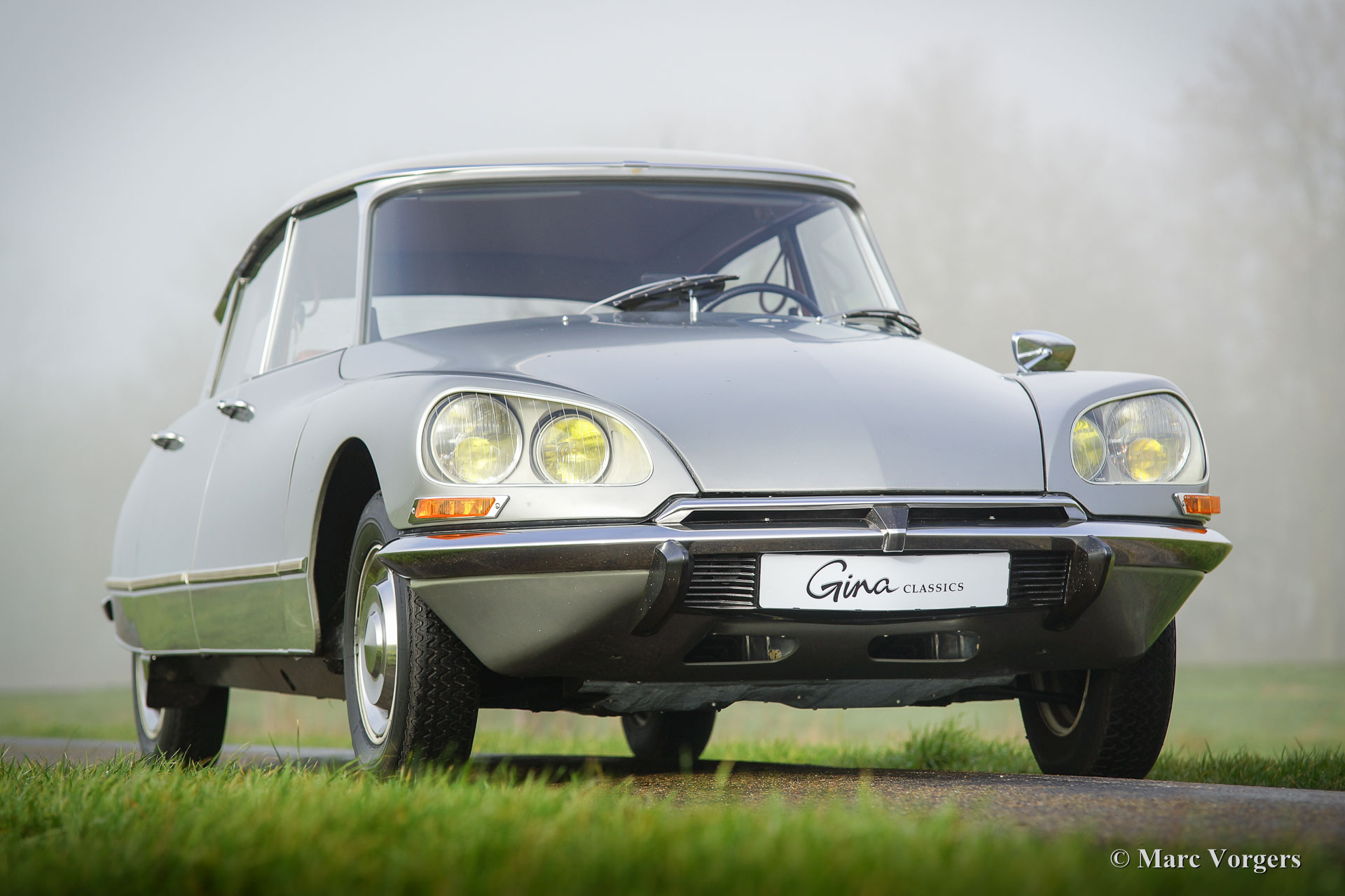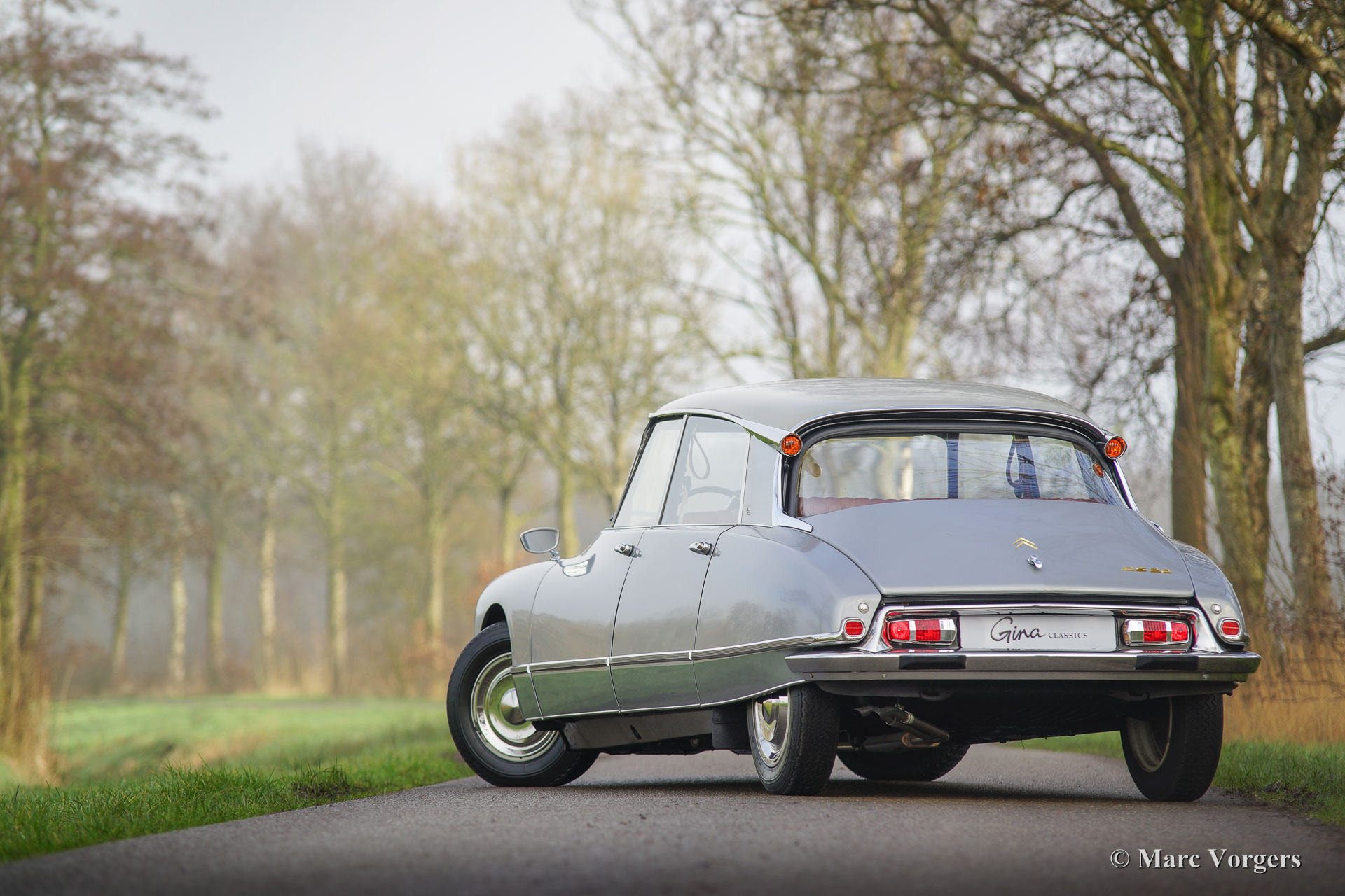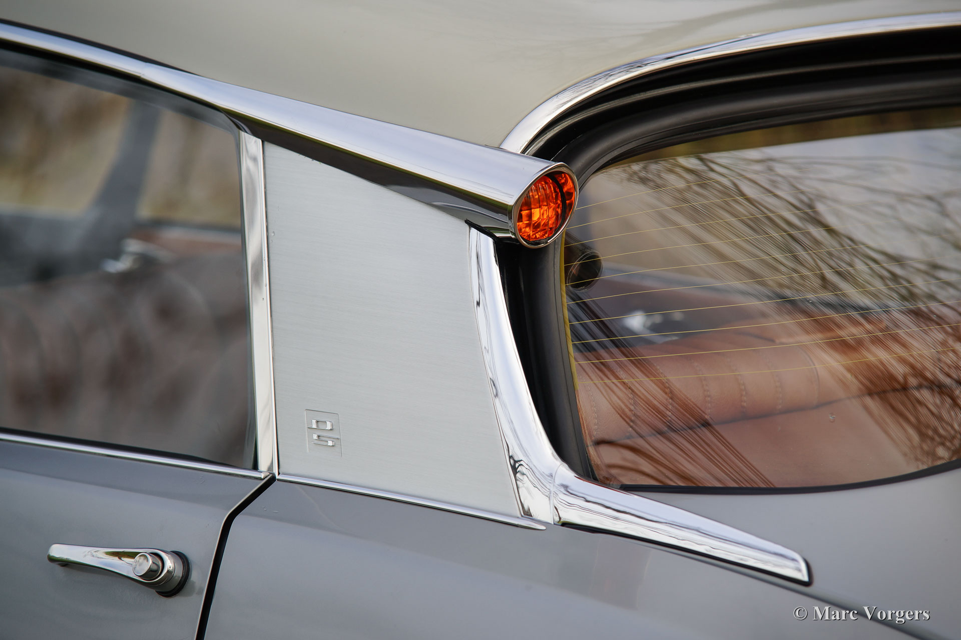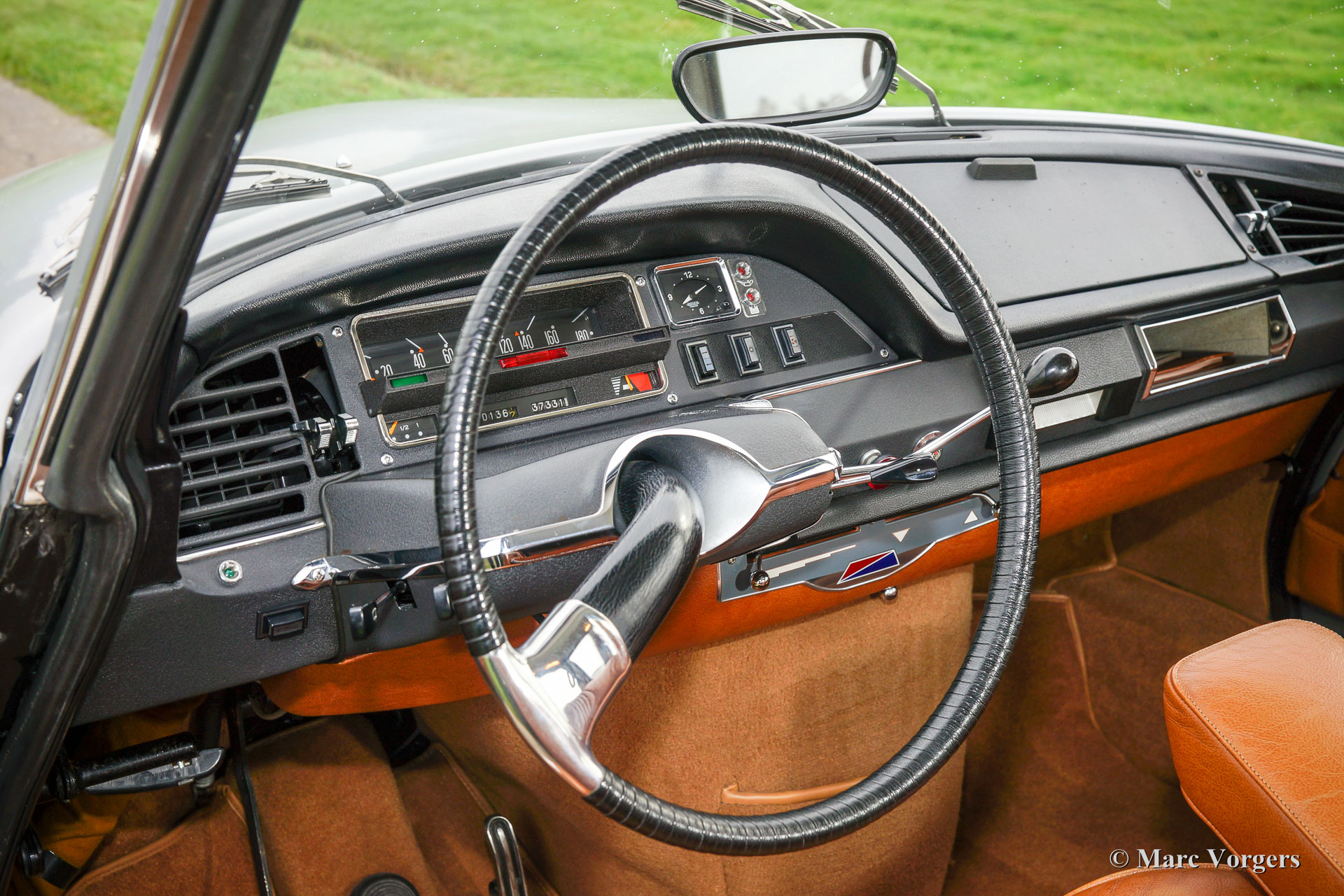 Citroën DS20 Pallas, année 1969. Couleur Gris-Nacré (métallique) avec un intérieur cuir cognac brun et moquette marron clair.