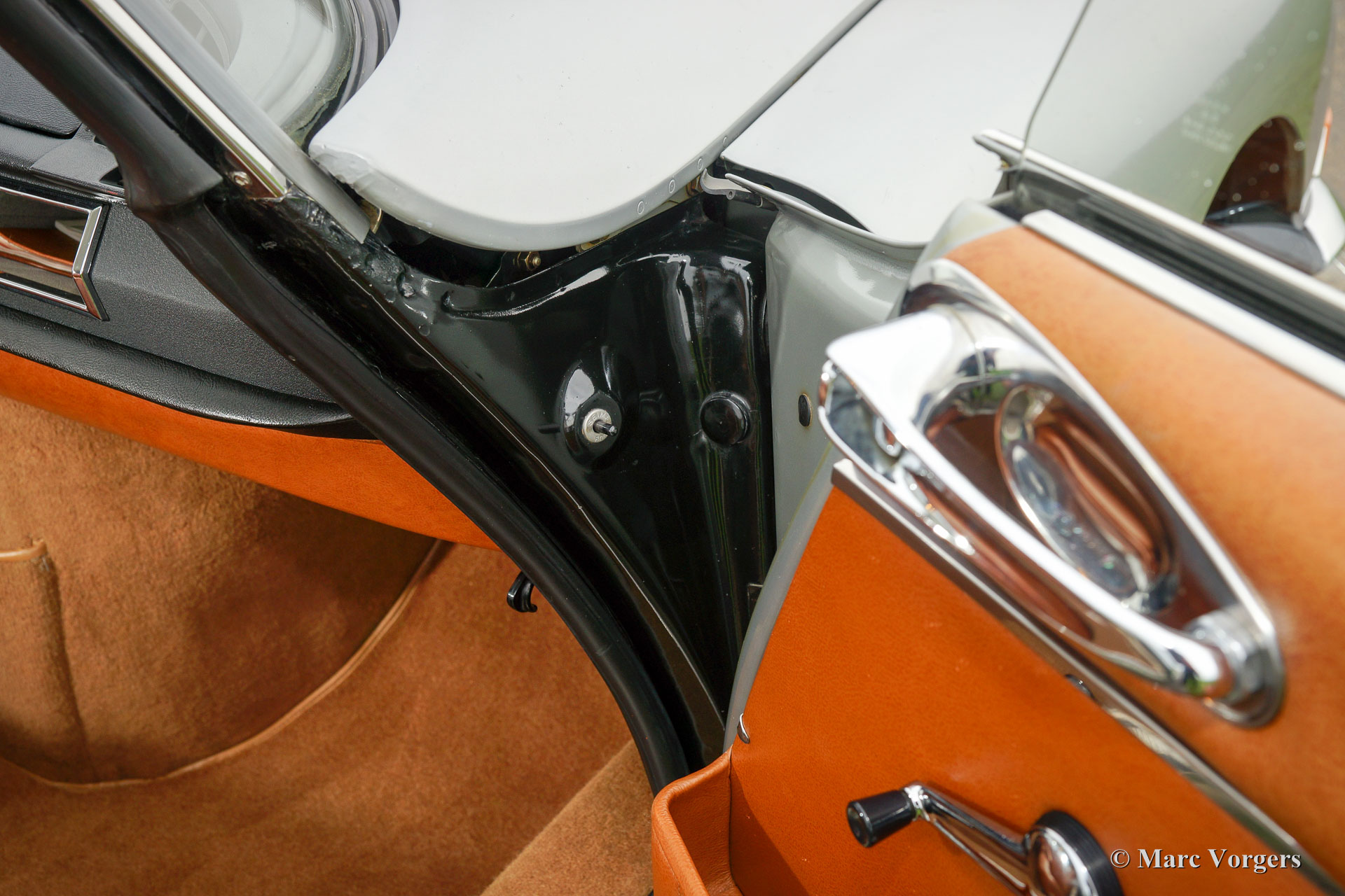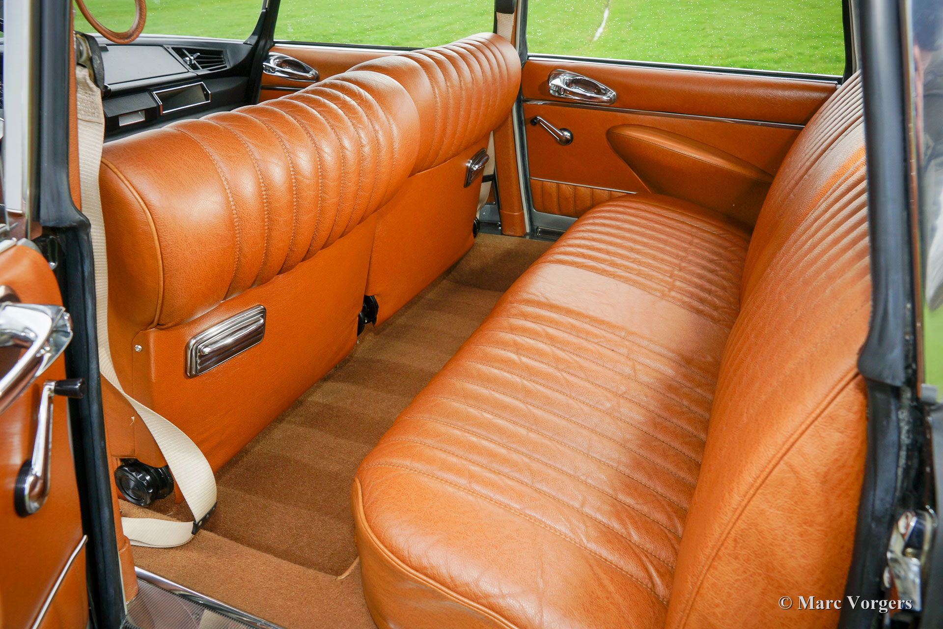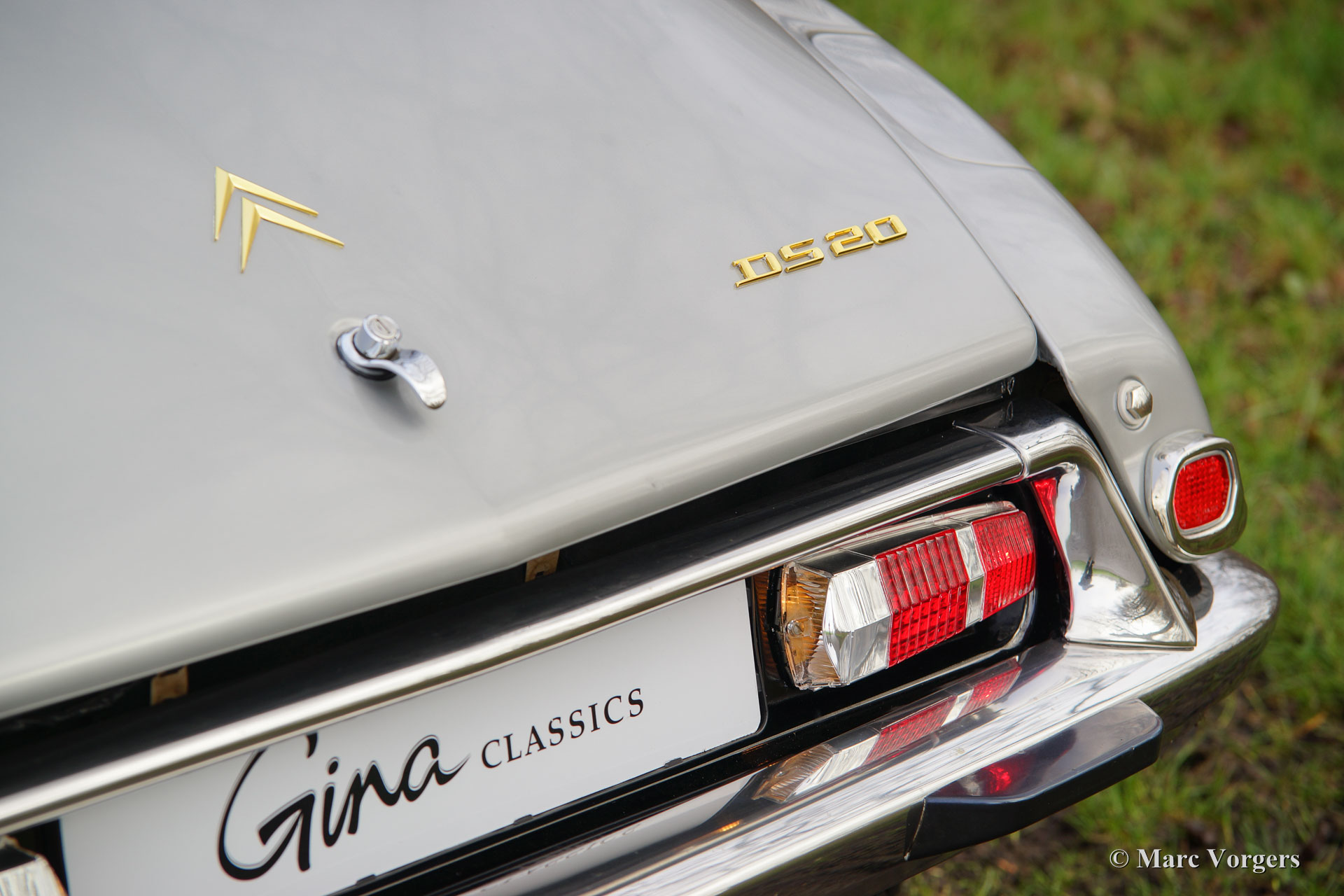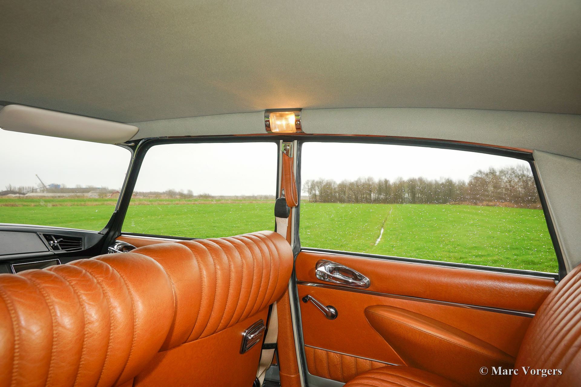 Citroën DS20 Pallas, année 1969. Couleur Gris-Nacré (métallique) avec un intérieur cuir cognac brun et moquette marron clair.