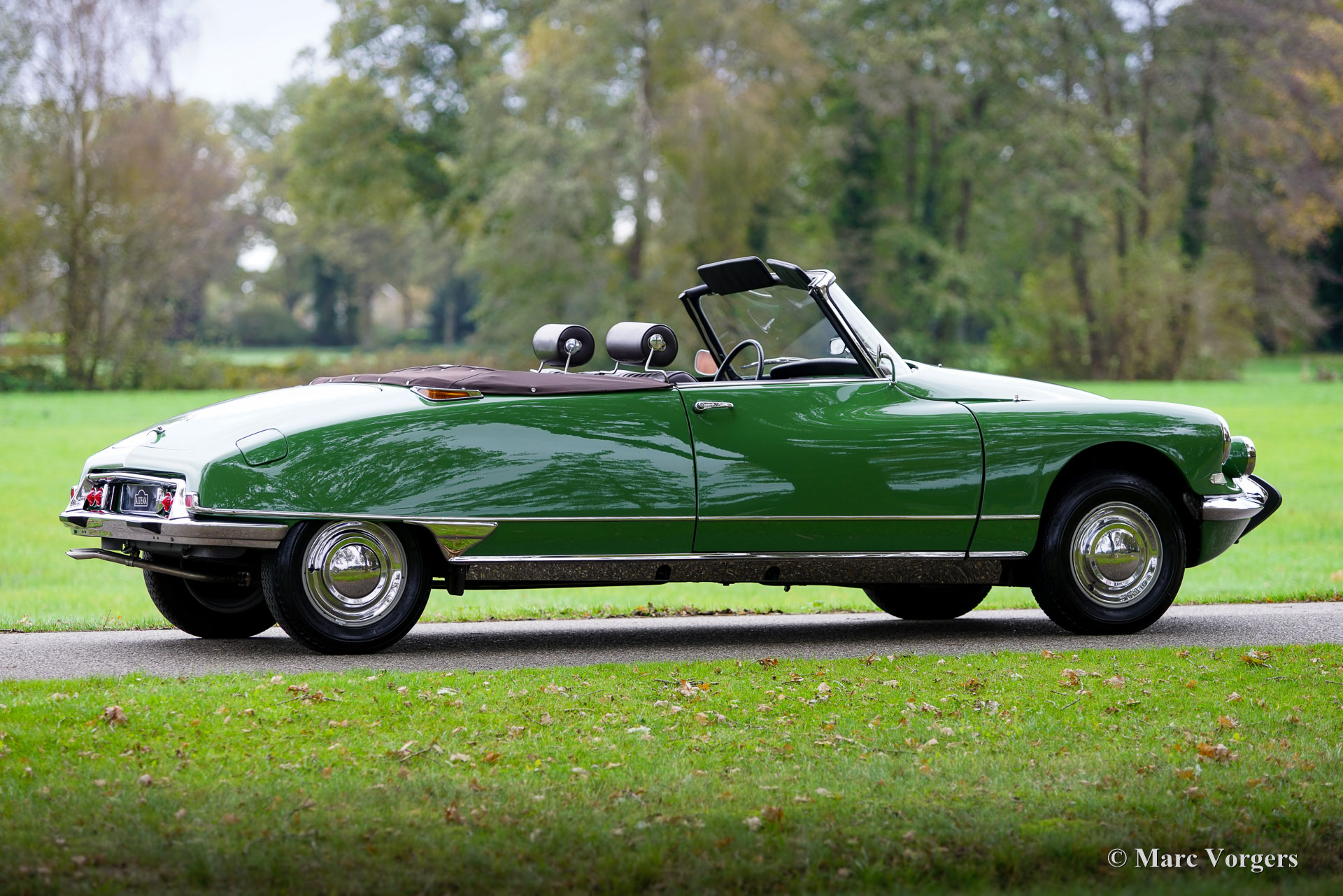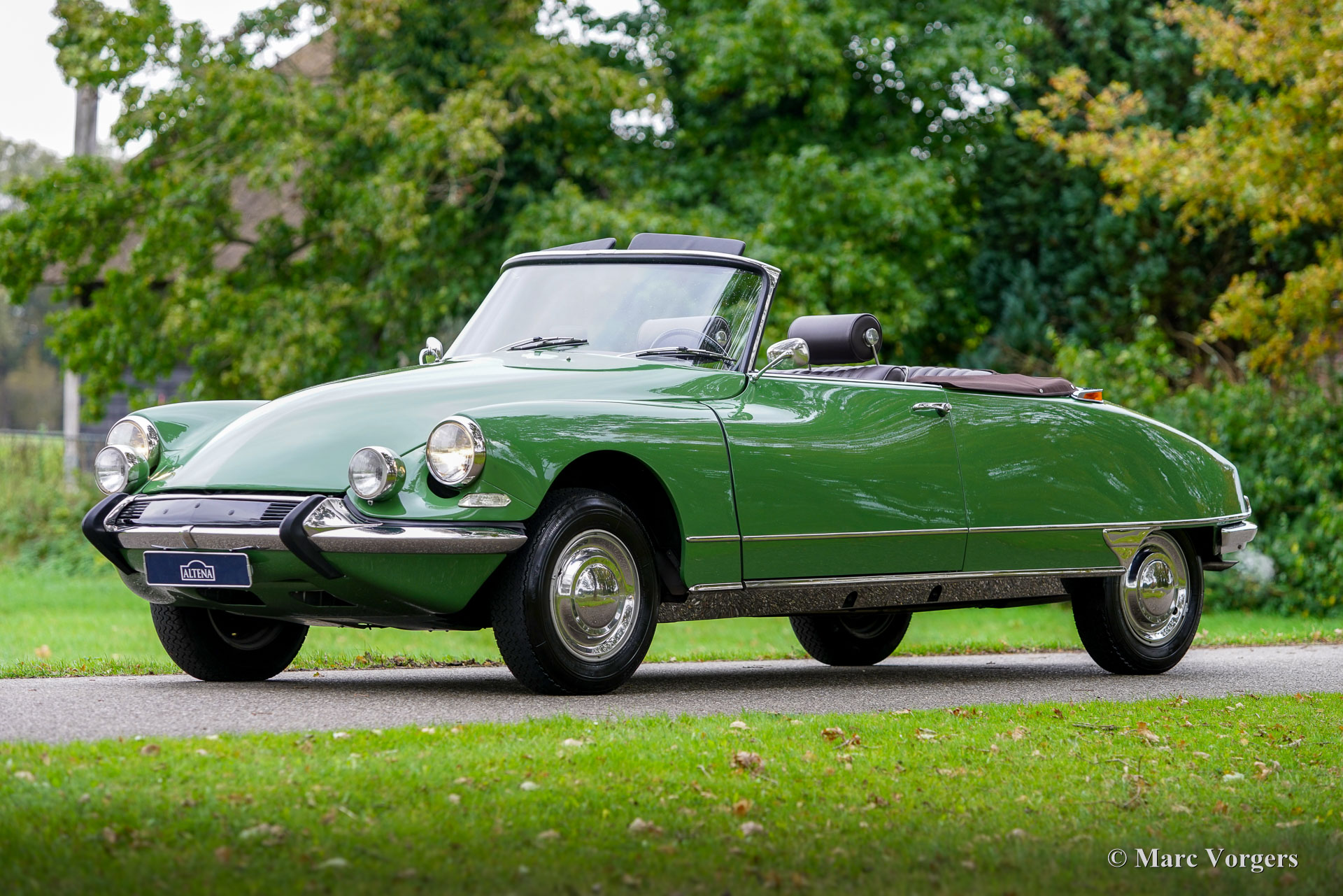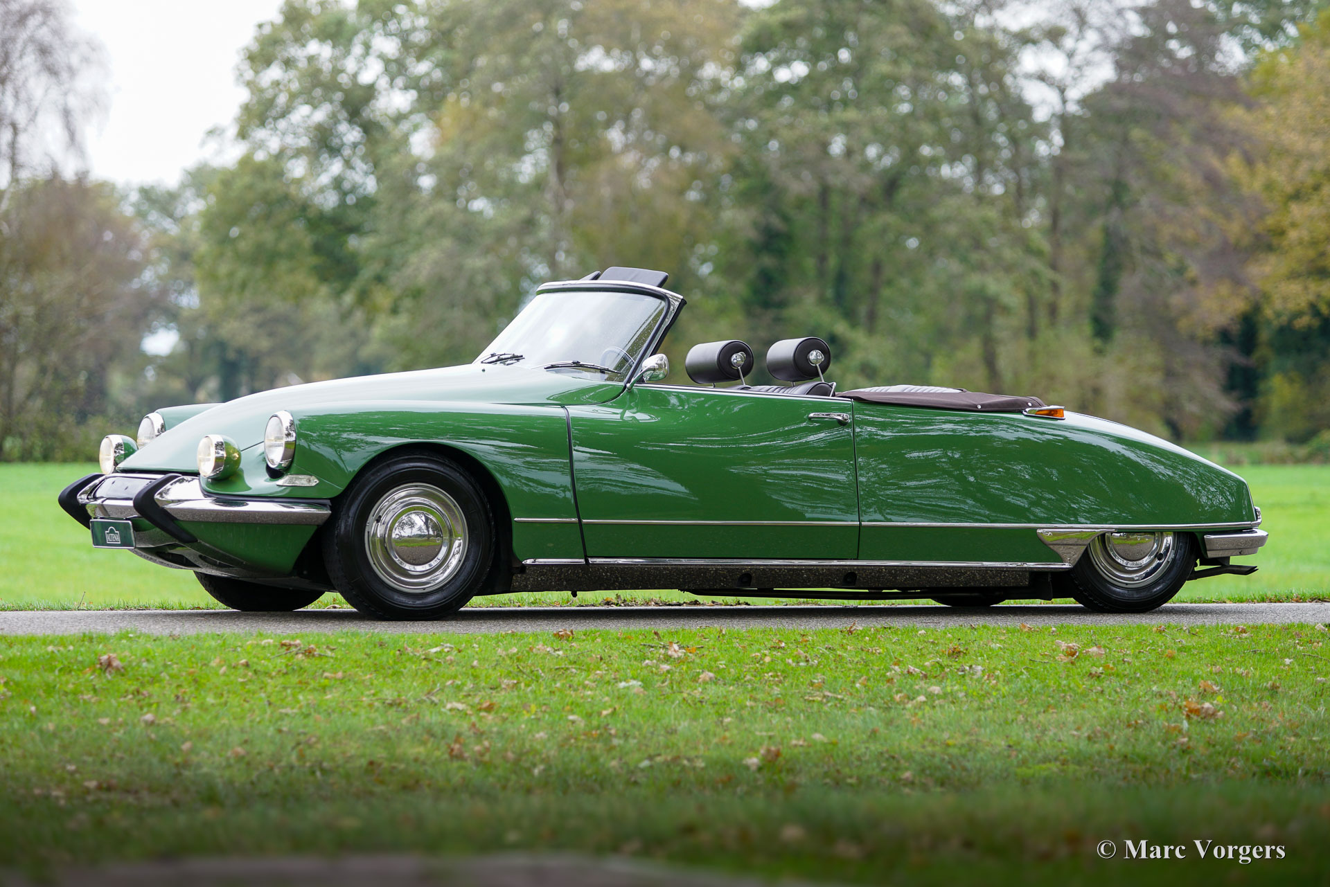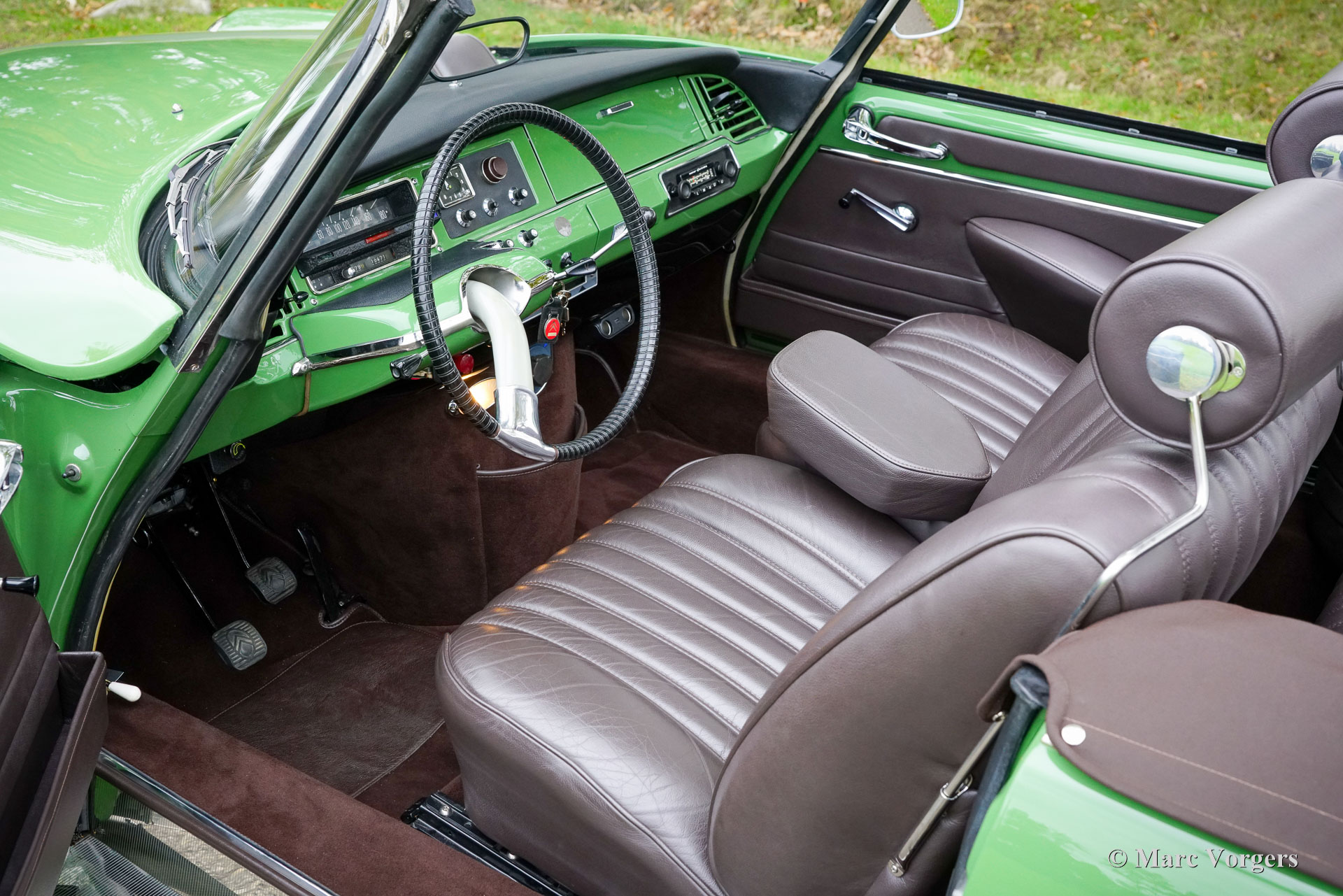 Citroën ID19 B Cabriolet, année 1968. Couleur vert (Vert Olive, code Citroën AC510), associée à un intérieur en cuir marron foncé, une moquette marron foncé et une capote en mohair marron foncé. Un cabriolet d'usine a été proposé par Citroën de l'été 1960 à l'été 1971. Les Décapotable Cabriolet d'Usine furent construits par l'entreprise de carrosserie française (Henri) Chapron, pour le réseau de concessionnaires Citroën. C'était une voiture chère et seulement 1 365 exemplaires furent produits. Les voitures décapotables ID/DS d'origine sont très rares, c'est pourquoi de nombreuses Berlines sont converties en cabriolets pour répondre à l'énorme demande du marché. Ce magnifique cabriolet ID19B est une telle conversion créée par la société néerlandaise Citro Classique. La berline ID19B d'origine fut vendue neuve en France, et l'automobile fut transformée et restaurée dans les années 2015-2018. La carrosserie ID19 fut convertie et renforcée selon les spécifications Chapron d'origine, et tout a été restauré, révisé et renouvelé pour atteindre la perfection. Cette magnifique automobile est dans un superbe état ! La carrosserie présente un ajustement parfait des panneaux, une peinture fantastique et tous les détails du cabriolet d'usine. Tout est flambant neuf ; ni les coûts ni les efforts n’ont été épargnés. La voiture est équipée de pneus Michelin d'origine, des projecteurs Marchal supplémentaires, d'un accoudoir central, de magnifique appuie-tête et d'une radio Becker Europa. Ce très bel exemplaire reprend toutes les caractéristiques attractives de Citroën ID/DS comme la superbe tenue de route, la qualité de confort et de conduite incomparable, le superbe système de freinage qui maintient la voiture à l'horizontale au freinage… Tout cela grâce au magnifique système hydraulique Citroën. Système de suspension hydropneumatique introduit sur les voitures Citroën ID/DS. Cet exemple comprend une boîte de vitesses manuelle à 4 rapports avec levier de vitesses sur la colonne de direction. Le moteur quatre cylindres de 2 100 cm3 est une unité puissante qui fonctionne à merveille et entraîne les roues avant. Ce cabriolet Citroën ID19B merveilleusement restauré est fini dans une palette de couleurs Citroën originale des années 1960 qui ajoute à l'expérience de conduite classique globale. Le coffre est suffisamment grand pour contenir les bagages de voyage de quatre personnes si vous rêvez de vous lancer dans un voyage hôtelier transeuropéen… Ce cabriolet ID19B fait vraiment tourner les têtes et constitue une fantastique voiture classique à apprécier avec votre conjoint et/ou entre amis !