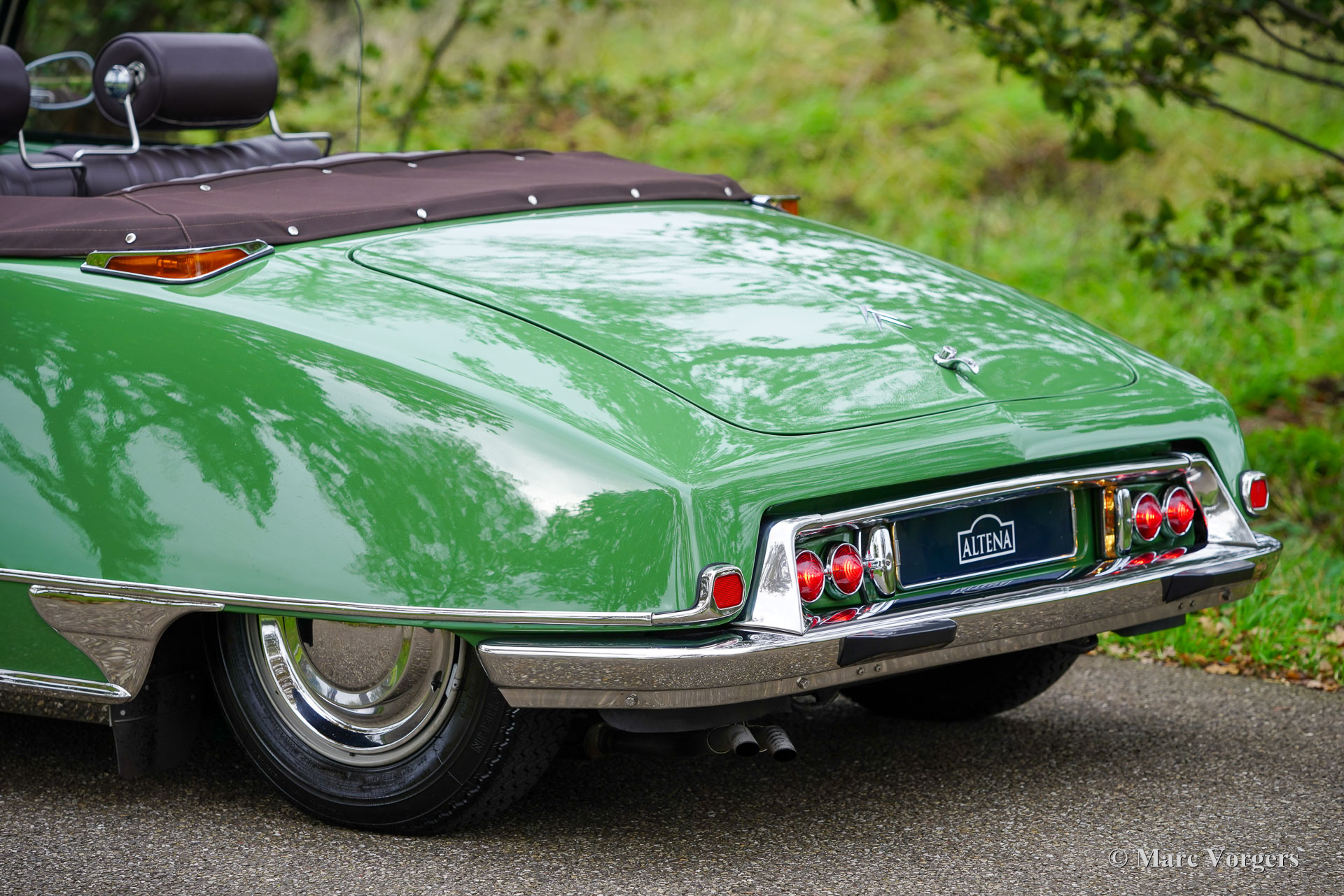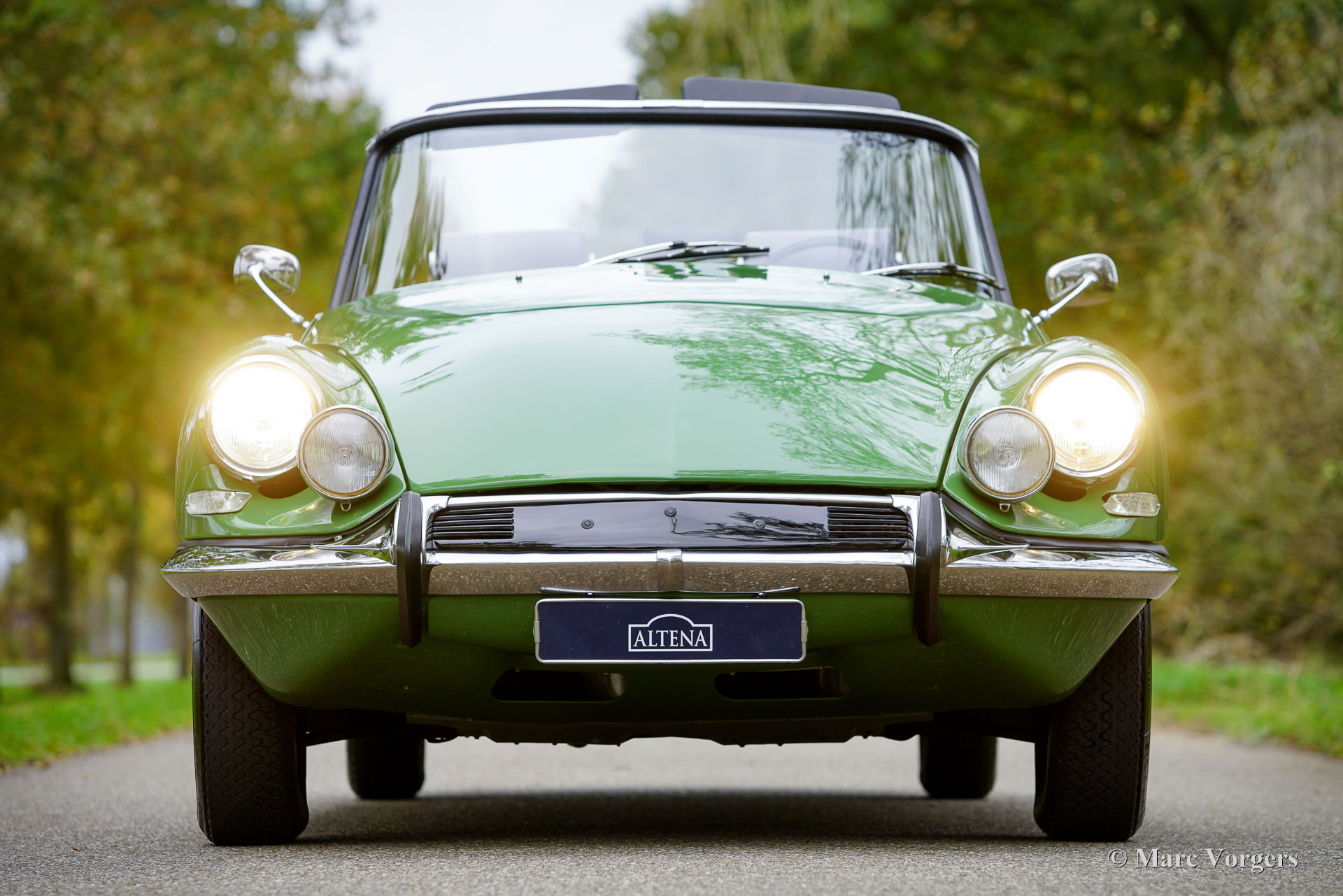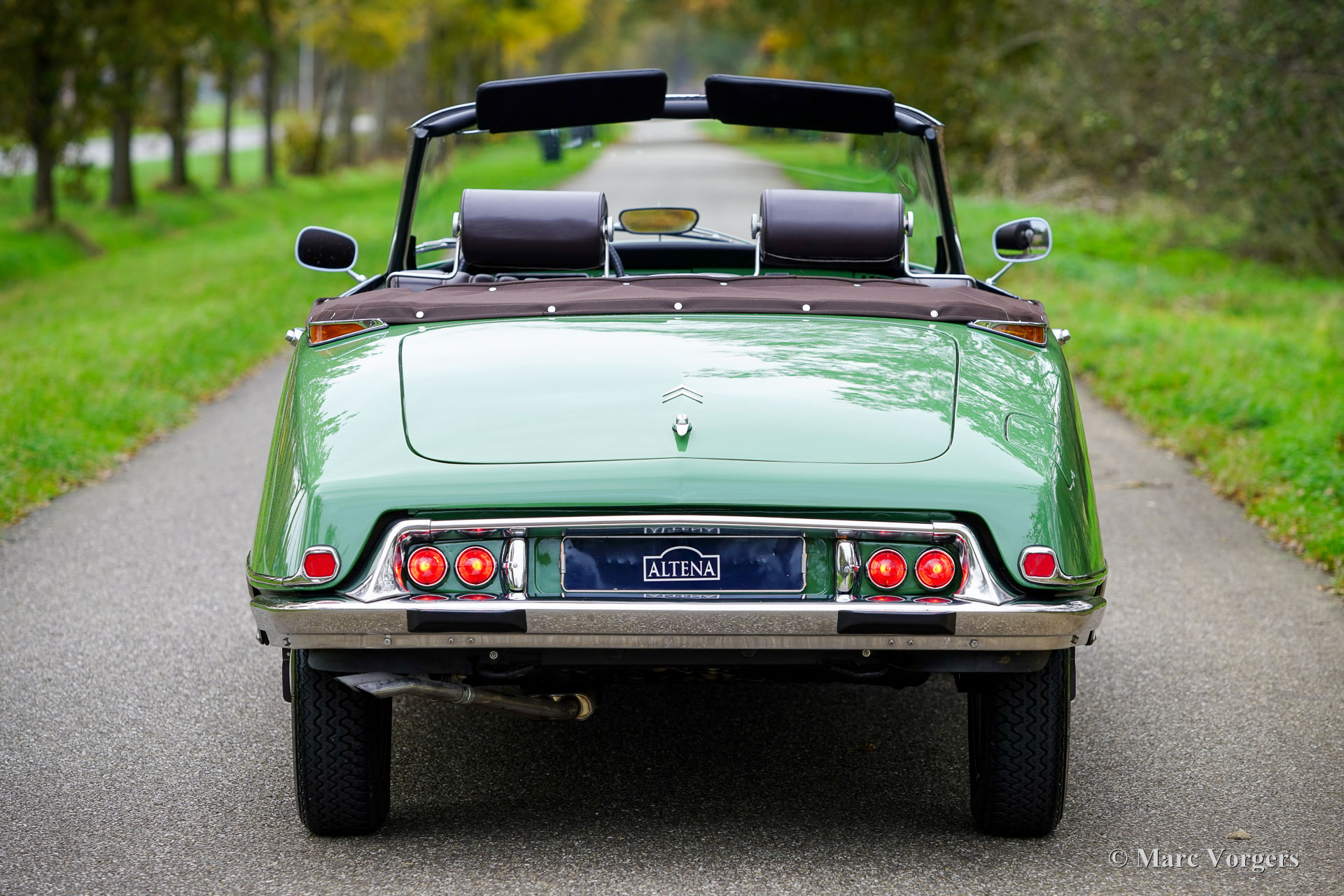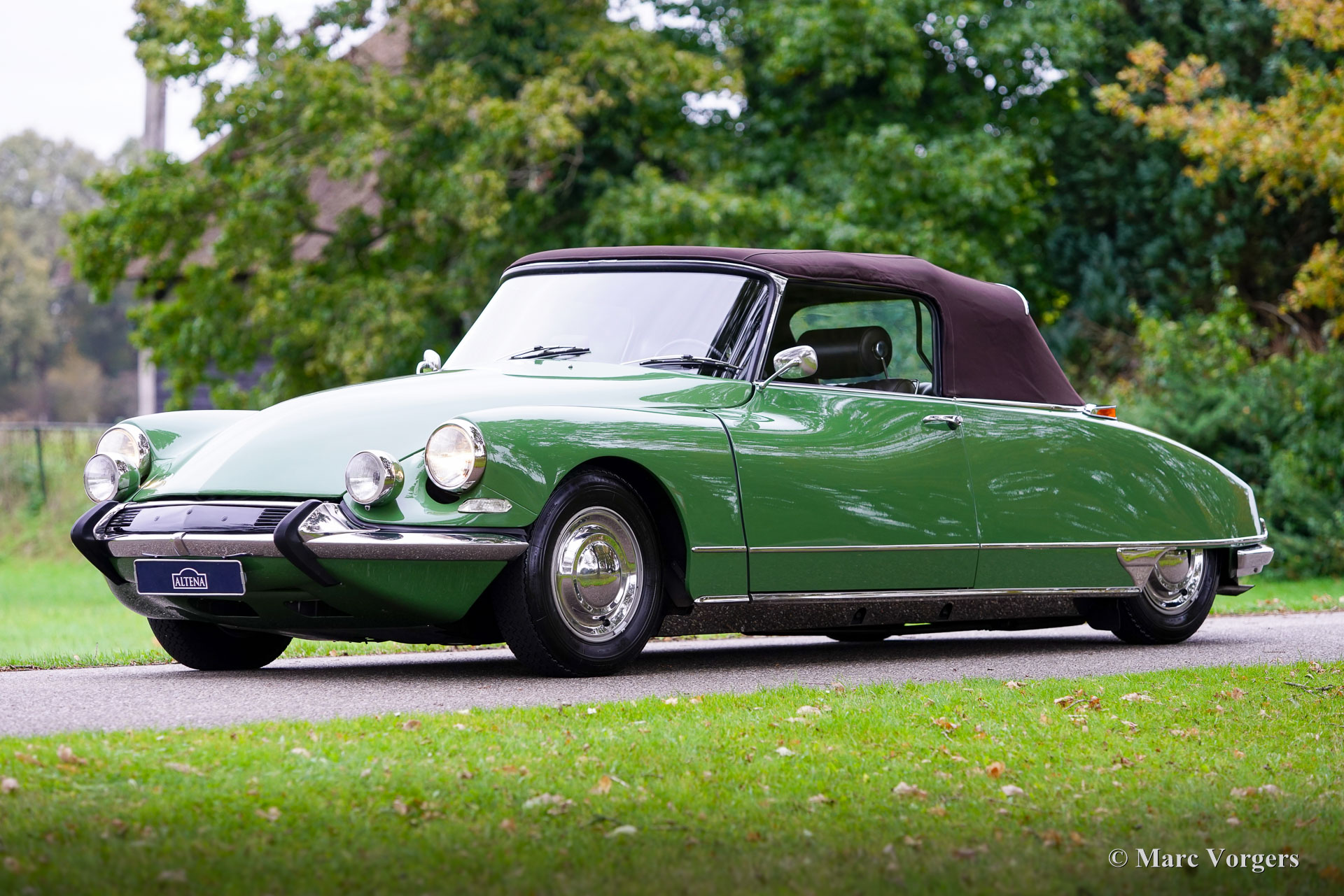 Citroën ID19 B Cabriolet, année 1968. Couleur vert (Vert Olive, code Citroën AC510), associée à un intérieur en cuir marron foncé, une moquette marron foncé et une capote en mohair marron foncé. Un cabriolet d'usine a été proposé par Citroën de l'été 1960 à l'été 1971. Les Décapotable Cabriolet d'Usine furent construits par l'entreprise de carrosserie française (Henri) Chapron, pour le réseau de concessionnaires Citroën. C'était une voiture chère et seulement 1 365 exemplaires furent produits. Les voitures décapotables ID/DS d'origine sont très rares, c'est pourquoi de nombreuses Berlines sont converties en cabriolets pour répondre à l'énorme demande du marché. Ce magnifique cabriolet ID19B est une telle conversion créée par la société néerlandaise Citro Classique. La berline ID19B d'origine fut vendue neuve en France, et l'automobile fut transformée et restaurée dans les années 2015-2018. La carrosserie ID19 fut convertie et renforcée selon les spécifications Chapron d'origine, et tout a été restauré, révisé et renouvelé pour atteindre la perfection. Cette magnifique automobile est dans un superbe état ! La carrosserie présente un ajustement parfait des panneaux, une peinture fantastique et tous les détails du cabriolet d'usine. Tout est flambant neuf ; ni les coûts ni les efforts n’ont été épargnés. La voiture est équipée de pneus Michelin d'origine, des projecteurs Marchal supplémentaires, d'un accoudoir central, de magnifique appuie-tête et d'une radio Becker Europa. Ce très bel exemplaire reprend toutes les caractéristiques attractives de Citroën ID/DS comme la superbe tenue de route, la qualité de confort et de conduite incomparable, le superbe système de freinage qui maintient la voiture à l'horizontale au freinage… Tout cela grâce au magnifique système hydraulique Citroën. Système de suspension hydropneumatique introduit sur les voitures Citroën ID/DS. Cet exemple comprend une boîte de vitesses manuelle à 4 rapports avec levier de vitesses sur la colonne de direction. Le moteur quatre cylindres de 2 100 cm3 est une unité puissante qui fonctionne à merveille et entraîne les roues avant. Ce cabriolet Citroën ID19B merveilleusement restauré est fini dans une palette de couleurs Citroën originale des années 1960 qui ajoute à l'expérience de conduite classique globale. Le coffre est suffisamment grand pour contenir les bagages de voyage de quatre personnes si vous rêvez de vous lancer dans un voyage hôtelier transeuropéen… Ce cabriolet ID19B fait vraiment tourner les têtes et constitue une fantastique voiture classique à apprécier avec votre conjoint et/ou entre amis !