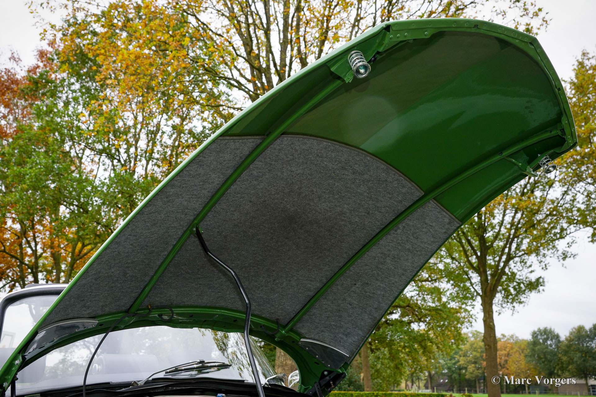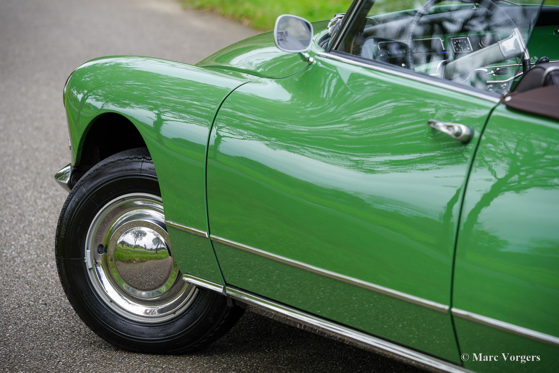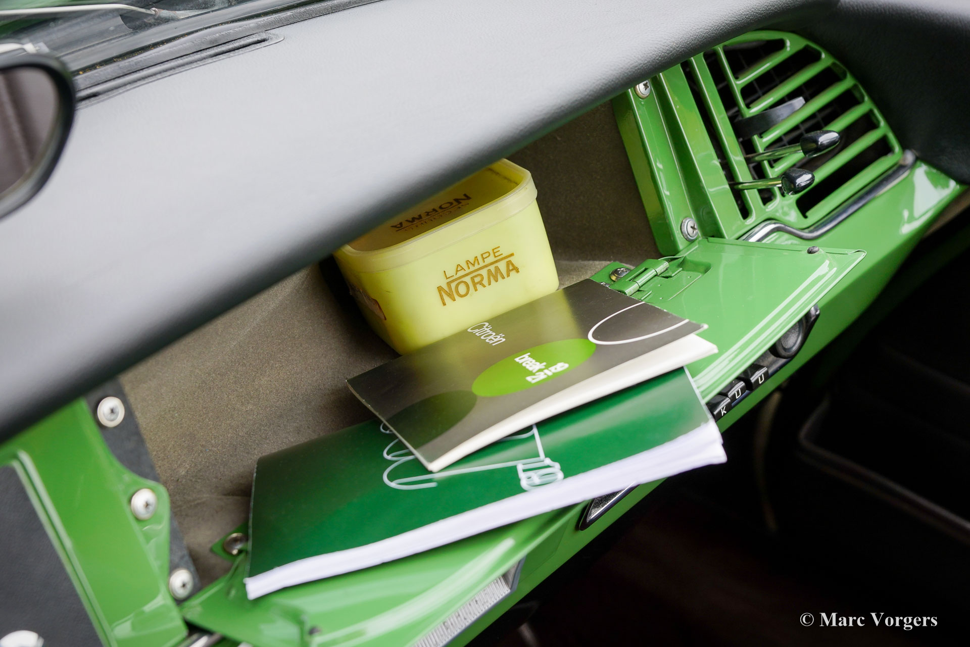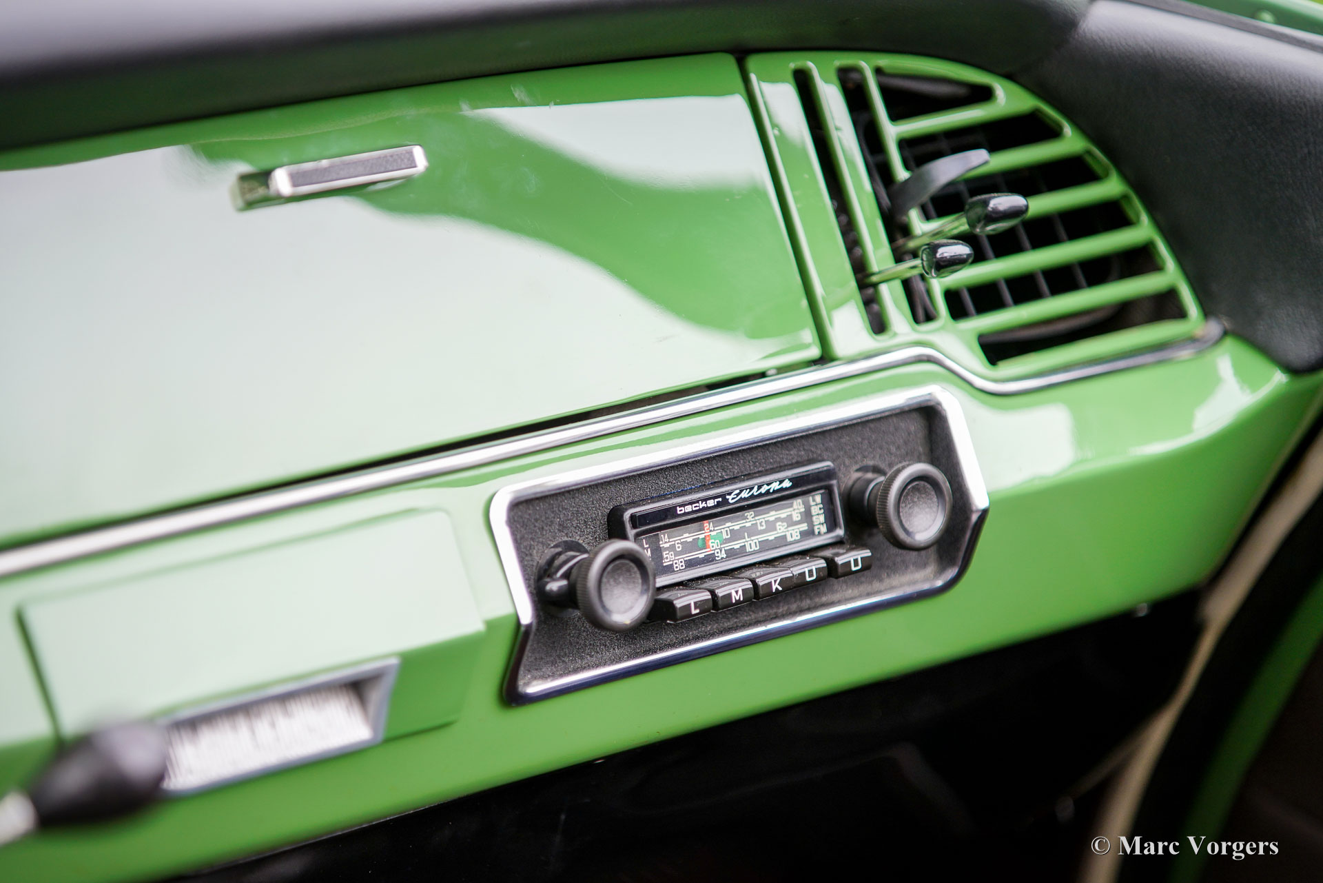Citroën ID19 B Cabriolet, année 1968. Couleur vert (Vert Olive, code Citroën AC510), associée à un intérieur en cuir marron foncé, une moquette marron foncé et une capote en mohair marron foncé. Un cabriolet d'usine a été proposé par Citroën de l'été 1960 à l'été 1971. Les Décapotable Cabriolet d'Usine furent construits par l'entreprise de carrosserie française (Henri) Chapron, pour le réseau de concessionnaires Citroën. C'était une voiture chère et seulement 1 365 exemplaires furent produits. Les voitures décapotables ID/DS d'origine sont très rares, c'est pourquoi de nombreuses Berlines sont converties en cabriolets pour répondre à l'énorme demande du marché. Ce magnifique cabriolet ID19B est une telle conversion créée par la société néerlandaise Citro Classique. La berline ID19B d'origine fut vendue neuve en France, et l'automobile fut transformée et restaurée dans les années 2015-2018. La carrosserie ID19 fut convertie et renforcée selon les spécifications Chapron d'origine, et tout a été restauré, révisé et renouvelé pour atteindre la perfection. Cette magnifique automobile est dans un superbe état ! La carrosserie présente un ajustement parfait des panneaux, une peinture fantastique et tous les détails du cabriolet d'usine. Tout est flambant neuf ; ni les coûts ni les efforts n’ont été épargnés. La voiture est équipée de pneus Michelin d'origine, des projecteurs Marchal supplémentaires, d'un accoudoir central, de magnifique appuie-tête et d'une radio Becker Europa. Ce très bel exemplaire reprend toutes les caractéristiques attractives de Citroën ID/DS comme la superbe tenue de route, la qualité de confort et de conduite incomparable, le superbe système de freinage qui maintient la voiture à l'horizontale au freinage… Tout cela grâce au magnifique système hydraulique Citroën. Système de suspension hydropneumatique introduit sur les voitures Citroën ID/DS. Cet exemple comprend une boîte de vitesses manuelle à 4 rapports avec levier de vitesses sur la colonne de direction. Le moteur quatre cylindres de 2 100 cm3 est une unité puissante qui fonctionne à merveille et entraîne les roues avant. Ce cabriolet Citroën ID19B merveilleusement restauré est fini dans une palette de couleurs Citroën originale des années 1960 qui ajoute à l'expérience de conduite classique globale. Le coffre est suffisamment grand pour contenir les bagages de voyage de quatre personnes si vous rêvez de vous lancer dans un voyage hôtelier transeuropéen… Ce cabriolet ID19B fait vraiment tourner les têtes et constitue une fantastique voiture classique à apprécier avec votre conjoint et/ou entre amis !