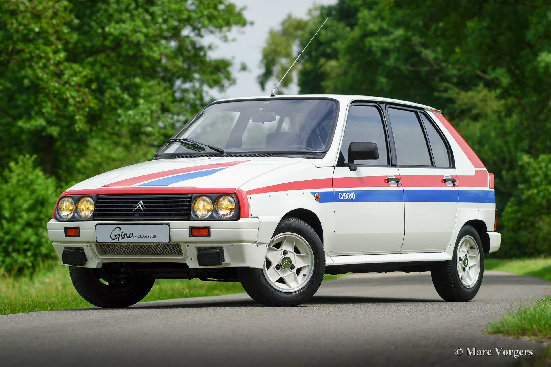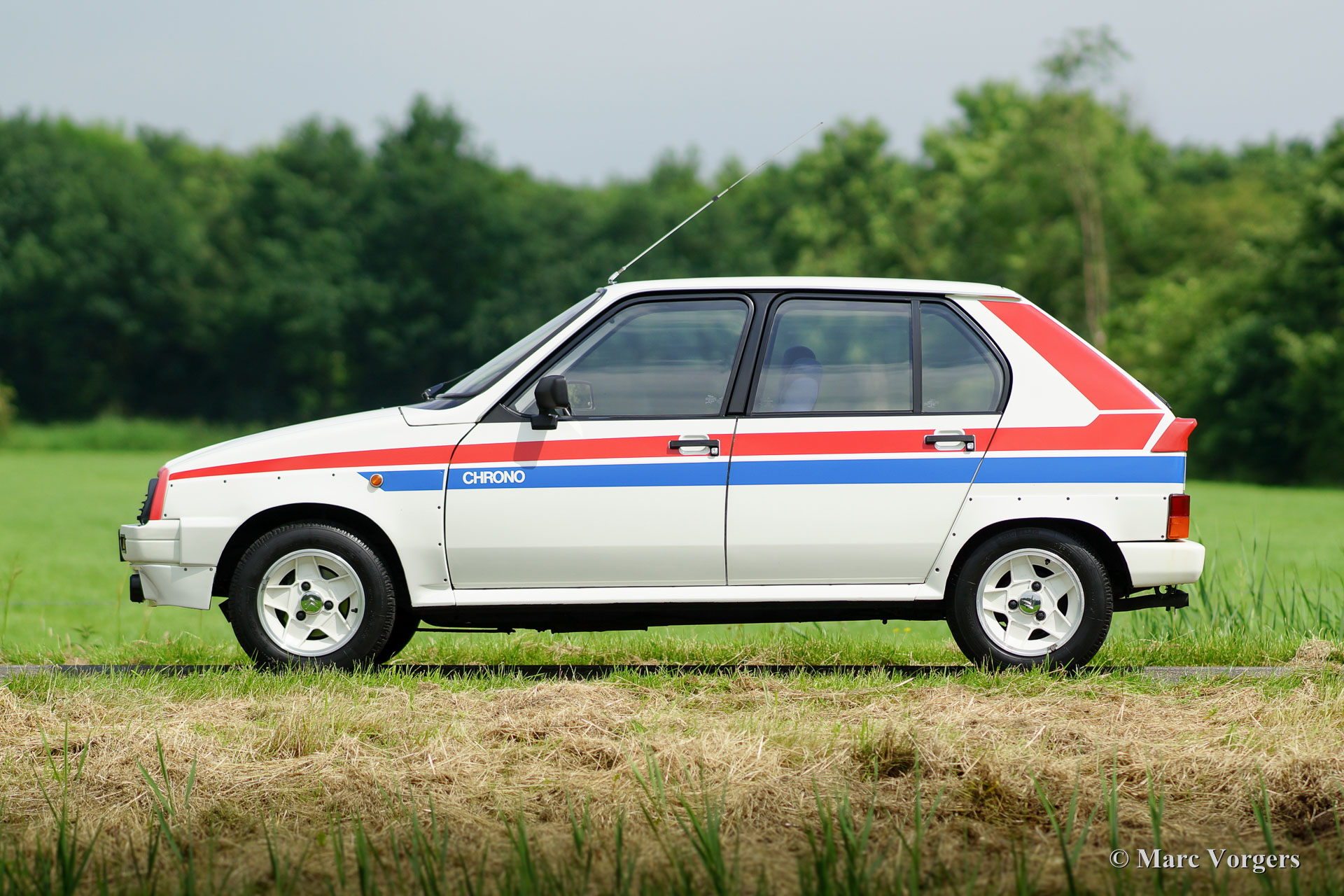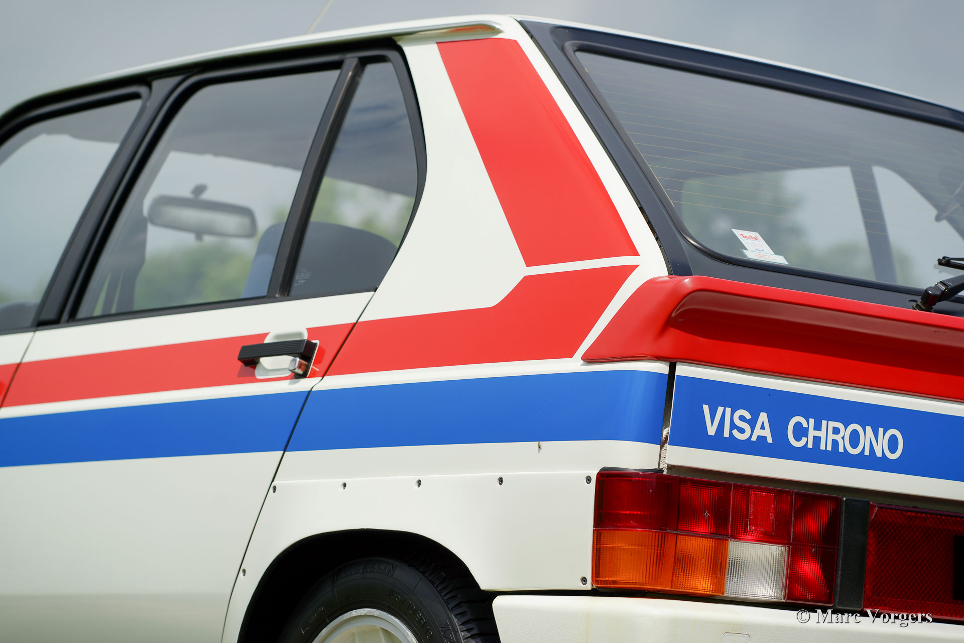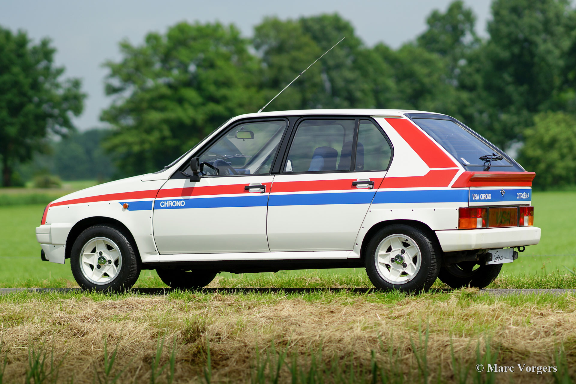 Citroën Visa Chrono, année 1983. Couleur blanc (Blanc Meije) avec un intérieur en tissu noir / bleu. Le Chrono a été vendu en couleurs françaises / néerlandais / allemand. Rouge, blanc et bleu pour les voitures néerlandaises et françaises. Le Chrono dispose d'un ‘Chrono seulement’ tableau de bord unique avec de beaux calibres Jaeger. Dans les années 1980 la Visa Chrono était un concurrent de la Renault R5 GT et la Peugeot 205 GTI. Avec une capacité de 80 ch. et un poids de seulement 900 kg de la voiture est un véritable ‘hot hatch’.