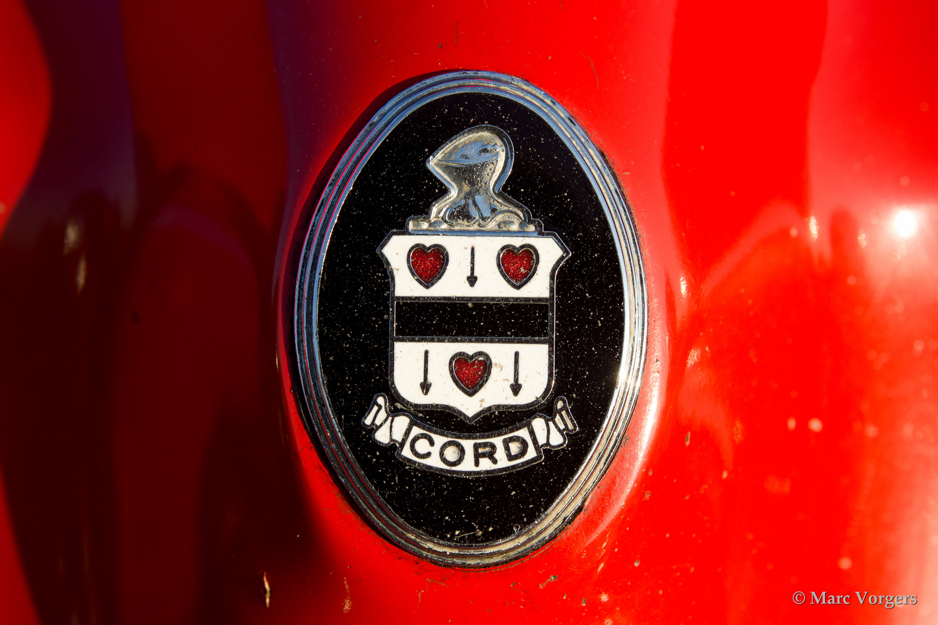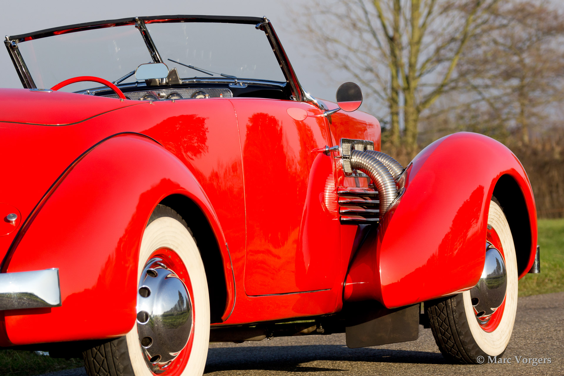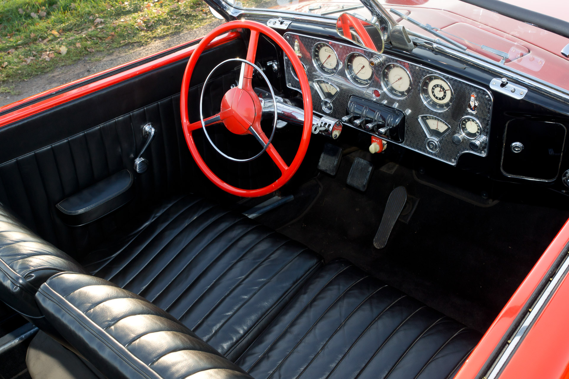 Cord 812 SC Phaeton, 1937. Colour red with a black leather interior and a black hood. This extremely beautiful and very scarce Cord 812 is one of the 99 super charged Phaetons which were ever built. This stunning Gordon Buehrig design features the unique 'coffin nose' with alligator bonnet and wrap around grille. Manually retractable head lights and minimalist details compliment the purity of the fluent designed Phaeton bodywork. The interior features a wonderful Aircraft style dashboard. The automobile was sold new in the USA and was imported to the Netherlands in the year 1997.