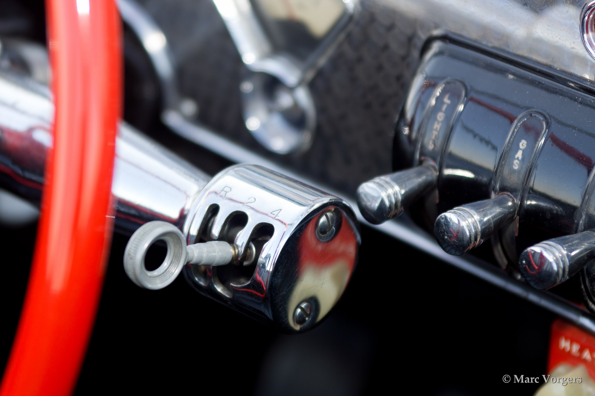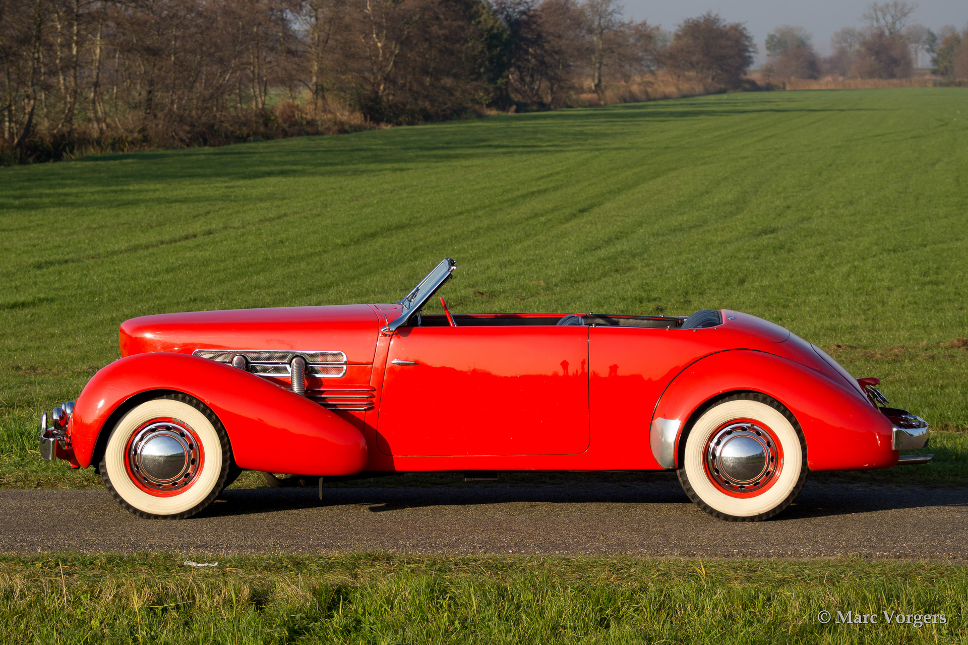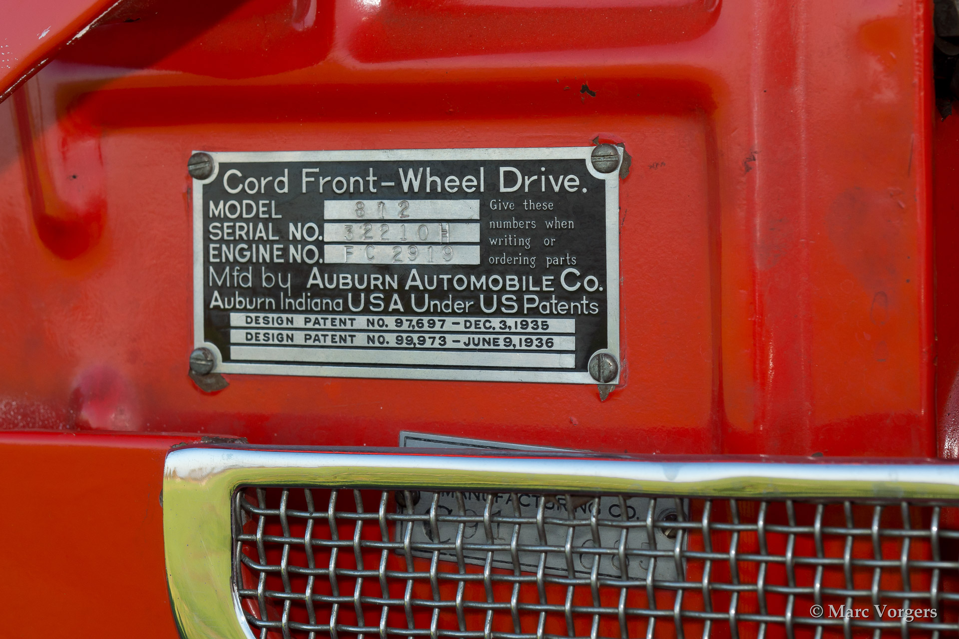 Cord 812 SC Phaeton, 1937. Colour red with a black leather interior and a black hood. This extremely beautiful and very scarce Cord 812 is one of the 99 super charged Phaetons which were ever built. This stunning Gordon Buehrig design features the unique 'coffin nose' with alligator bonnet and wrap around grille. Manually retractable head lights and minimalist details compliment the purity of the fluent designed Phaeton bodywork. The interior features a wonderful Aircraft style dashboard. The automobile was sold new in the USA and was imported to the Netherlands in the year 1997.