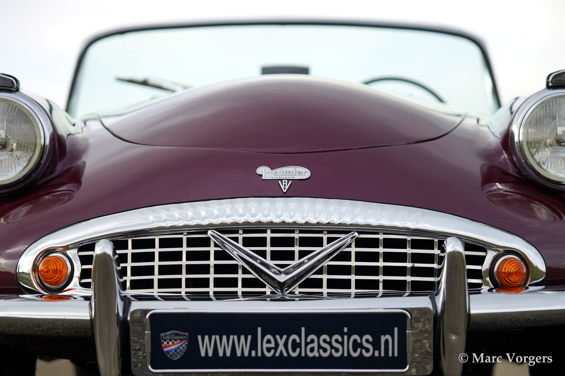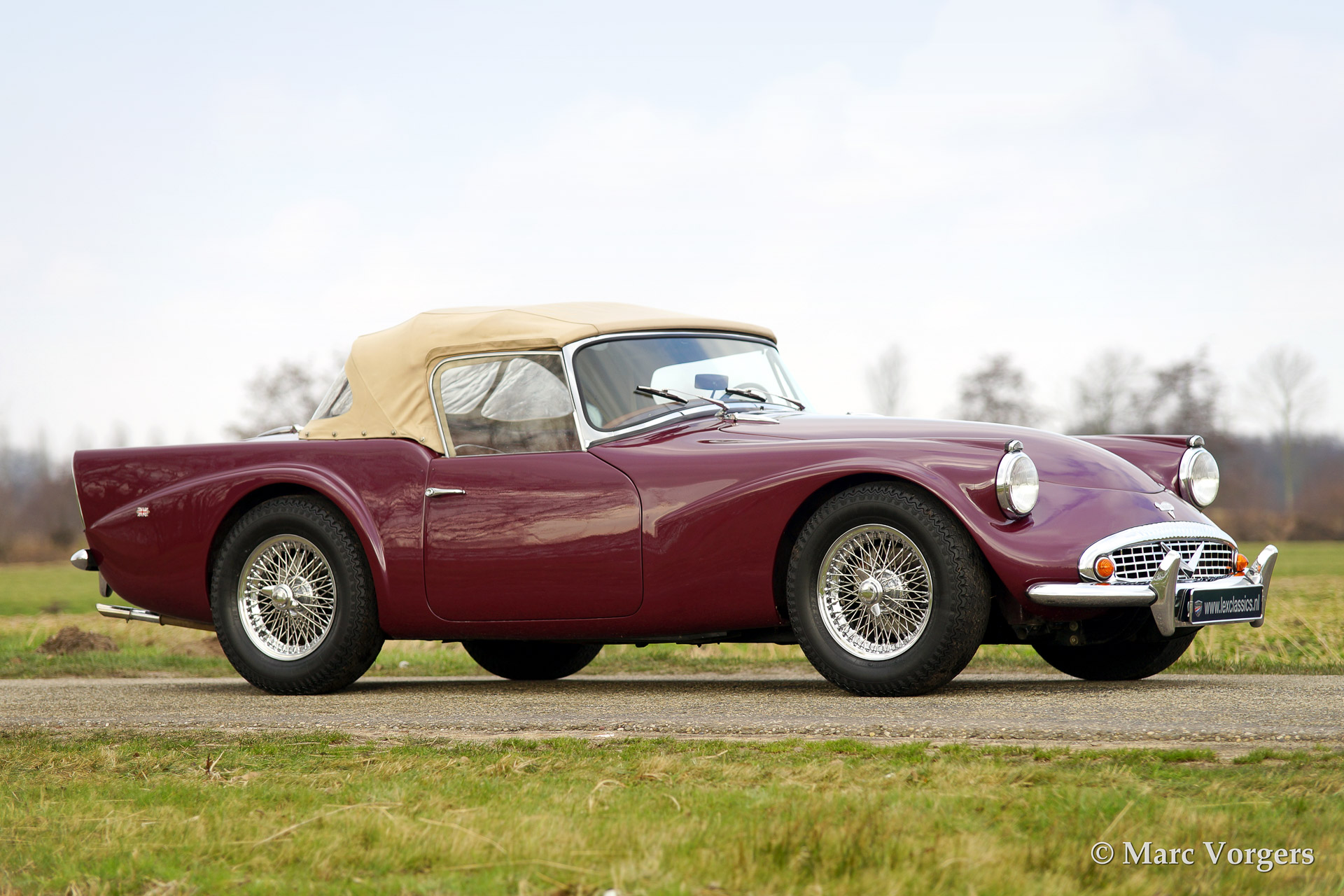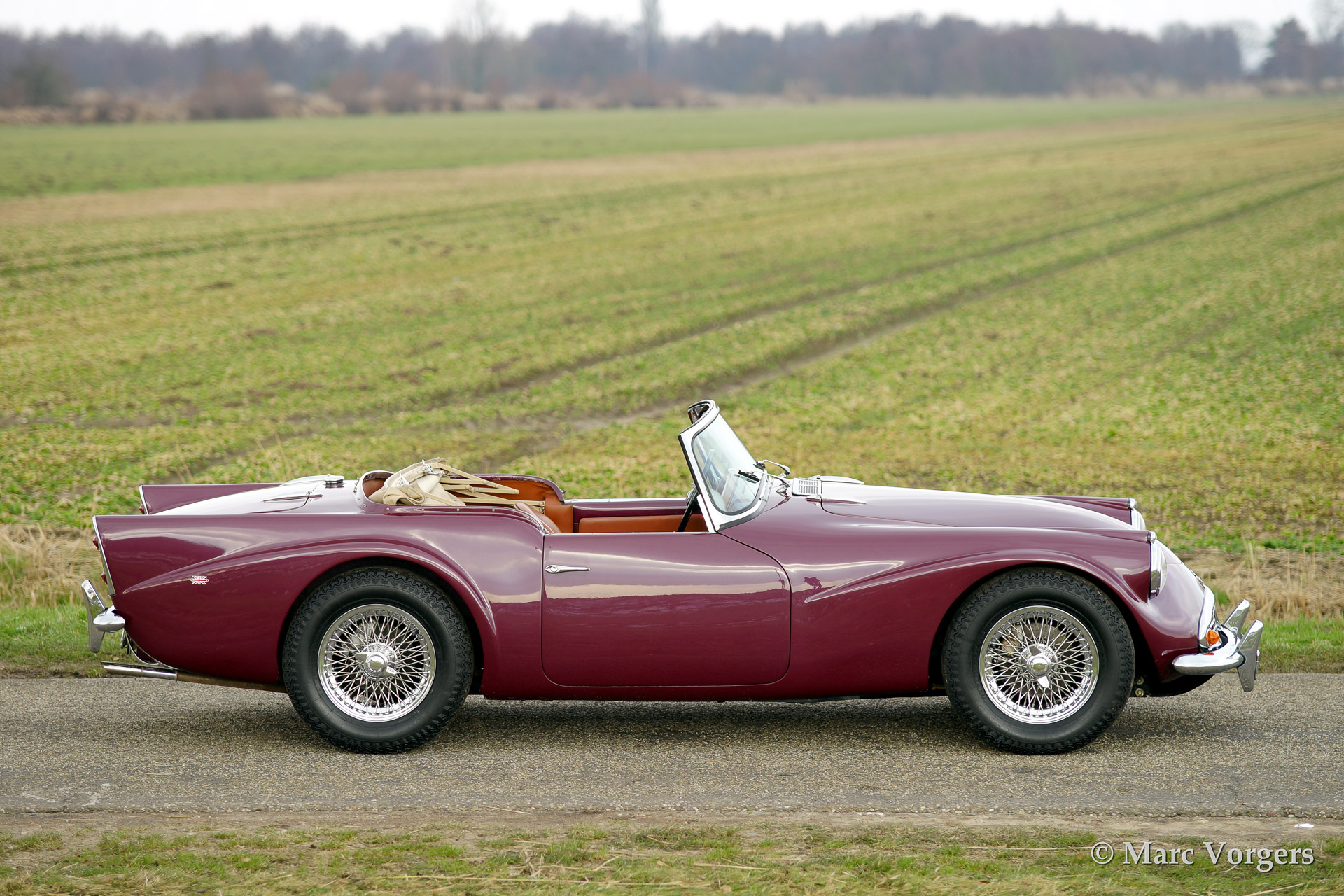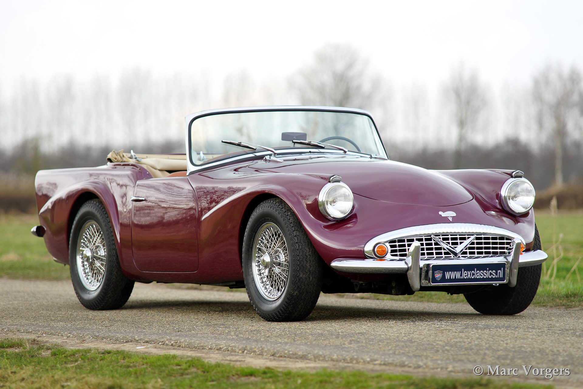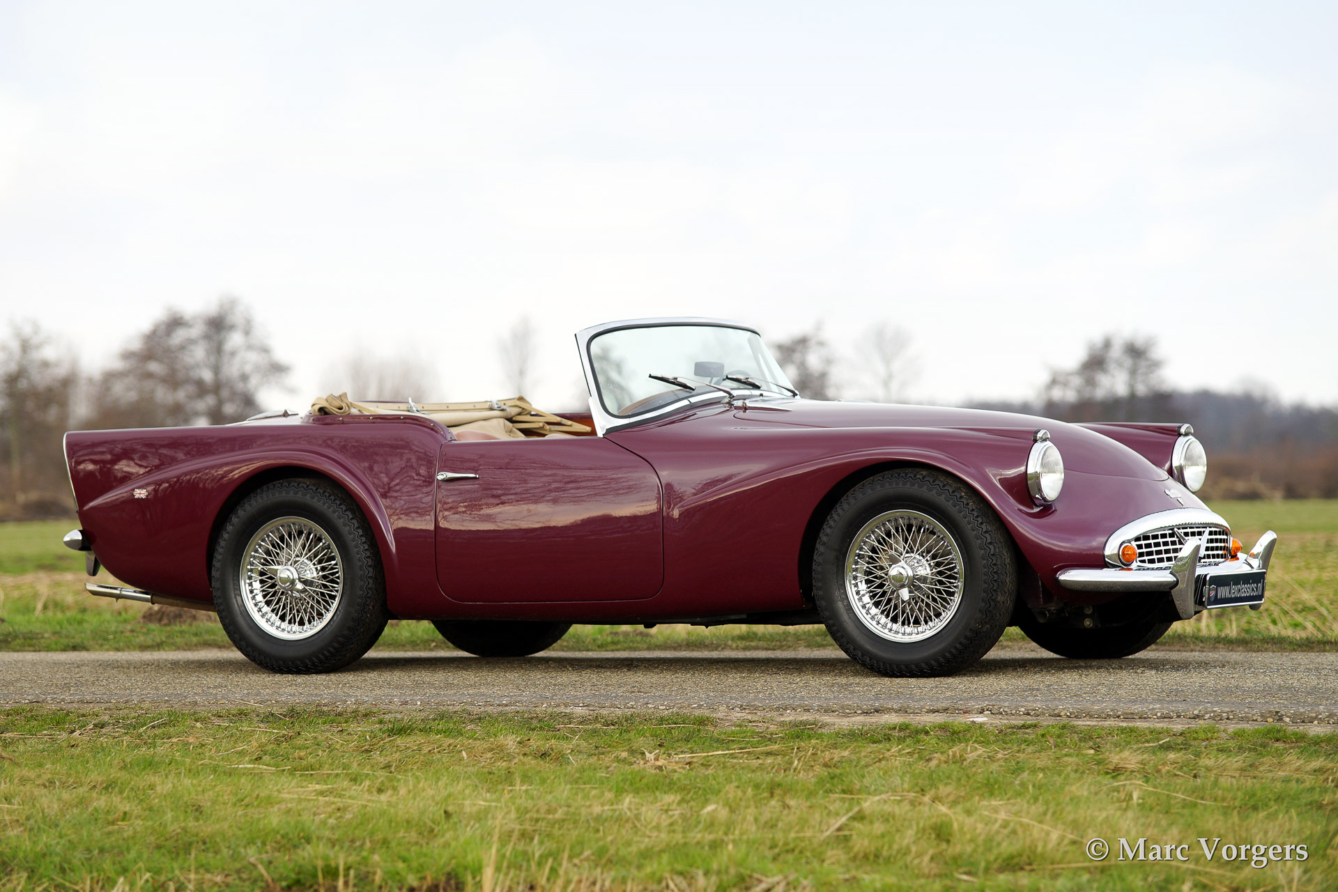 Daimler SP250, year 1963. Colour purple metallic with a two tone tan/beige leather interior and a beige soft top. This magnificent Daimler SP250 is a rare automobile, only 2.648 examples have been built. The car features GRP bodywork on a steel chassis keeping the car relatively light. This SP250 was imported from Virginia USA in the early 1990'ies. The car was finished after extensive restoration in the year 2002.