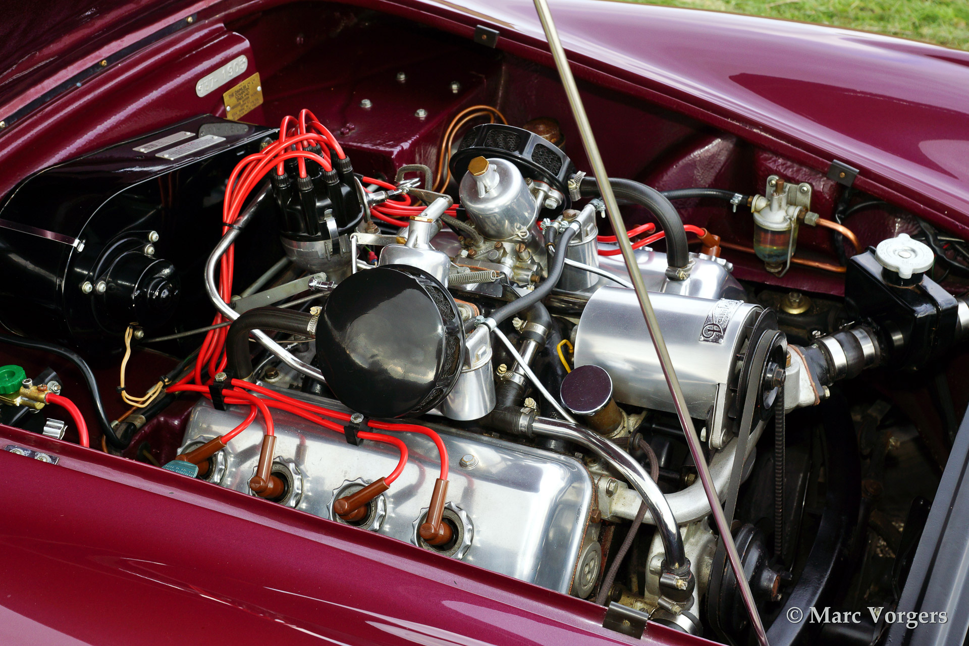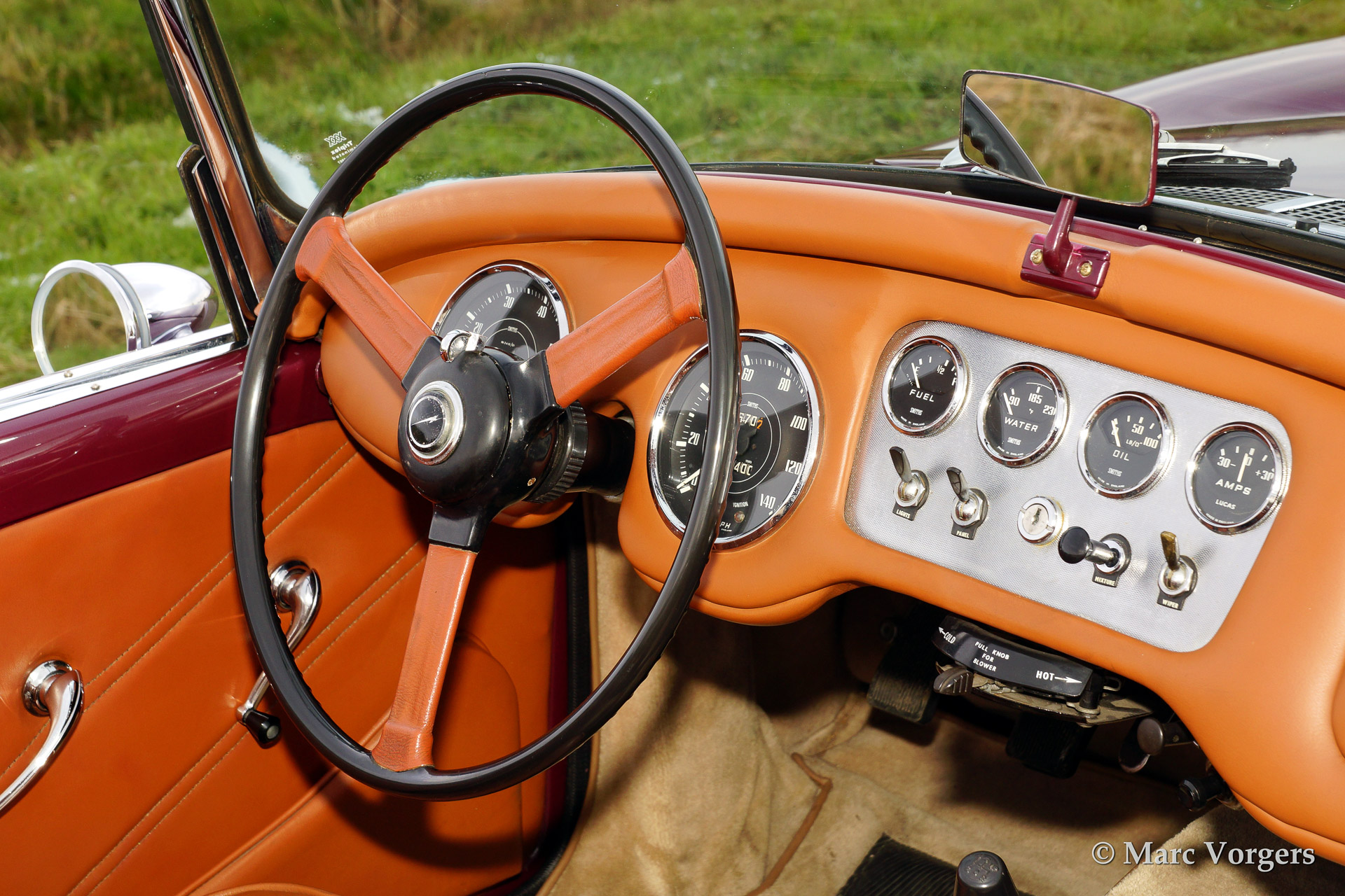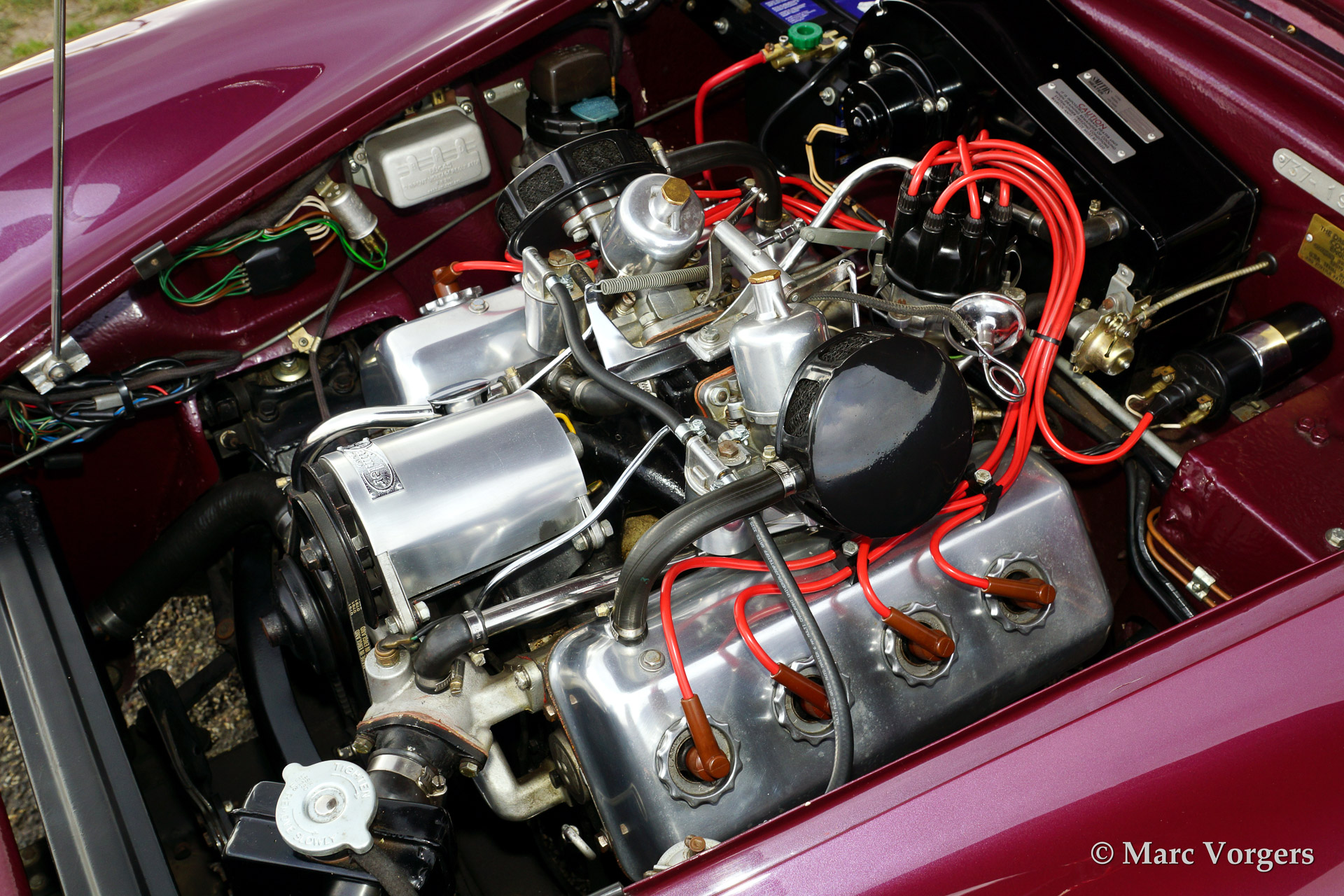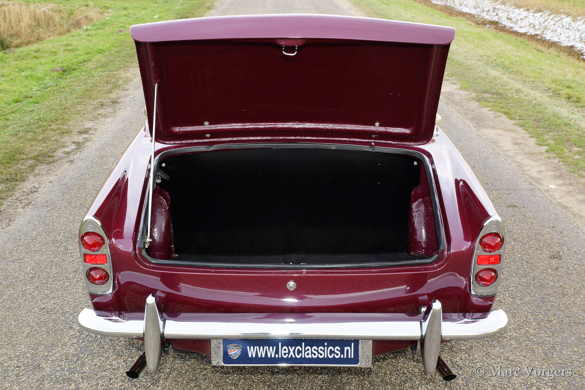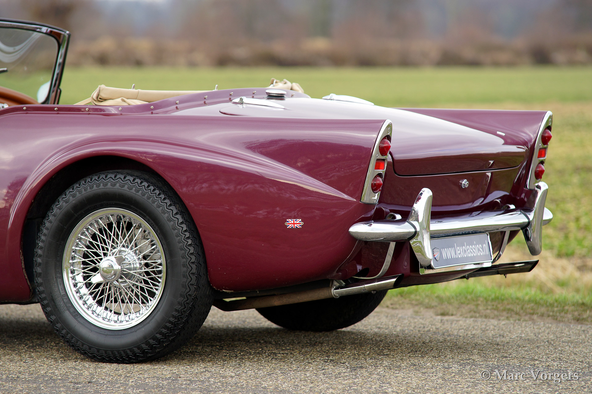Daimler SP250, year 1963. Colour purple metallic with a two tone tan/beige leather interior and a beige soft top. This magnificent Daimler SP250 is a rare automobile, only 2.648 examples have been built. The car features GRP bodywork on a steel chassis keeping the car relatively light. This SP250 was imported from Virginia USA in the early 1990'ies. The car was finished after extensive restoration in the year 2002.