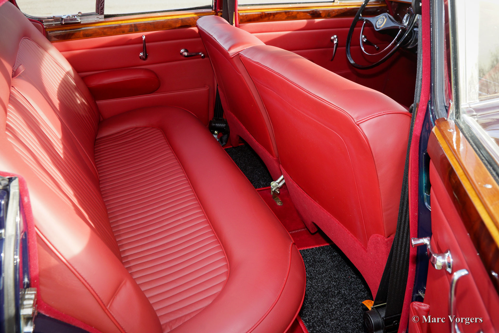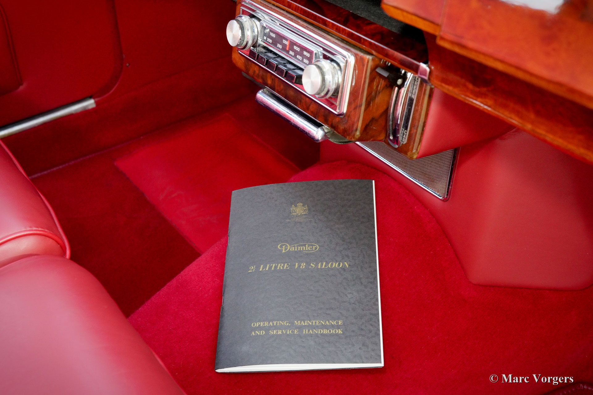 Daimler V8 2.5 Liter saloon, année 1965. Couleur bleu foncé avec un intérieur en cuir rouge et tapis rouge. Ce magnifique Daimler V8 est en excellent état. L'automobile a reçu une nouvelle peinture parfaite et un nouvel intérieur magnifique. Le travail brillant de chrome est en état superbe comme sont les autres détails. Le Daimler V8 est le modèle jumeau du Jaguar Mk II. Le Daimler dispose de son propre moteur V8 de 2,5 litres, d'une grille spéciale et d'autres détails luxueux de Daimler. La voiture dispose d'une boîte de vitesses automatique parfaitement décalage, direction assistée et les servo freins. Ce V8 Daimler conduit très confortablement et le moteur produit une très belle bande son sur le fond ! En outre, la voiture est équipée d'un ventilateur électrique et de roues chromées. C'est un spécimen magnifique !