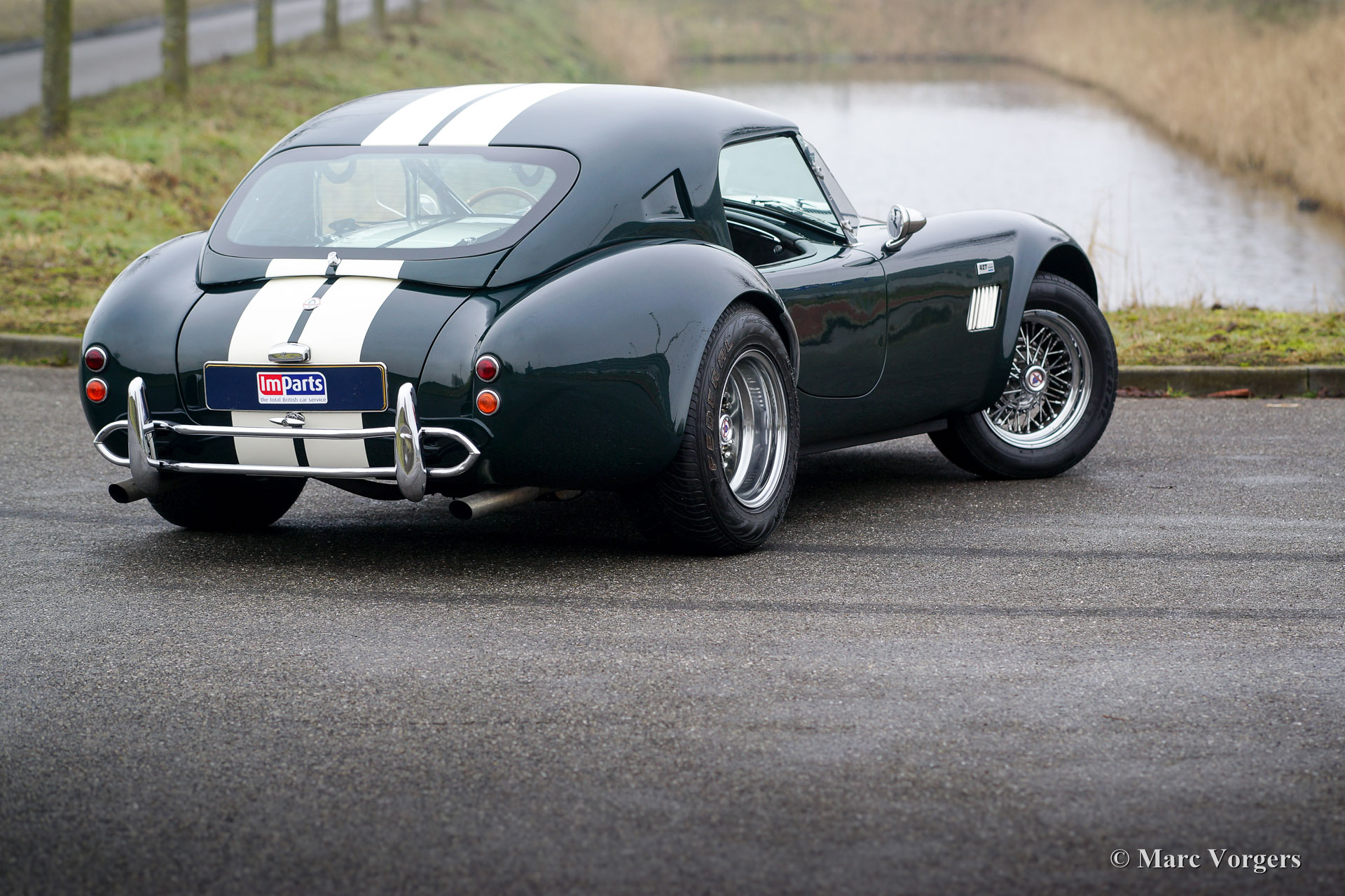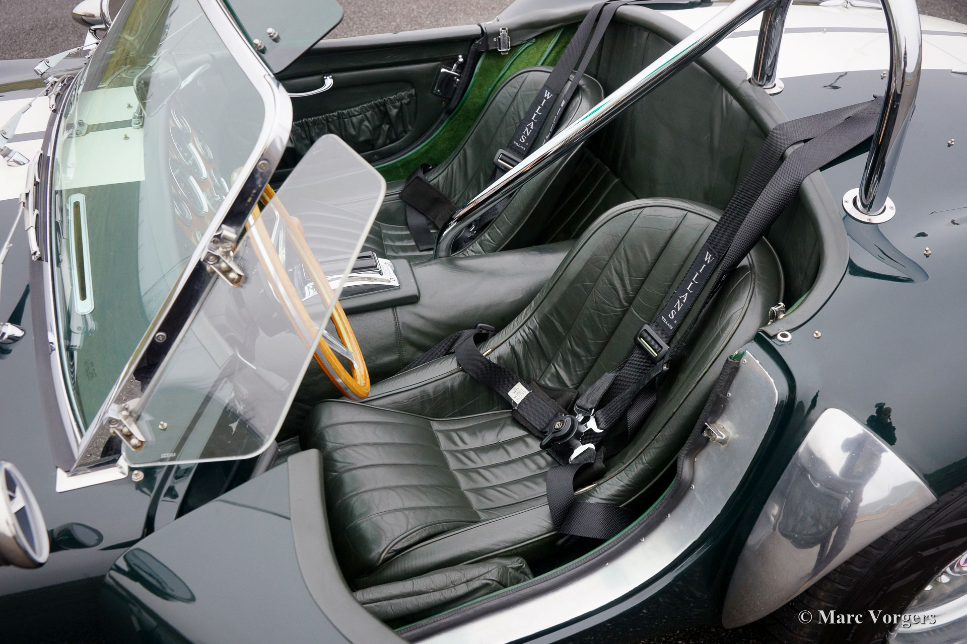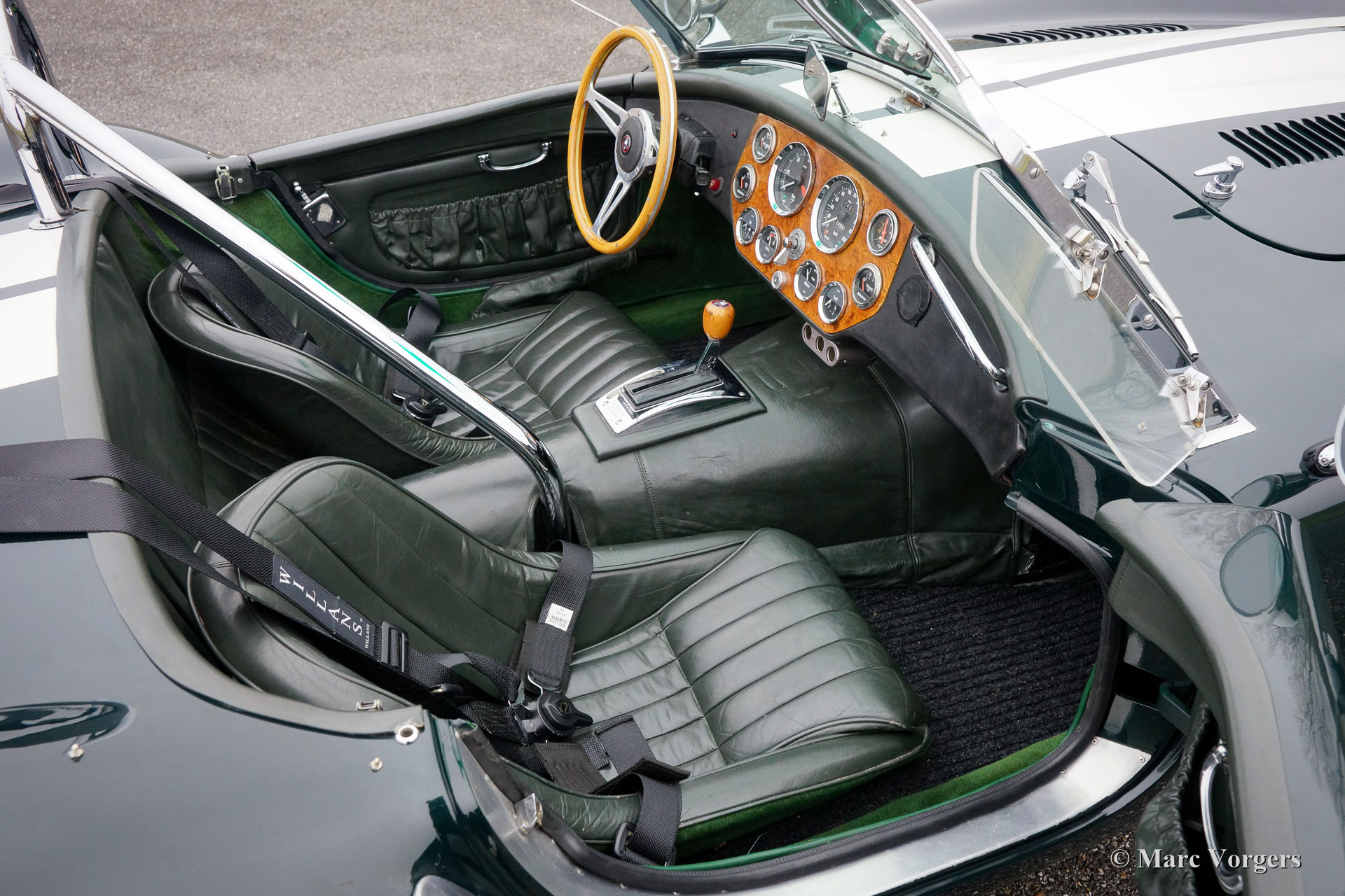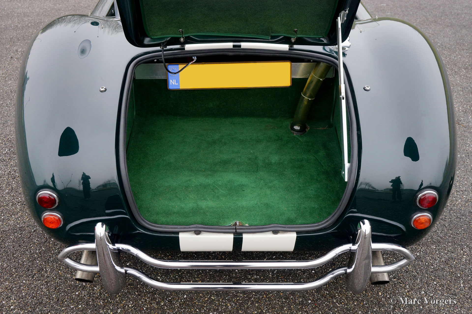 Dax Cobra Tojeiro, année 1991. Couleur vert foncé métallisé avec un intérieur en cuir vert. Couverture souple noire, vert foncé et un hard-top dans la couleur du corps. Le Dax Cobra est inspiré du légendaire AC Cobra 427 des années 60. Ce Dax Cobra a été construit aux Pays-Bas en utilisant des pièces de suspension Jaguar et essieu arrière et un moteur V8 de 5 litres de Chevrolet. Equipé d'une boîte de vitesses automatique avec levier de vitesses B & M. Ce Dax Cobra Tojeiro est une voiture impressionnante avec sa peinture vert foncé, rayures blanches et les roues de fil de chrome. Pour «booster» l'image encore plus la voiture vient avec un hard-top qui semble magnifique! La cabine est équipée d'un bouchon de remplissage rapide type Le Mans, de harnais de sécurité à 4 points, d'un volant sport avec jante en bois, d'une barre de roulement, de deux miroirs avertisseurs chromés, de déflecteurs de vent Perspex et d'un soleil Visières. La voiture est documentée avec les factures de service. Il s'agit d'un Cobra impressionnant avec une piste sonore Lusty V8!