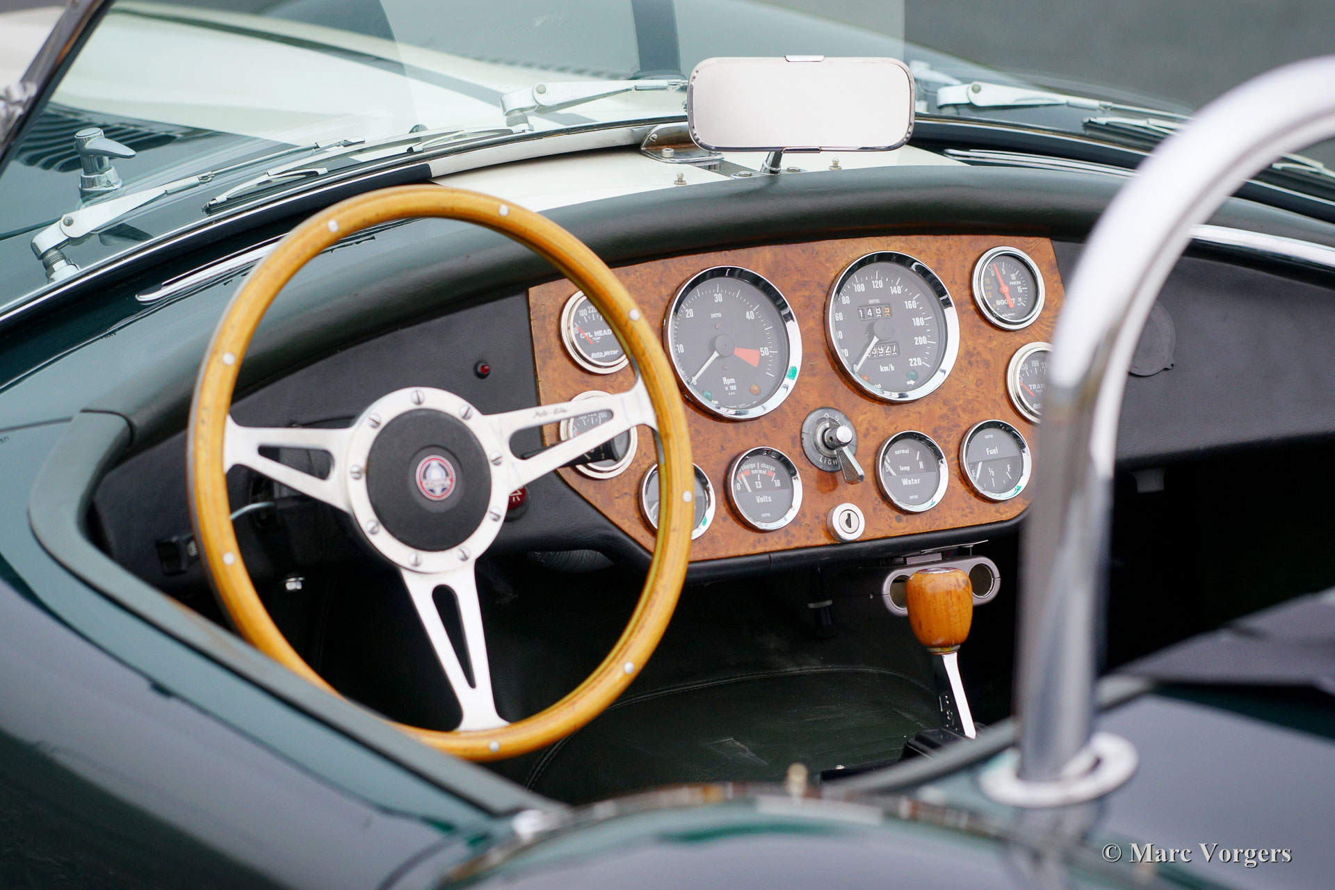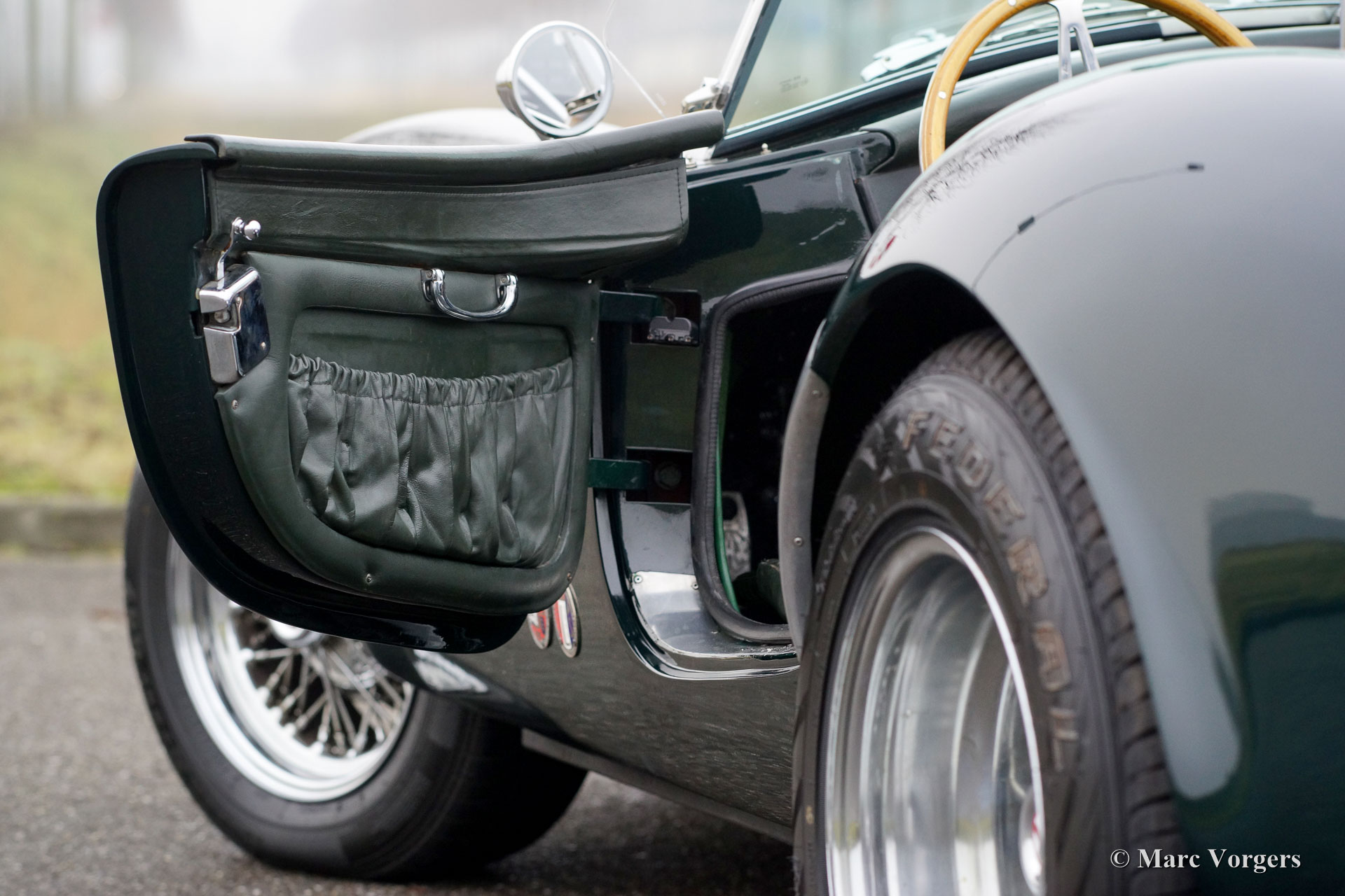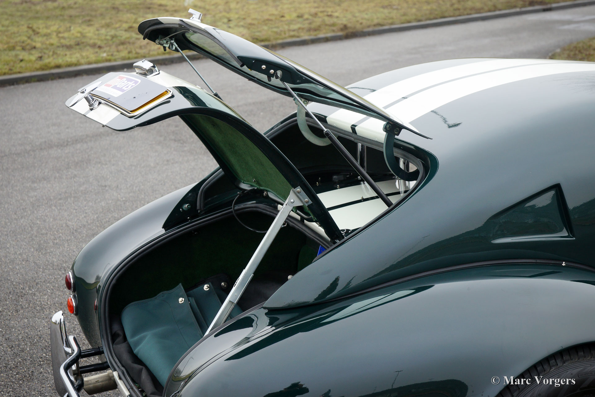 Dax Cobra Tojeiro, année 1991. Couleur vert foncé métallisé avec un intérieur en cuir vert. Couverture souple noire, vert foncé et un hard-top dans la couleur du corps. Le Dax Cobra est inspiré du légendaire AC Cobra 427 des années 60. Ce Dax Cobra a été construit aux Pays-Bas en utilisant des pièces de suspension Jaguar et essieu arrière et un moteur V8 de 5 litres de Chevrolet. Equipé d'une boîte de vitesses automatique avec levier de vitesses B & M. Ce Dax Cobra Tojeiro est une voiture impressionnante avec sa peinture vert foncé, rayures blanches et les roues de fil de chrome. Pour «booster» l'image encore plus la voiture vient avec un hard-top qui semble magnifique! La cabine est équipée d'un bouchon de remplissage rapide type Le Mans, de harnais de sécurité à 4 points, d'un volant sport avec jante en bois, d'une barre de roulement, de deux miroirs avertisseurs chromés, de déflecteurs de vent Perspex et d'un soleil Visières. La voiture est documentée avec les factures de service. Il s'agit d'un Cobra impressionnant avec une piste sonore Lusty V8!