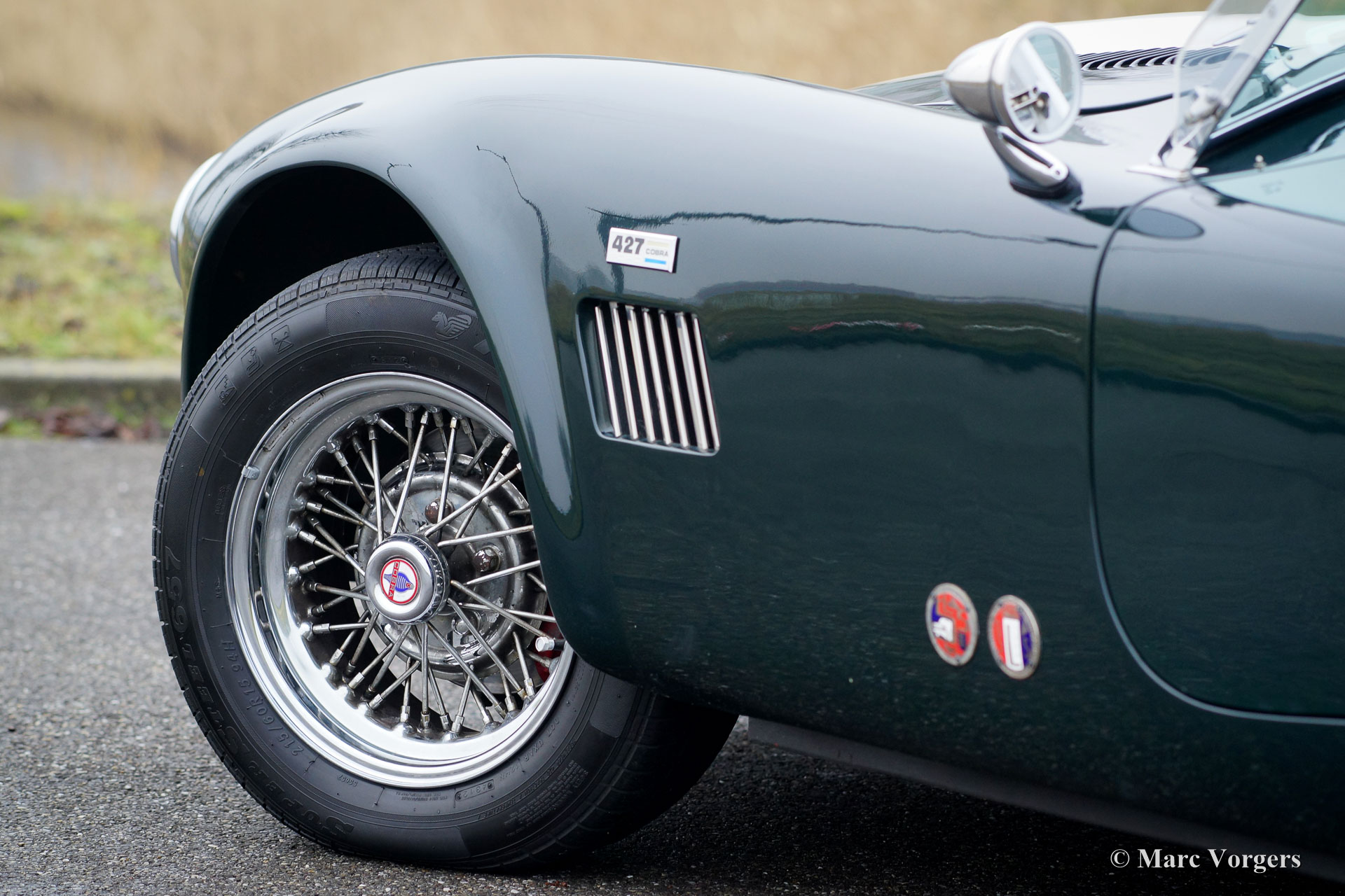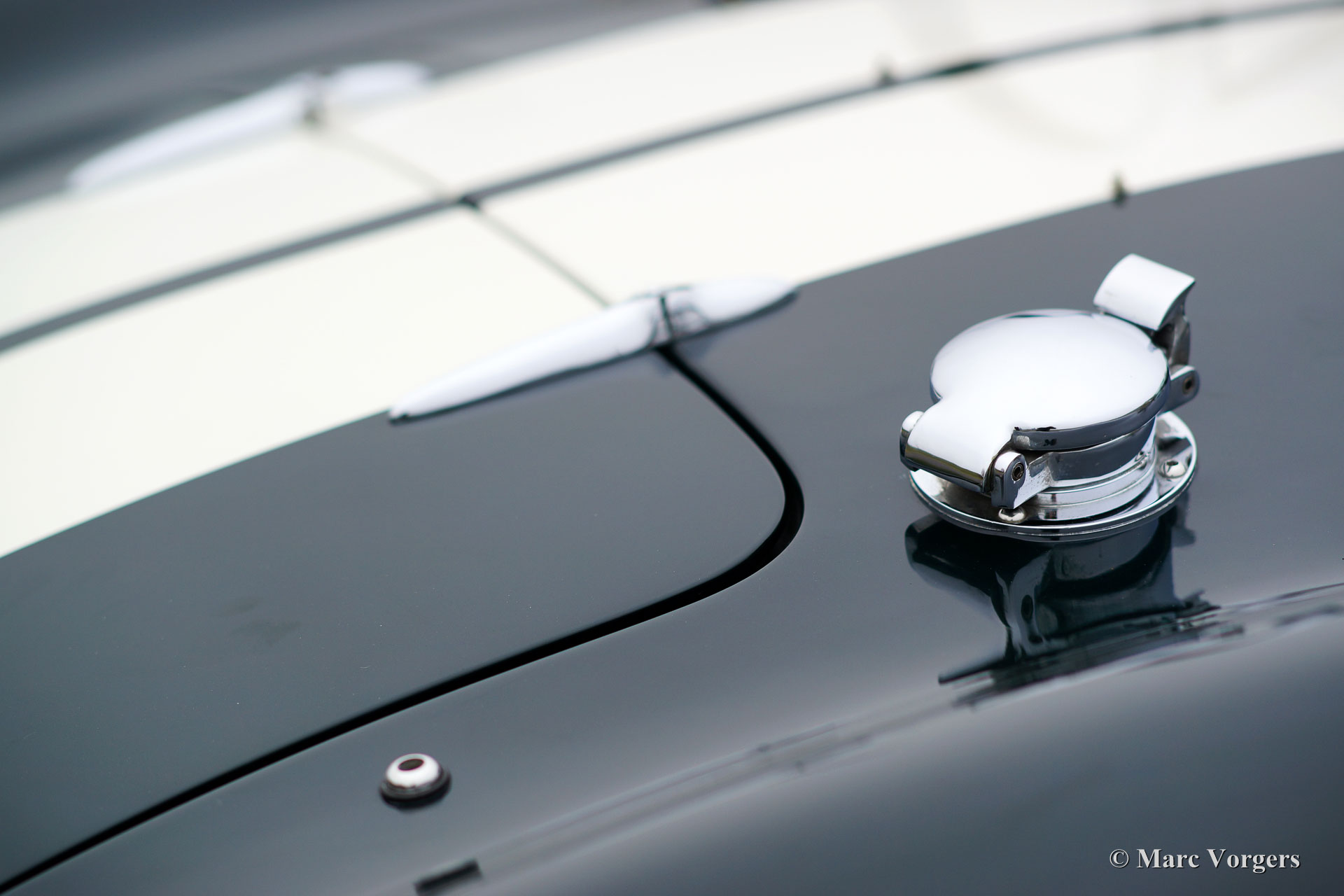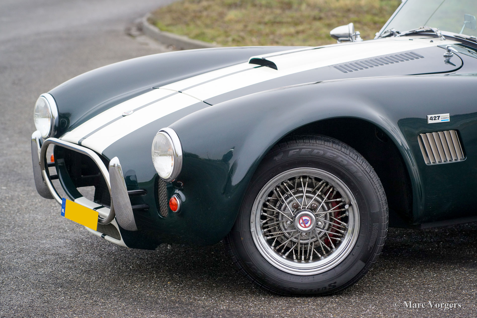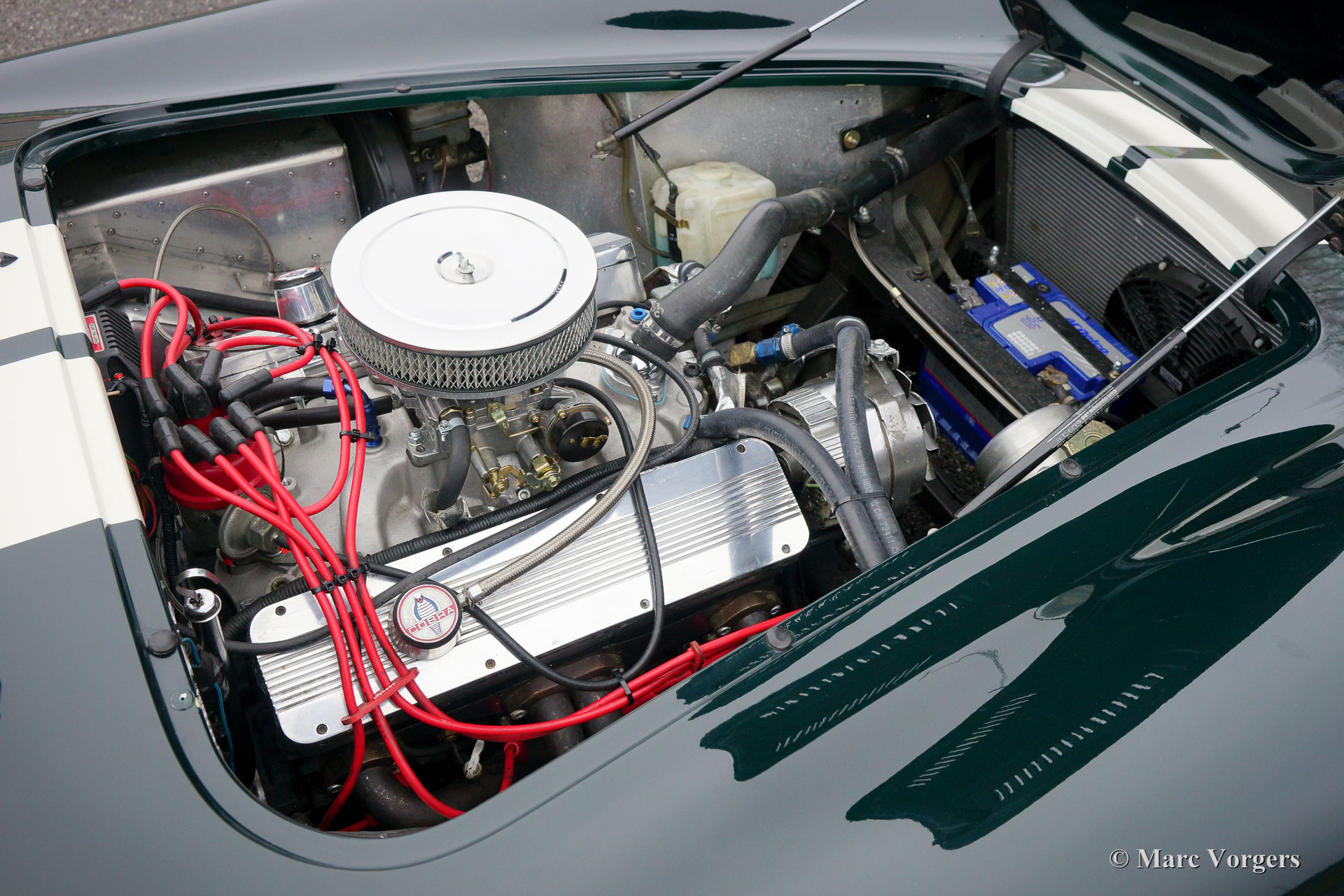 Dax Cobra Tojeiro, année 1991. Couleur vert foncé métallisé avec un intérieur en cuir vert. Couverture souple noire, vert foncé et un hard-top dans la couleur du corps. Le Dax Cobra est inspiré du légendaire AC Cobra 427 des années 60. Ce Dax Cobra a été construit aux Pays-Bas en utilisant des pièces de suspension Jaguar et essieu arrière et un moteur V8 de 5 litres de Chevrolet. Equipé d'une boîte de vitesses automatique avec levier de vitesses B & M. Ce Dax Cobra Tojeiro est une voiture impressionnante avec sa peinture vert foncé, rayures blanches et les roues de fil de chrome. Pour «booster» l'image encore plus la voiture vient avec un hard-top qui semble magnifique! La cabine est équipée d'un bouchon de remplissage rapide type Le Mans, de harnais de sécurité à 4 points, d'un volant sport avec jante en bois, d'une barre de roulement, de deux miroirs avertisseurs chromés, de déflecteurs de vent Perspex et d'un soleil Visières. La voiture est documentée avec les factures de service. Il s'agit d'un Cobra impressionnant avec une piste sonore Lusty V8!