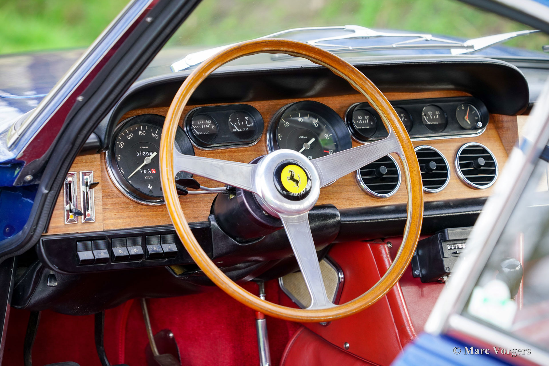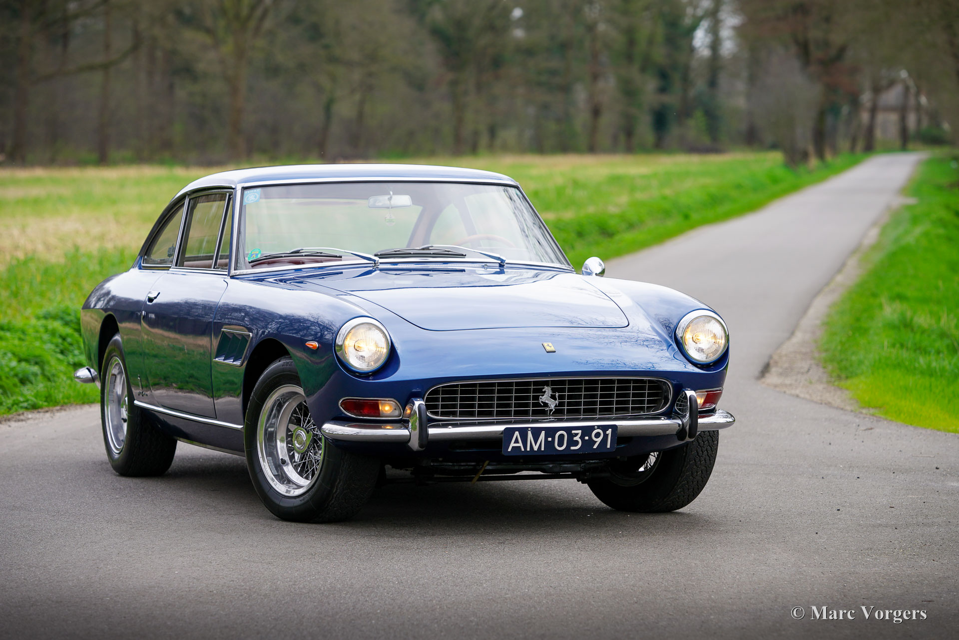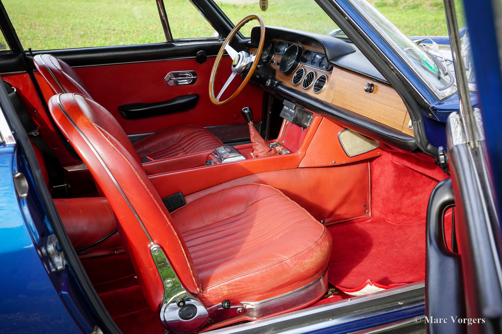 Ferrari 330 GT série 2, année 1966. Couleur bleu métallisé combinée à un intérieur en cuir rouge et un tapis rouge. Cette fabuleuse Ferrari 330 GT fut vendue neuve en Allemagne par Auto Becker à Düsseldorf. En Allemagne, l'automobile était chérie par deux propriétaires passionnés. À la fin des années 1990, la carrosserie fut partiellement restaurée et repeinte. Avec un compteur kilométrique d'environ 70 000 kilomètres, le moteur fut révisé par un spécialiste allemand Ferrari, une facture détaillée des travaux est présente. En 2002, la Ferrari trouve un nouveau propriétaire aux Pays-Bas et la voiture est inscrite au registre des 330 GT. En 2015, la voiture fut vendue via un partenaire ClassicarGarage au propriétaire actuel avec un compteur kilométrique de 76,930 kilomètres. Depuis 2018, la Ferrari est entretenue par S2 Classic Cars. Cette magnifique Ferrari 330 GT 2+2 est dans un très bon état et très original, et la voiture roule, sonne et se comporte de manière impressionnante ! Aujourd'hui, le compteur kilométrique indique 81,394 kilomètres. Depuis la révision du moteur à la fin des années 1990, la voiture a parcouru moins de 11,400 kilomètres. Le dernier voyage plus long (environ 1 600 kilomètres) a été une visite inoubliable au Goodwood Revival en septembre 2019. L'intérieur est toujours entièrement d'origine et en bel état, ne montrant que de légers signes d'utilisation antérieure. La voiture présente tous les détails d'origine, est équipée de roues à rayons Borrani, de pneus Michelin XWS, d'un chauffage de lunette arrière électrique d'origine, d'une boîte de vitesses manuelle à 5 rapports et de trois carburateurs Weber à double starter. De plus, un Retrotrip Tripmaster mécanique Brantz et une antenne automatique (motorisée) sont installés. La voiture est livrée avec un dossier historique et des manuels d’entretien et d’instructions. Il s’agit d’une très bonne Ferrari 330 GT 2+2 de 2ème série dans un état merveilleux. Une voiture rare (seulement 455 exemplaires construits), un investissement judicieux, une magnifique pièce du patrimoine Ferrari et une excellente voiture de pilote pour le passionné/collectionneur de Ferrari !