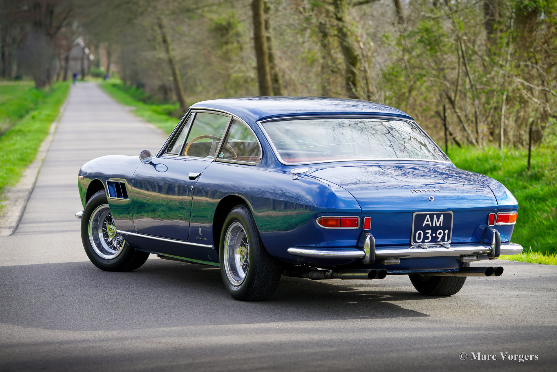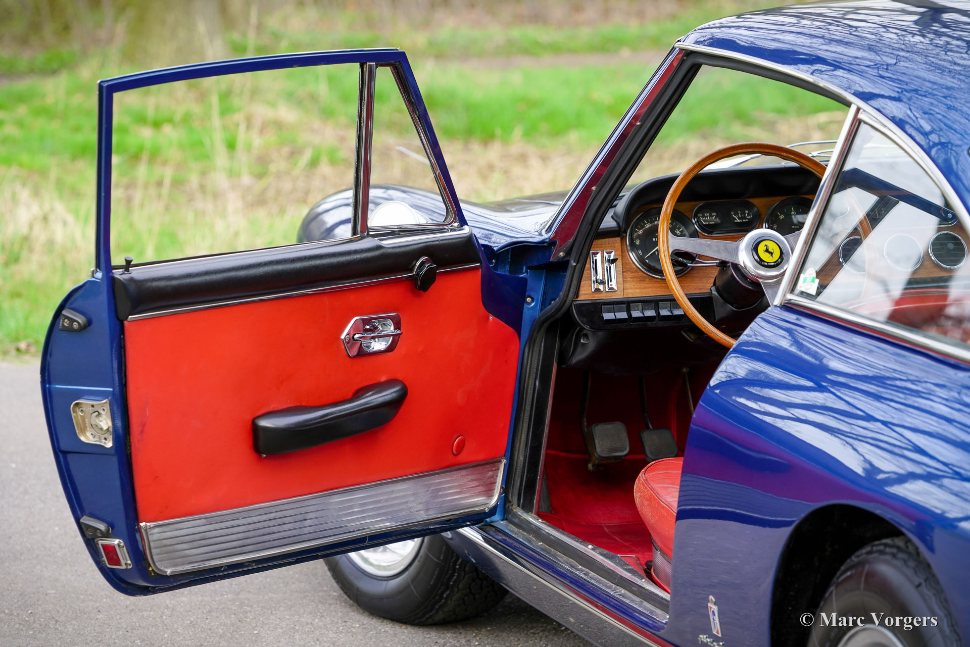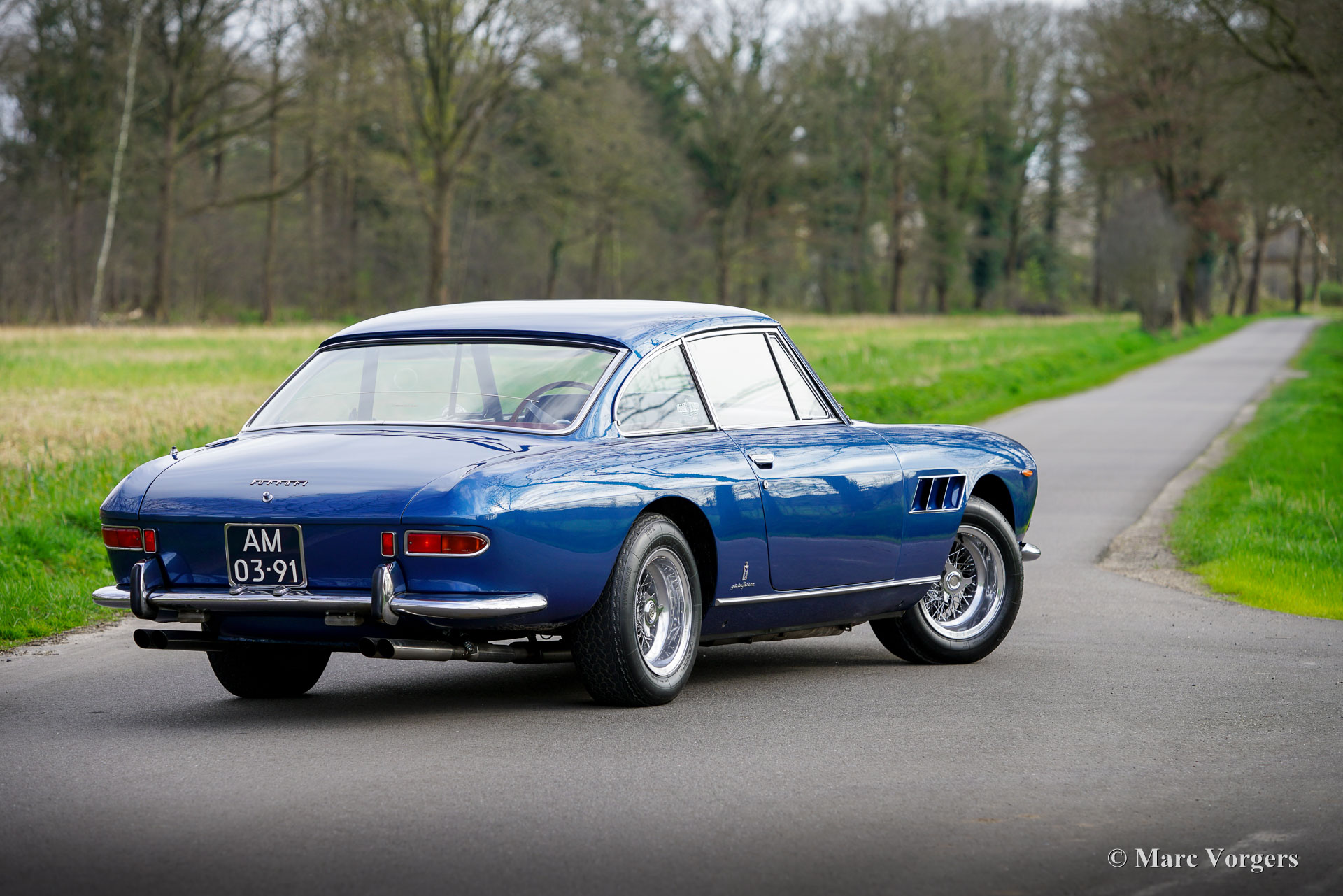 Ferrari 330 GT série 2, année 1966. Couleur bleu métallisé combinée à un intérieur en cuir rouge et un tapis rouge. Cette fabuleuse Ferrari 330 GT fut vendue neuve en Allemagne par Auto Becker à Düsseldorf. En Allemagne, l'automobile était chérie par deux propriétaires passionnés. À la fin des années 1990, la carrosserie fut partiellement restaurée et repeinte. Avec un compteur kilométrique d'environ 70 000 kilomètres, le moteur fut révisé par un spécialiste allemand Ferrari, une facture détaillée des travaux est présente. En 2002, la Ferrari trouve un nouveau propriétaire aux Pays-Bas et la voiture est inscrite au registre des 330 GT. En 2015, la voiture fut vendue via un partenaire ClassicarGarage au propriétaire actuel avec un compteur kilométrique de 76,930 kilomètres. Depuis 2018, la Ferrari est entretenue par S2 Classic Cars. Cette magnifique Ferrari 330 GT 2+2 est dans un très bon état et très original, et la voiture roule, sonne et se comporte de manière impressionnante ! Aujourd'hui, le compteur kilométrique indique 81,394 kilomètres. Depuis la révision du moteur à la fin des années 1990, la voiture a parcouru moins de 11,400 kilomètres. Le dernier voyage plus long (environ 1 600 kilomètres) a été une visite inoubliable au Goodwood Revival en septembre 2019. L'intérieur est toujours entièrement d'origine et en bel état, ne montrant que de légers signes d'utilisation antérieure. La voiture présente tous les détails d'origine, est équipée de roues à rayons Borrani, de pneus Michelin XWS, d'un chauffage de lunette arrière électrique d'origine, d'une boîte de vitesses manuelle à 5 rapports et de trois carburateurs Weber à double starter. De plus, un Retrotrip Tripmaster mécanique Brantz et une antenne automatique (motorisée) sont installés. La voiture est livrée avec un dossier historique et des manuels d’entretien et d’instructions. Il s’agit d’une très bonne Ferrari 330 GT 2+2 de 2ème série dans un état merveilleux. Une voiture rare (seulement 455 exemplaires construits), un investissement judicieux, une magnifique pièce du patrimoine Ferrari et une excellente voiture de pilote pour le passionné/collectionneur de Ferrari !