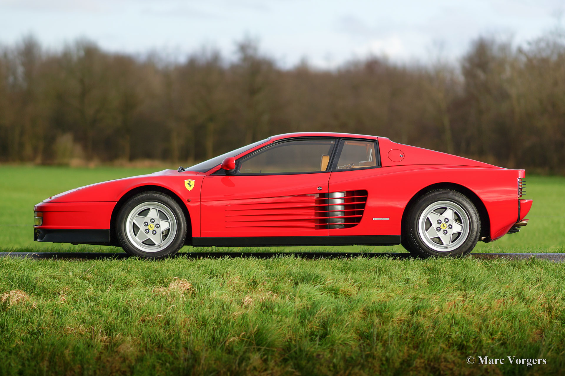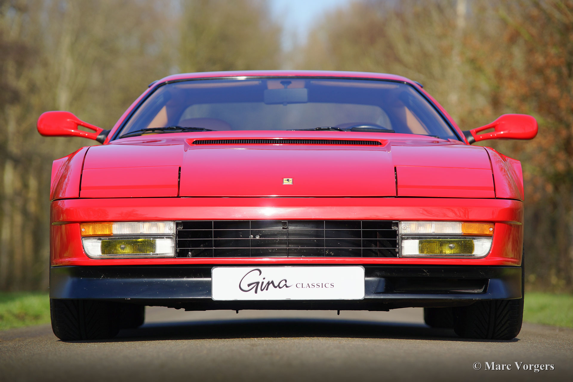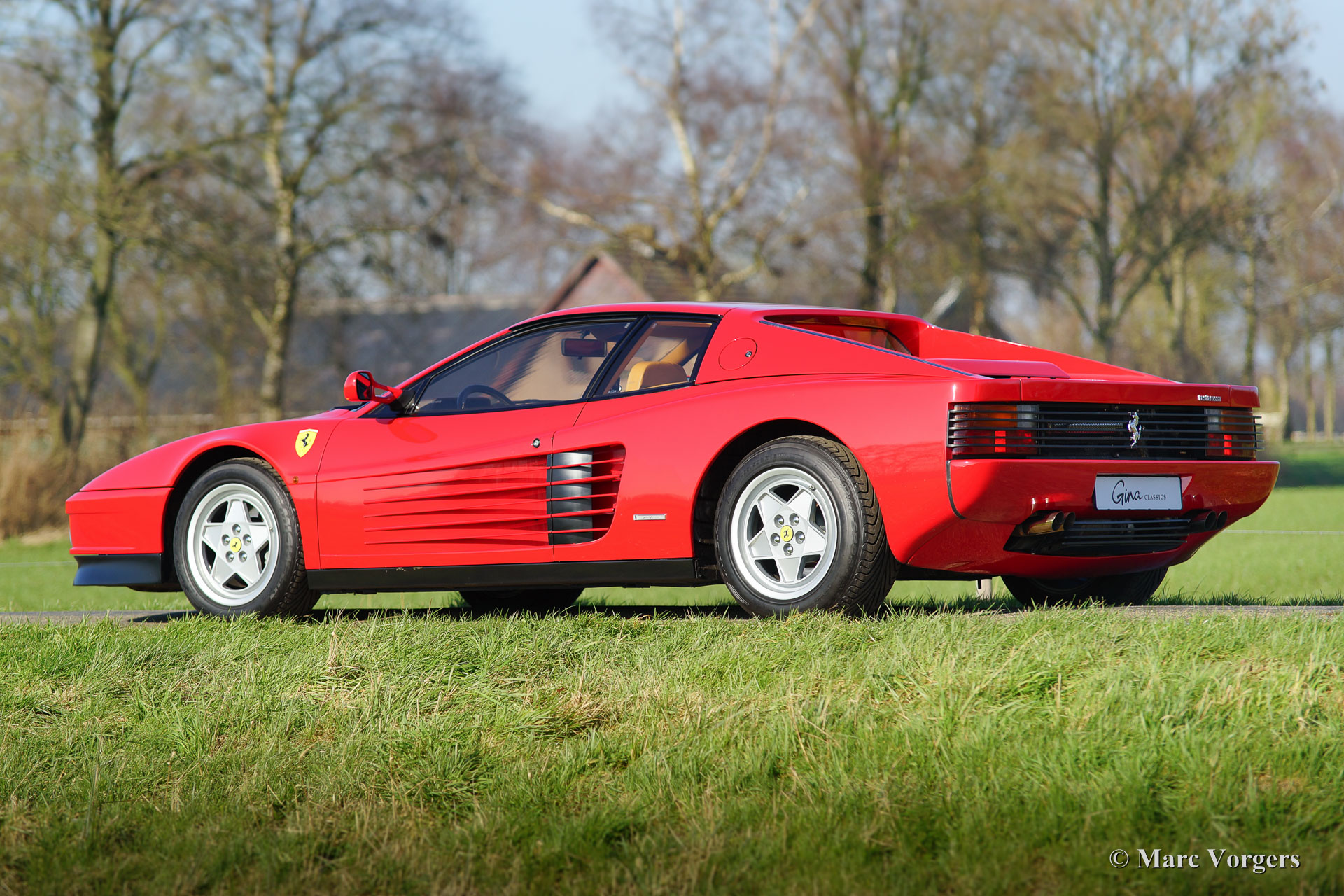 Ferrari Testarossa, année 1991. Couleur 'Rosso Corsa' (code couleur FER 300) avec un intérieur en cuir beige, avec de la moquette brune et tableau de bord brun.