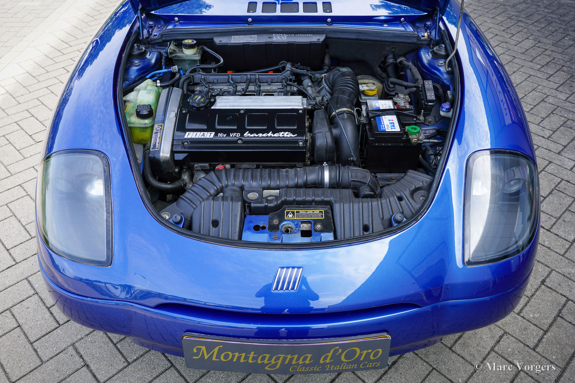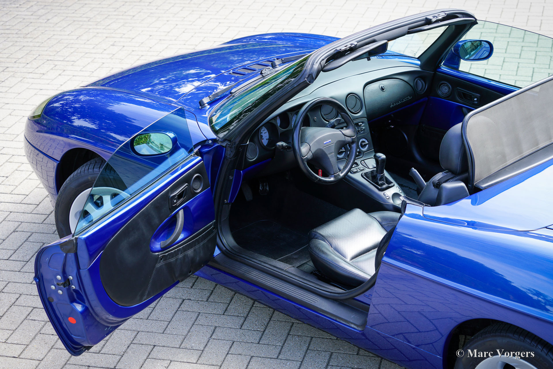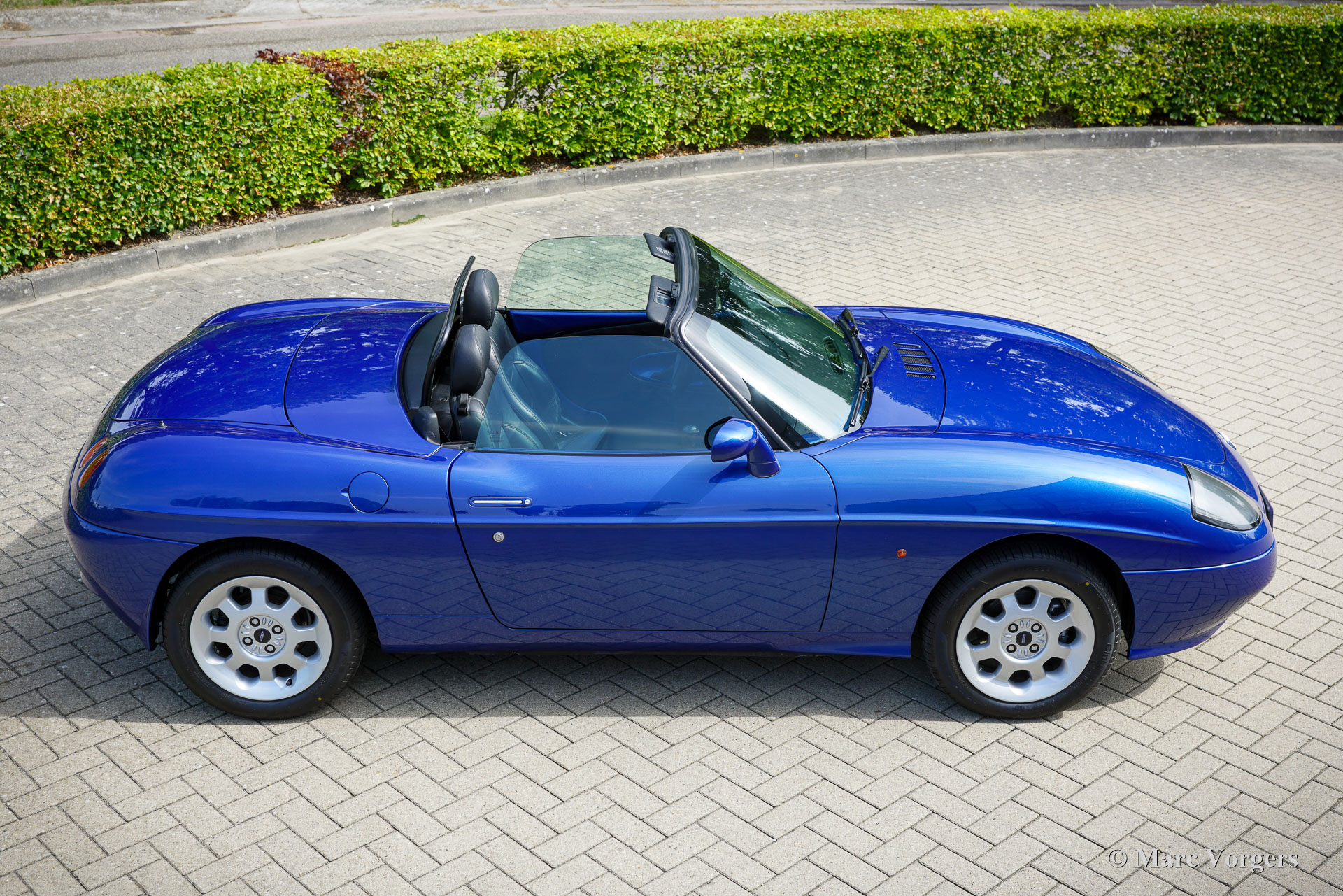 Fiat Barchetta, année 1999. Voiture de premier propriétaire, bleu foncé métallisé (Fiat Midnight blue 426) avec intérieur noir et sièges et volant en cuir noir. Cette magnifique Fiat Barchetta a parcouru 128,542 kilomètres entre les mains d'un propriétaire attentionné. Elle est entièrement documentée. Le dossier historique comprend la facture de vente originale émise par le représentant Fiat R. Rhee à Heemstede, aux Pays-Bas (aujourd'hui Mobility Group Haaker). La voiture fut vendue avec un « pack limité », comprenant notamment une sellerie cuir et un toit rigide couleur carrosserie, au prix de 65 038 florins néerlandais ! C'était plus que la Fiat la plus chère (la Fiat Coupé 20v Turbo), qui coûtait alors environ 51 000 florins néerlandais avec toutes les options possibles ! Cette superbe Fiat Barchetta est en très bon état, voire excellent, et roule parfaitement. Il y a environ deux ans, elle a bénéficié d'une peinture impeccable (reportage photo avec 40 photos), et la courroie de distribution a été remplacée il y a 2 000 kilomètres. L'intérieur noir présente de légères traces d'usure et la console centrale est en parfait état (pas de traces de frottement !). L'extérieur est impeccable : sous le capot et dans le coffre, tout est propre et net. Cette Barchetta est équipée d'une sellerie cuir, d'un volant et d'un levier de vitesses cuir, de vitres et de rétroviseurs électriques, de phares antibrouillards intégrés à l'avant et à l'arrière, d'un système audio Fiat, d'un pare-vent et de jantes alliage Fiat d'origine. Cette Fiat Barchetta, au style élégant et intemporel, est un fantastique décapotable à savourer pleinement !
