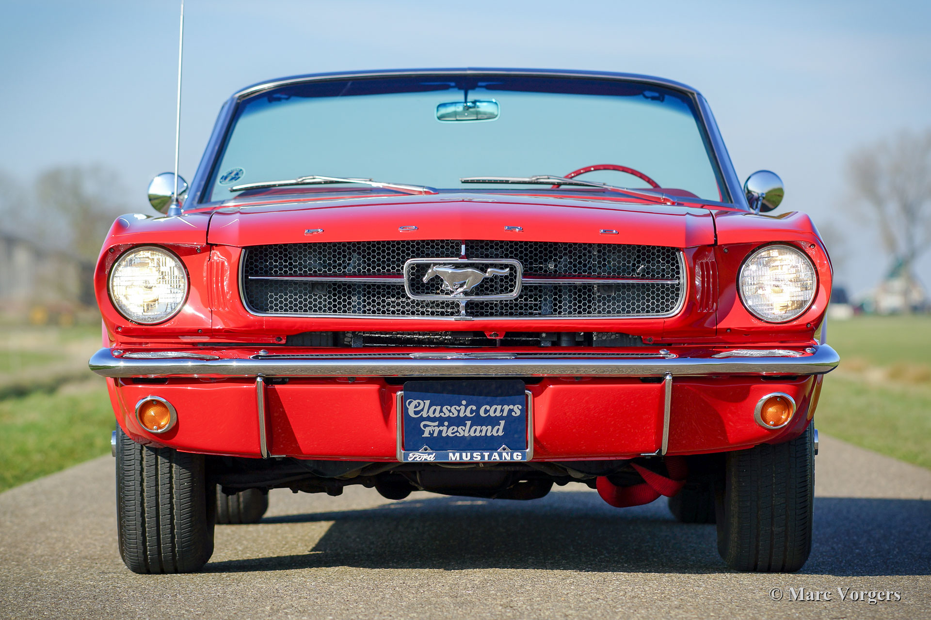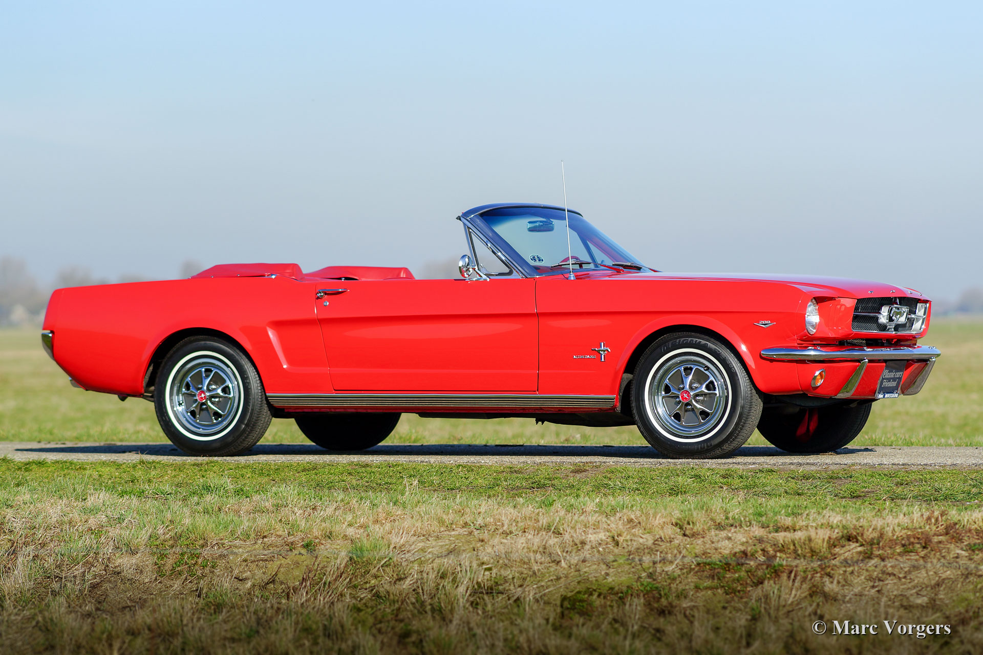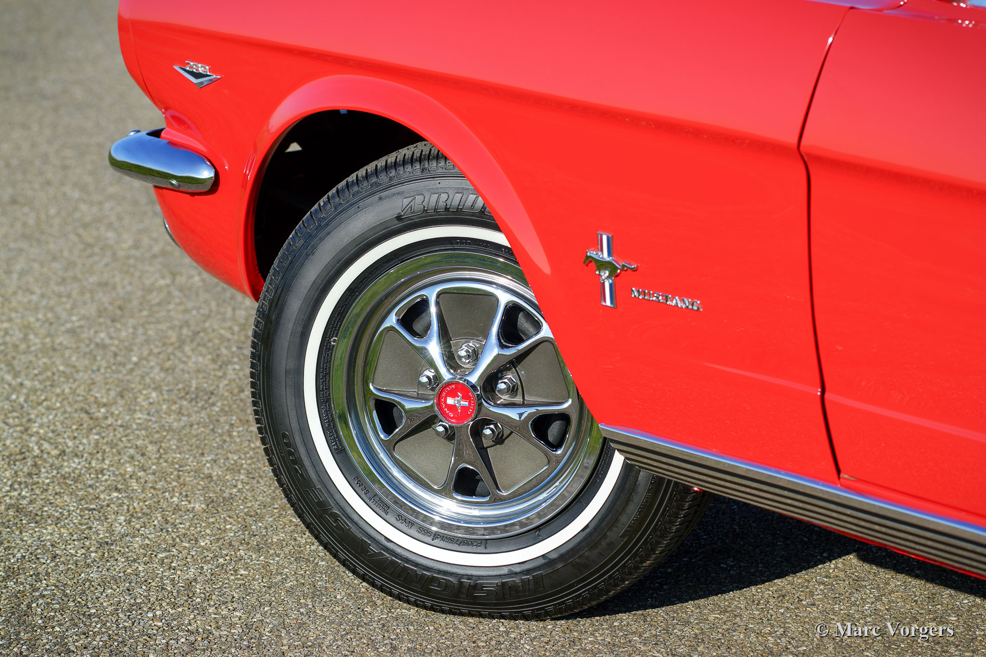 Ford Mustang 289 convertible, année 1965. Couleur rouge vif avec un intérieur en similicuir rouge et un tapis rouge. Capot noire et un couvercle de la hotte rouge. Cette fantastique Ford Mustang convertible fut restaurée de manière professionnelle et dans un état de superbe qualité de TOP : concours ! Il s’agit d’un modèle recherché du début de 1965 doté du puissant moteur V8 de 289 pouces cubes (4,7 litres) associé à une boîte automatique à 3 vitesses. Cette beauté dispose de la climatisation, d'un capot électrique et d'une boîte de vitesses automatique. Ceci est un exemple de classe TOP !