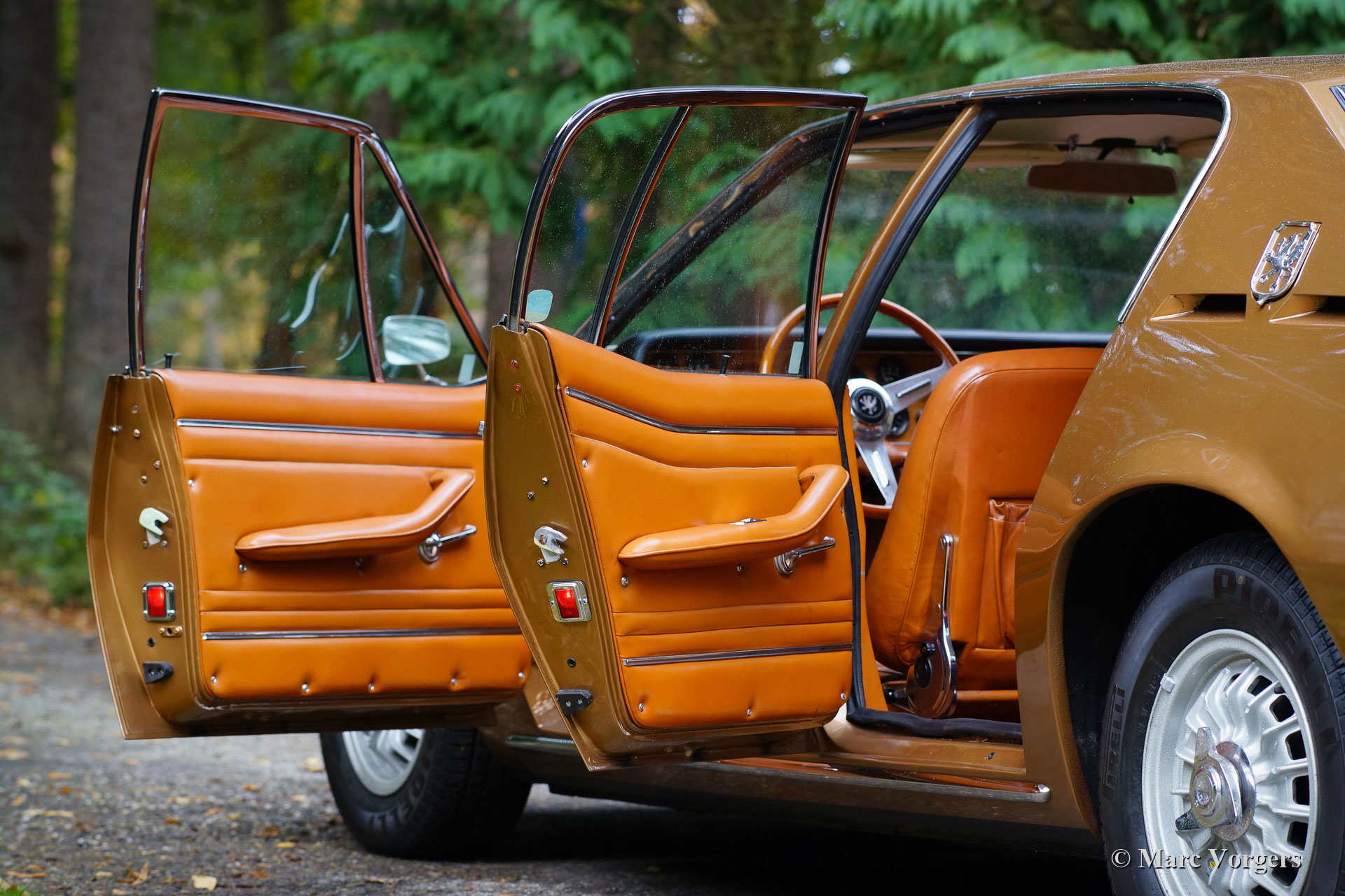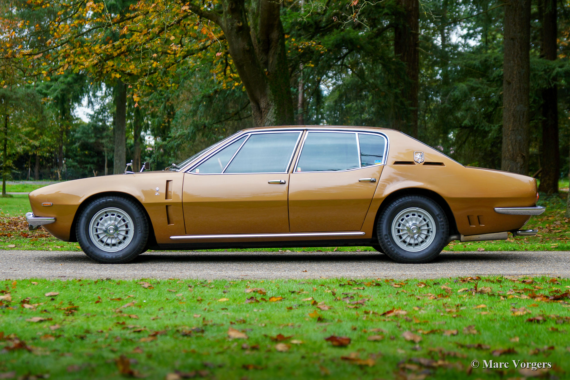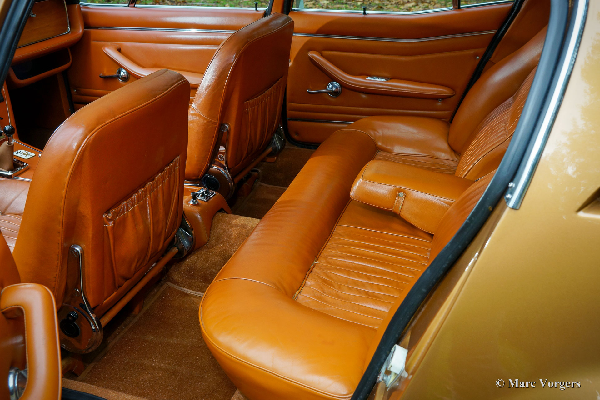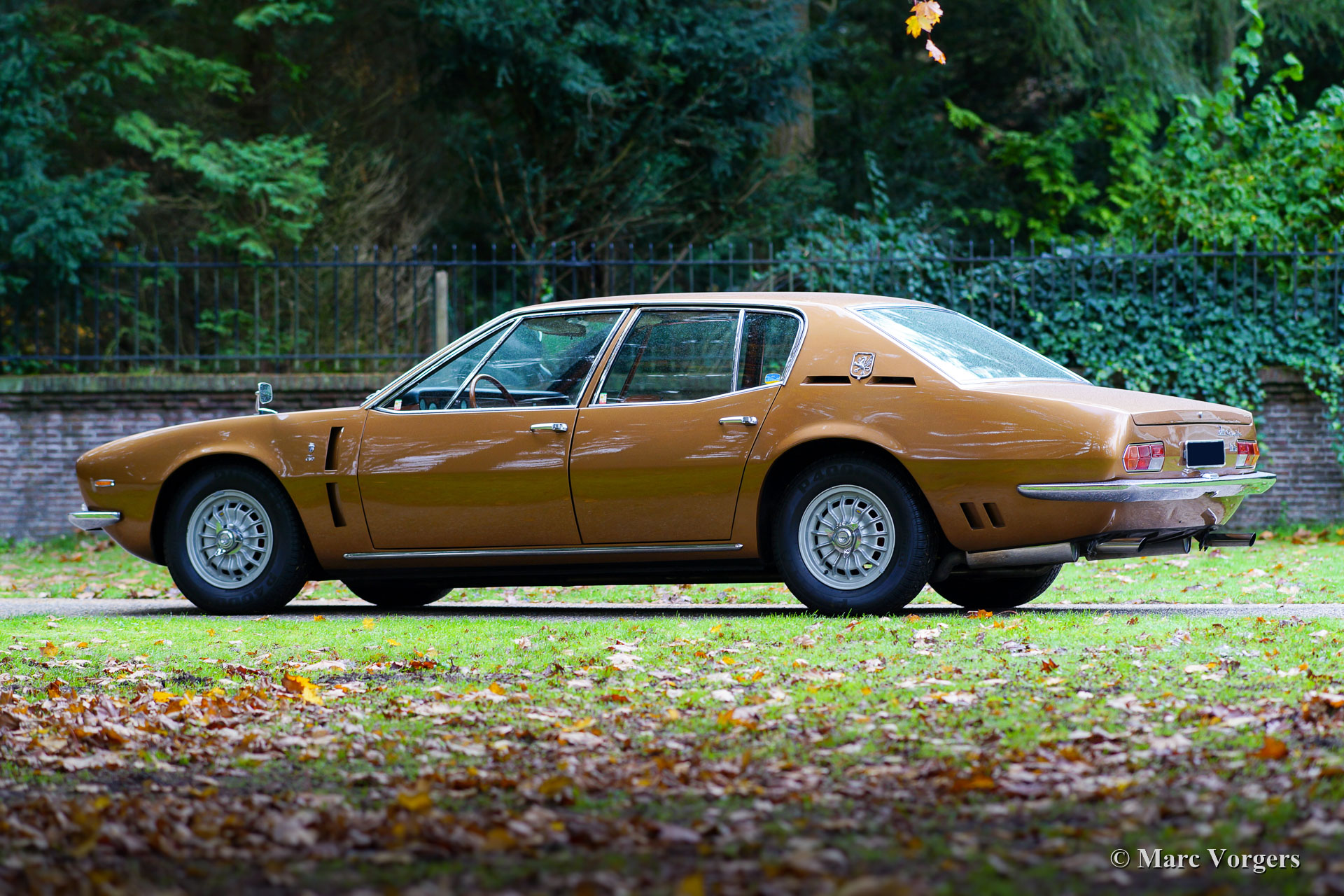 Iso Rivolta Fidia, année 1969. Couleur or / marron métallisé associée à un intérieur en cuir cognac et à un tapis marron clair. Cet impressionnant et très rare Iso Fidia a été vendu neuf en Suisse. En février 2015, l'automobile fut importée aux Pays-Bas. L'Iso Fidia est très rare, seuls 192 exemplaires furent construits de 1967 à 1974. L'Iso Fidia conçue par Giugiaro à Ghia était l'une des berlines à quatre portes les plus rapides de cette période. Comme les voitures de sport Iso Rivolta, la Fidia était également équipée de moteurs V8 Chevrolet (Corvette) robustes, fiables et très puissants (moteurs V8 Ford de 1973). Ce bel exemple est équipé d’un moteur V8 de 5,4 litres de Chevrolet couplé à une boîte de vitesses manuelle à quatre vitesses (tout synchronisé). L'essieu arrière est équipé d'un différentiel à glissement limité pour mettre correctement la puissance de 350 chevaux dans la rue. Cette Iso Fidia est en excellent état intérieur et extérieur et la voiture roule parfaitement ! Conduire une grande berline de luxe italienne à moteur V8 procure un sentiment très particulier. L'intérieur en cuir avec le tableau de bord en bois respire le luxe des années 1960, la direction assistée est un délice et le grondement du magnifique moteur V8 à l'arrière-plan complète l'expérience. La voiture est équipée de superbes jantes en alliage d’origine, de pneus Pirelli P4000 et d’une radio à cassettes stéréo Becker Mexico de première classe des années 1970. C’est un excellent exemple du très rare Iso Rivolta Fidia.