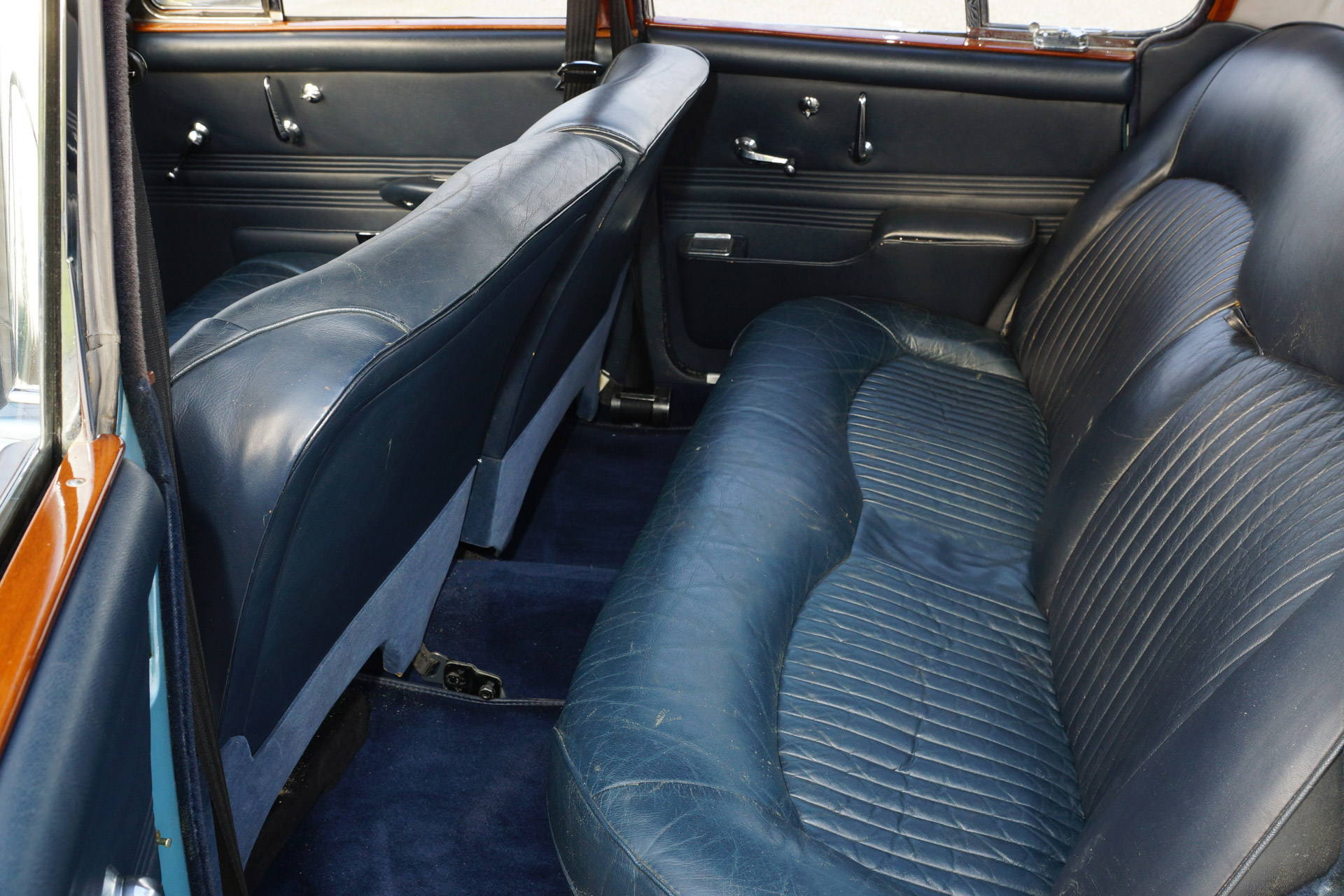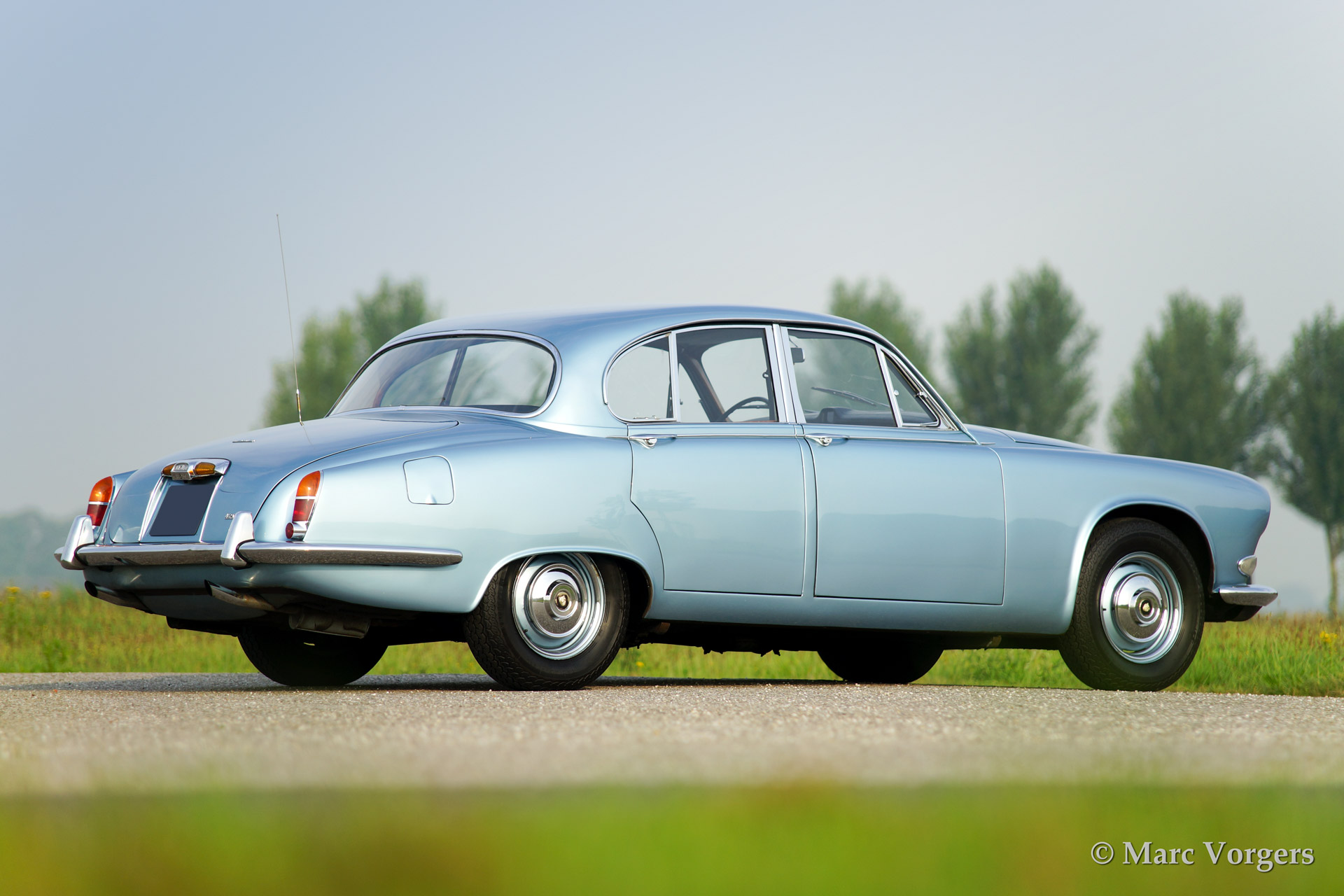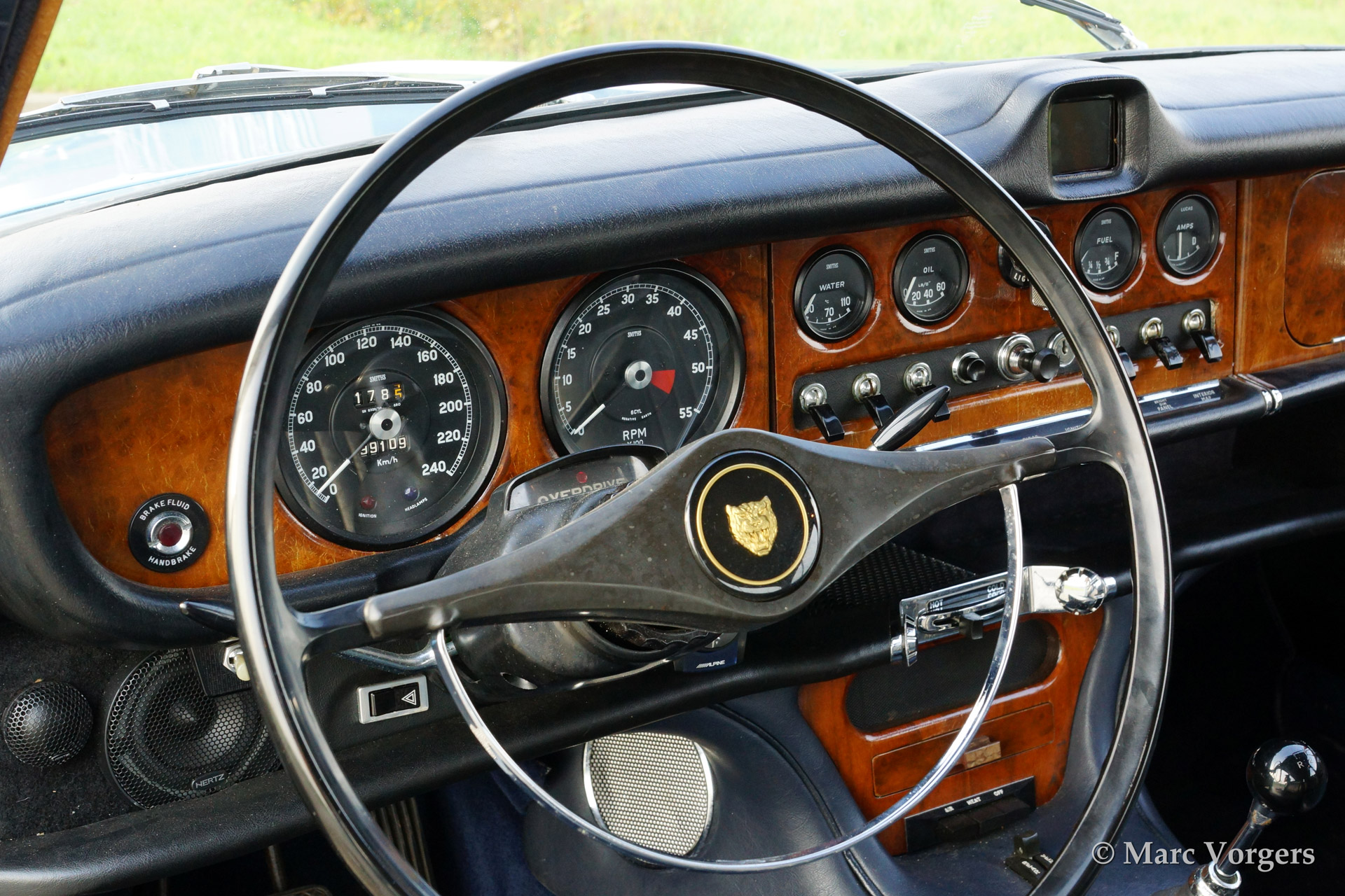 Jaguar 420, year 1969. Colour opalescent light blue (metallic) with a dark blue leather interior. The automobile has undergone partial restorations in the past, very good condition., This Jaguar 420 features a 4-speed manual gearbox and overdrive, a delightful combination! Driving the 420 you can feel that the car is more refined than the older Mk II, especially because of the independent rear suspension and the better sound insulation. This 420 is fitted with hydraulic power steering and a modern hifi system with CD-changer of with an external display has been beautifully integrated in the dashboard.