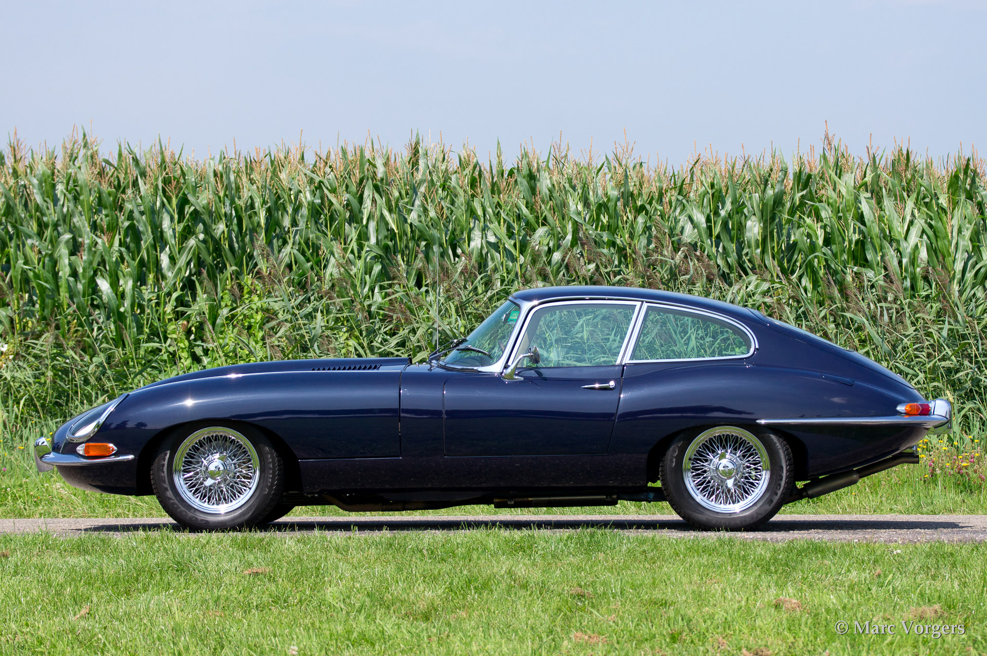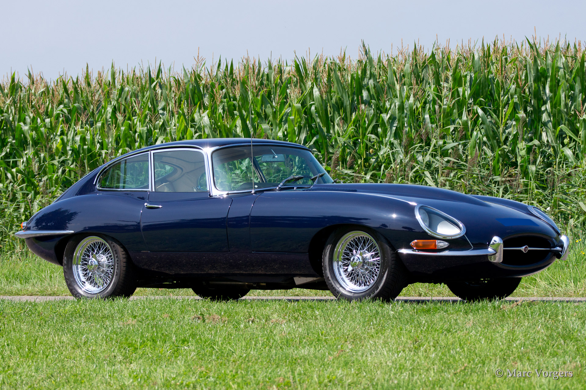 Jaguar E-type 3.8 Litre FHC series 1, year 1962. Colour dark blue with a tan (beige) leather interior. This very beautiful series 1 Jaguar E-type Fixed Head Coupe was fully restored in the year 2004. This magnificent E-type features wide chrome wire wheels, radio, high torque starter engine, AC generator, Stainless Steel exhaust and a map reading lamp.
