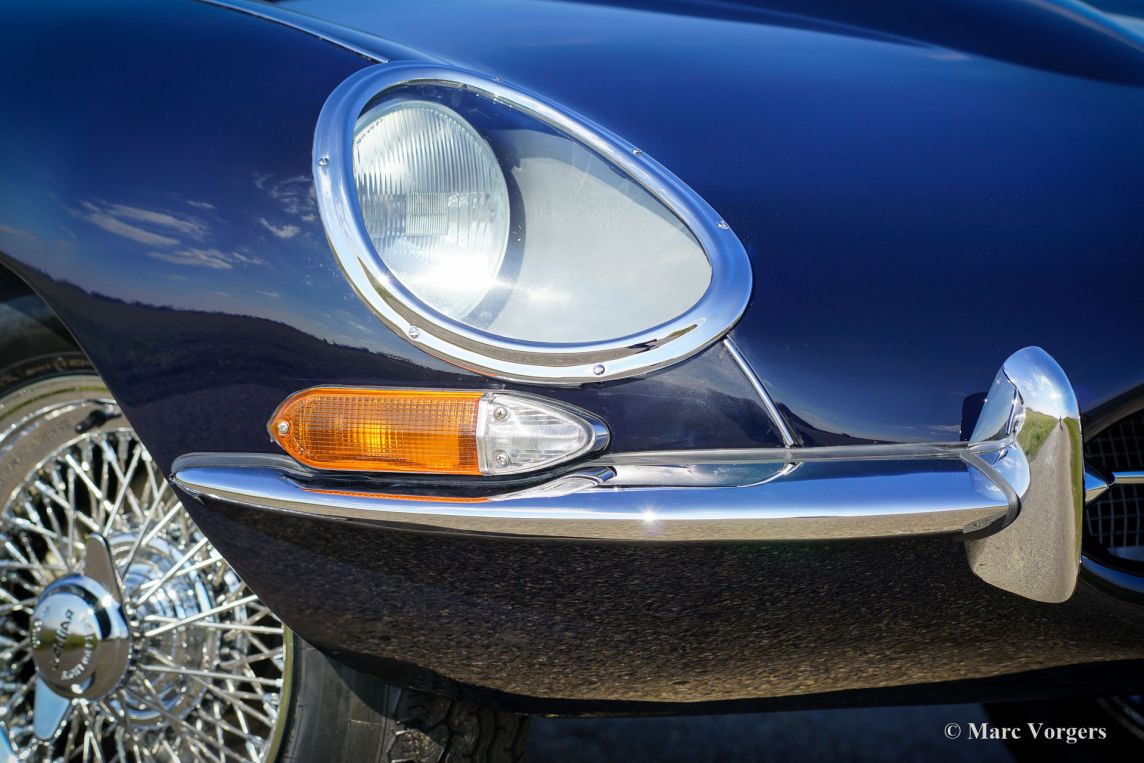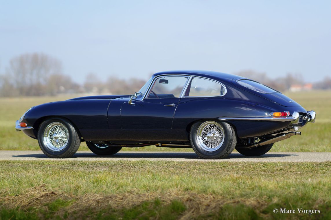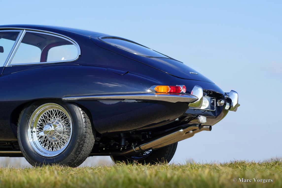 The design of the E-Type series as it was introduced in 1961 is of almost unearthly beauty. Look at all the refined details: the bonnet, the headlights, the back lights, the recess for the wheel housing and the back side, and you will realize that you are looking at absolute, timeless beauty in automobile design.