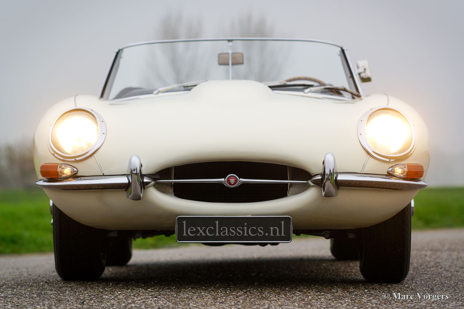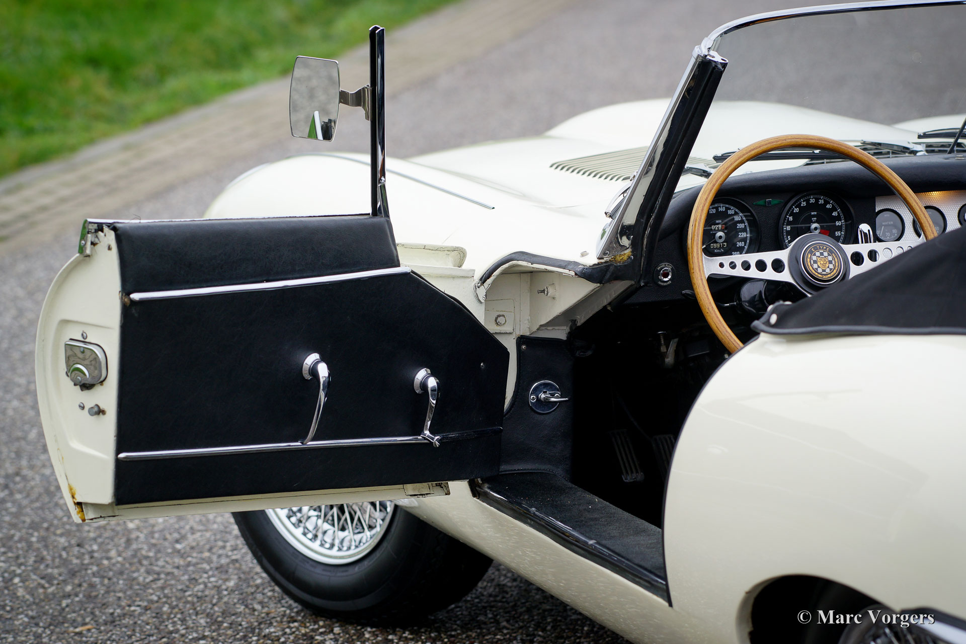 Jaguar E-Type 3,8 litre OTS série 1, année 1962. Couleur blanc (Old English White) avec un intérieur en cuir noir et tapis noir. Capot et capuche en mohair noir. Cette magnifique Jaguar E-Type OTS (Open Two Seater, également nommée Roadster) fut vendue neuve par Stanley's Motor Services à Sheffield à un citoyen américain qui a fait livrer la voiture à Monaco. La facture de vente originale est présente ! En 1973, la voiture a changé de mains et fut exportée en Grande-Bretagne. En 2005, la voiture fut achetée par un passionné de Jaguar des Pays-Bas. Cette belle Jaguar E-Type est dans un très bon état du conducteur montrant de légers signes d'utilisation et de l'âge. La voiture roule superbement et le puissant moteur de 3,8 litres est un pur délice ! L'E-Type comporte des roues à rayons de fil chromées, des écrous de roue chromés «knock-off», un échappement en acier inoxydable et un allumage électronique.