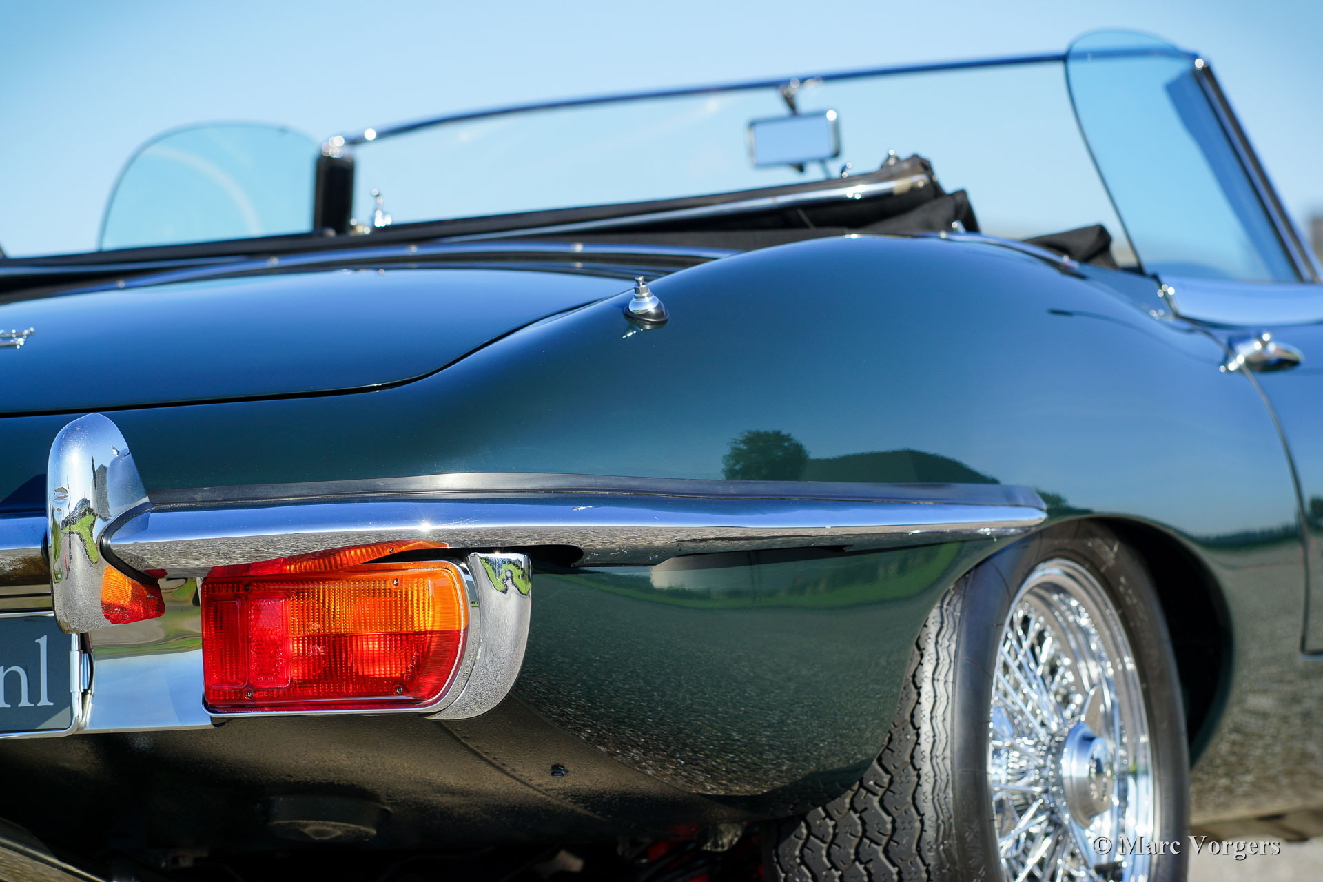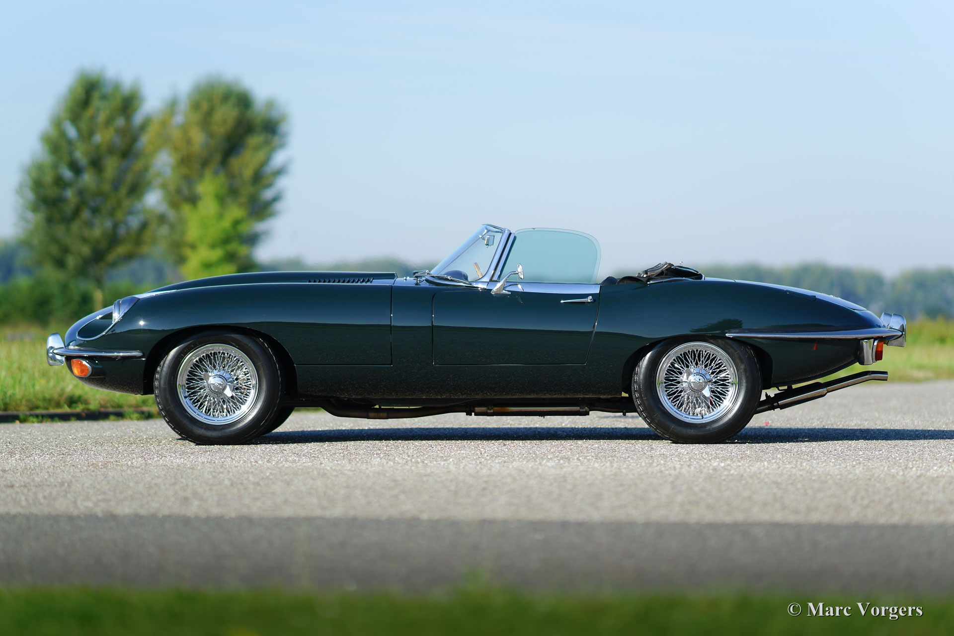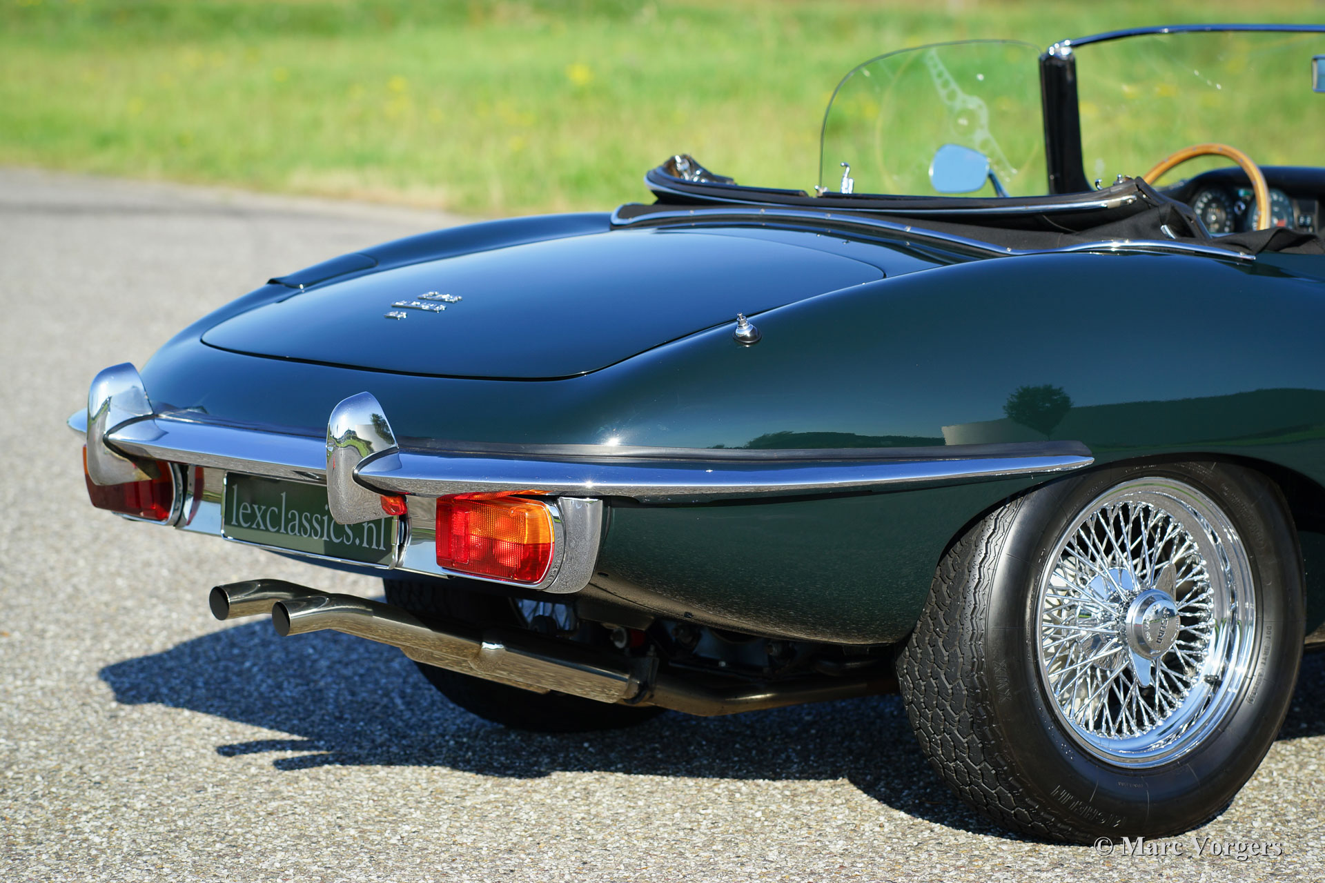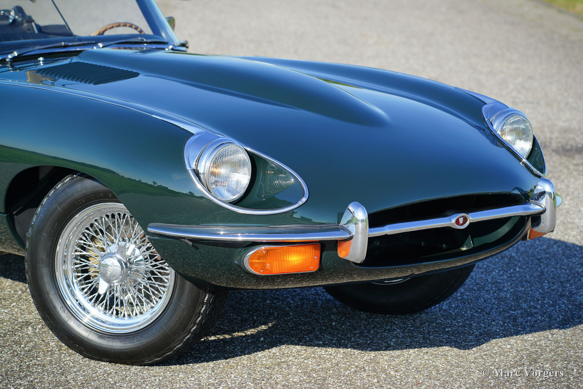 Jaguar E-Type 4.2 Litre OTS série 2, année 1970. Couleur British Racing Green avec un intérieur cuir noir et tapis. Capot mohair noir et le couvercle de la hotte noir. Cette impressionnante Jaguar E-Type 4.2 Litre Open Two Seater (OTS, également appelé Roadster), a été restaure détaillée et « body-off » dans le passé. Plus récemment, la voiture a été donné une nouvelle peinture parfaite commandée par Lex Classics. Photos de cette restauration partielle sont présents. Cette très belle Jaguar E-type a été caressé par un seul propriétaire depuis 25 ans ; la voiture est en superbe état ! La voiture dispose des roues larges en de fil de chrome, chrome écrous de roue ‘knock-off’, un ‘trip master’ et de radio avec antenne. Un Jaguar E-type magnifique et une merveilleuse voiture de pilote !