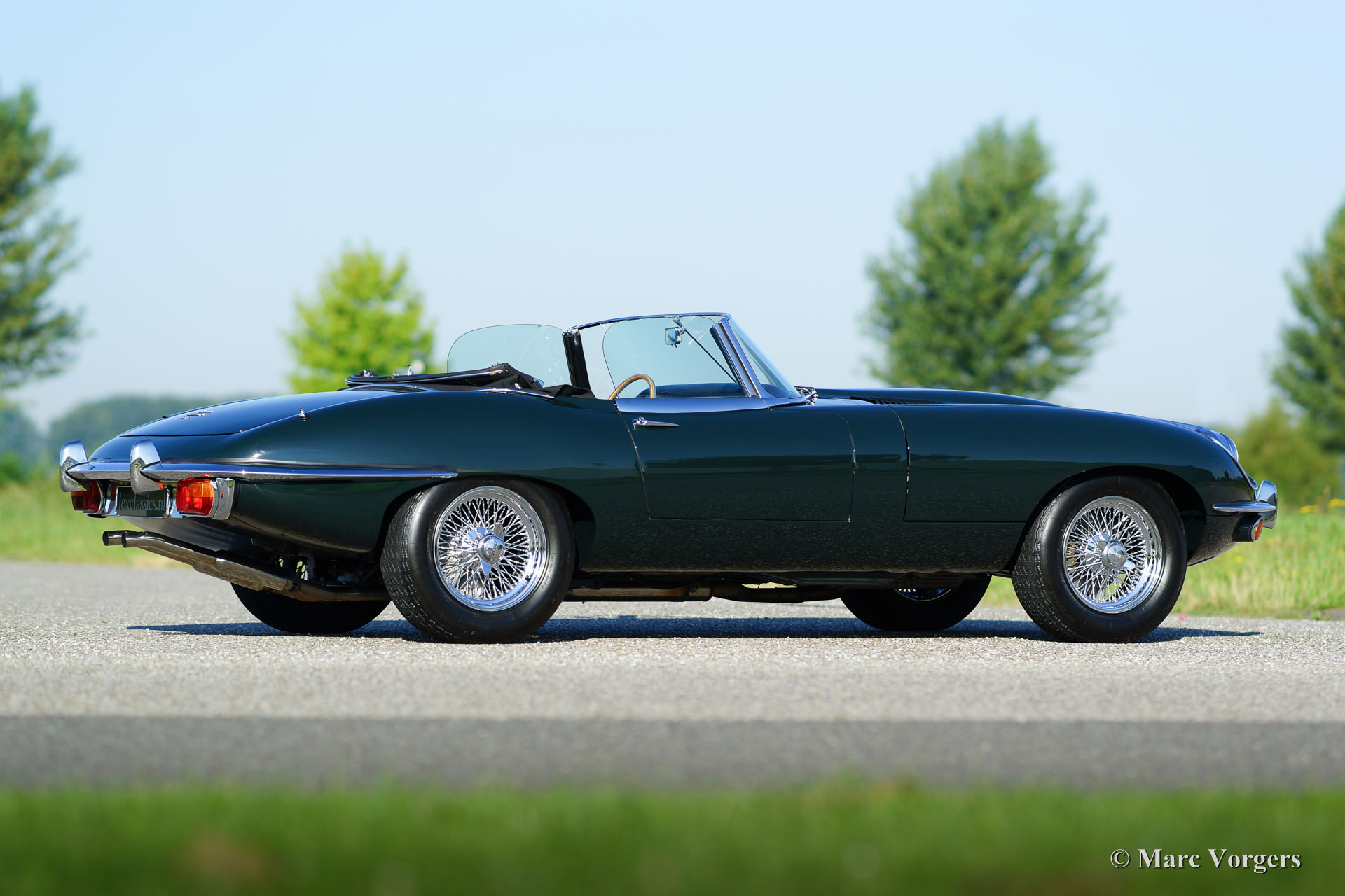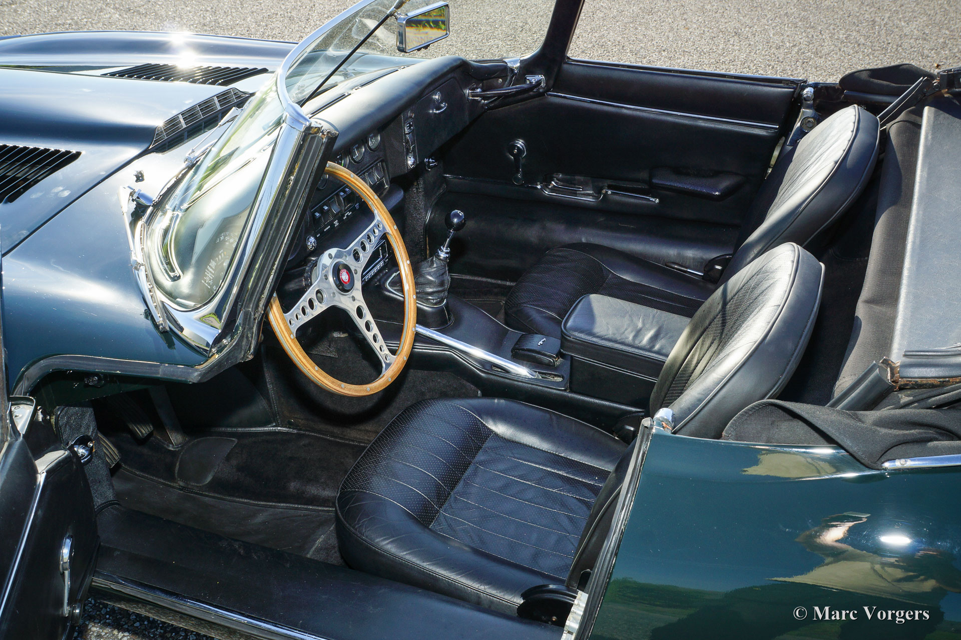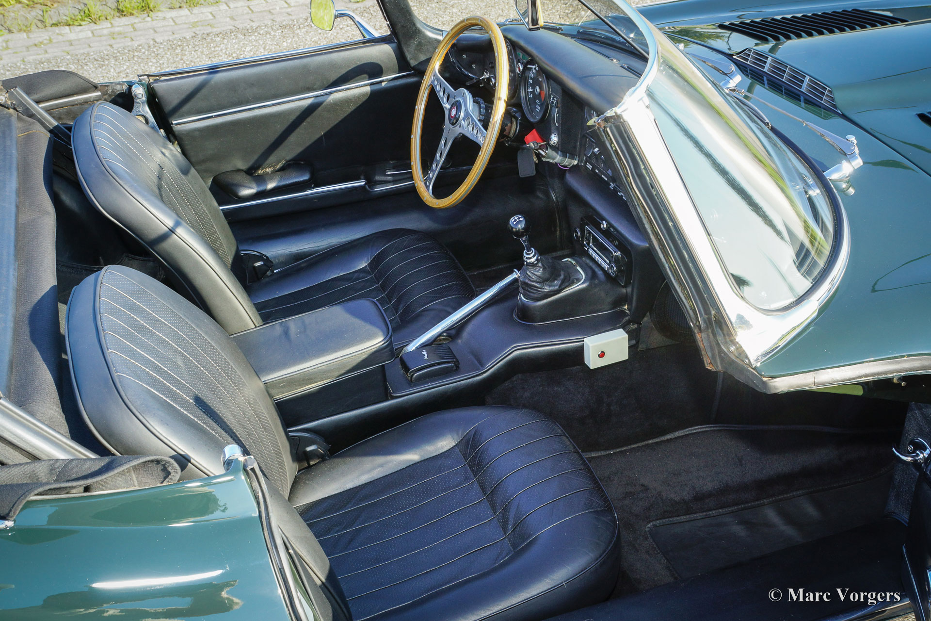 Jaguar E-Type 4.2 Litre OTS série 2, année 1970. Couleur British Racing Green avec un intérieur cuir noir et tapis. Capot mohair noir et le couvercle de la hotte noir. Cette impressionnante Jaguar E-Type 4.2 Litre Open Two Seater (OTS, également appelé Roadster), a été restaure détaillée et « body-off » dans le passé. Plus récemment, la voiture a été donné une nouvelle peinture parfaite commandée par Lex Classics. Photos de cette restauration partielle sont présents. Cette très belle Jaguar E-type a été caressé par un seul propriétaire depuis 25 ans ; la voiture est en superbe état ! La voiture dispose des roues larges en de fil de chrome, chrome écrous de roue ‘knock-off’, un ‘trip master’ et de radio avec antenne. Un Jaguar E-type magnifique et une merveilleuse voiture de pilote !
