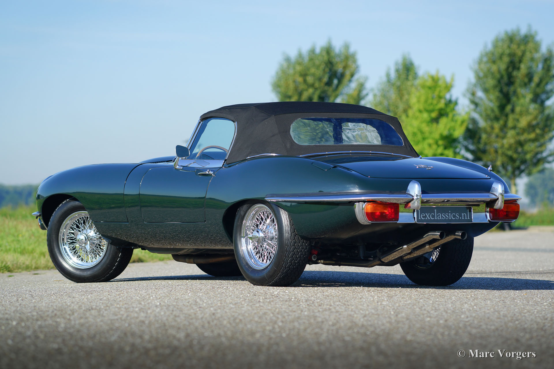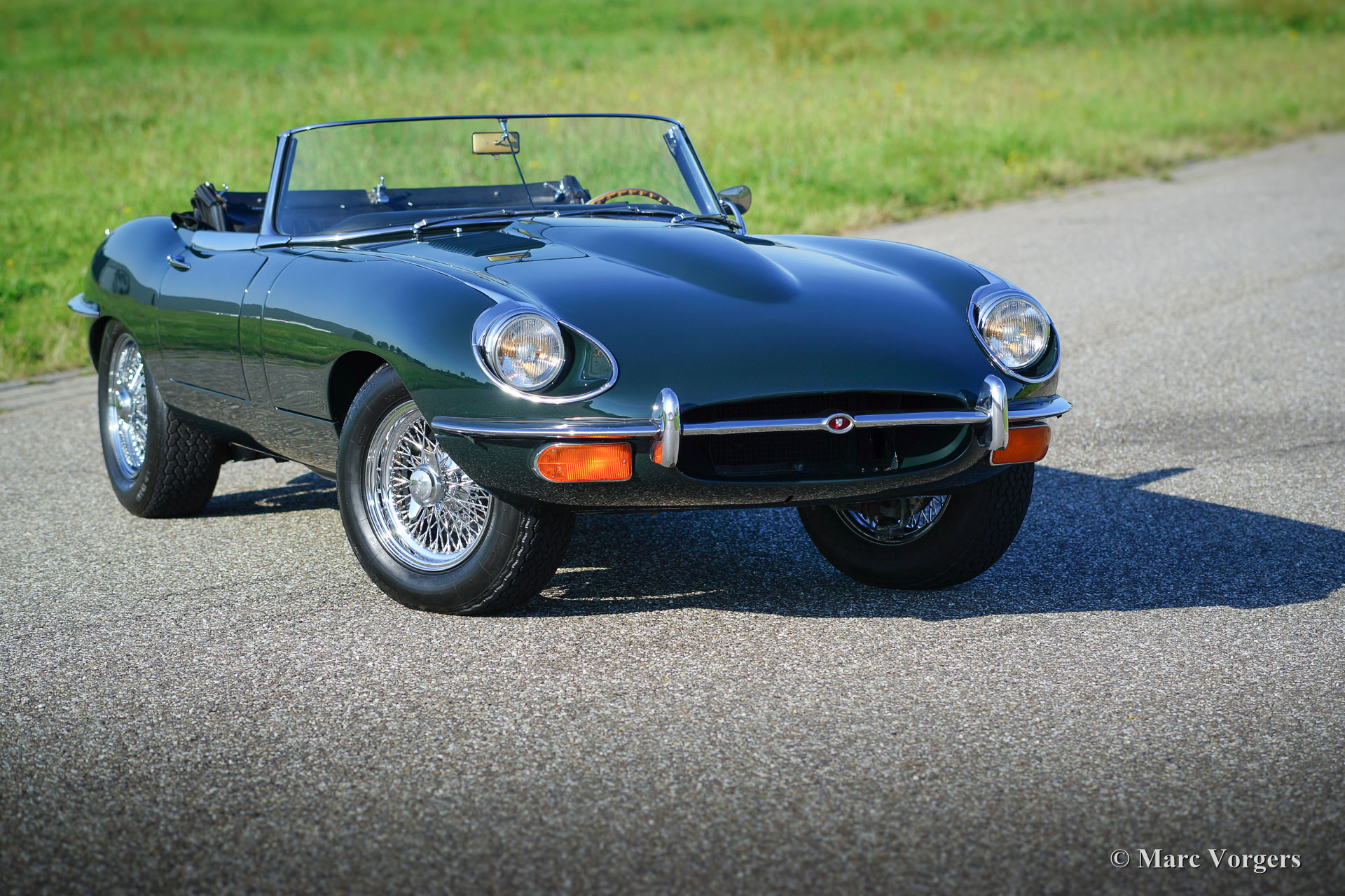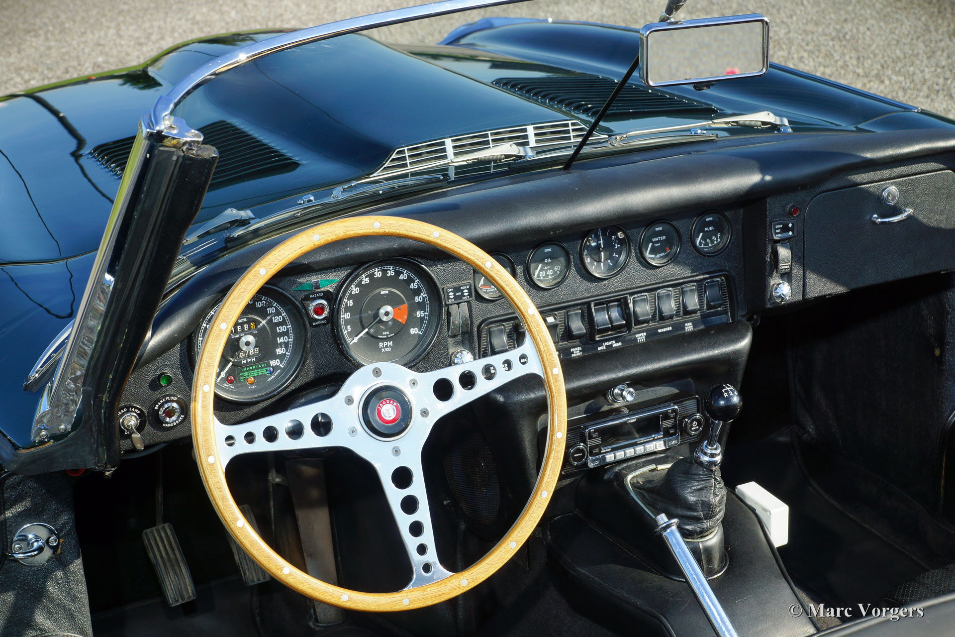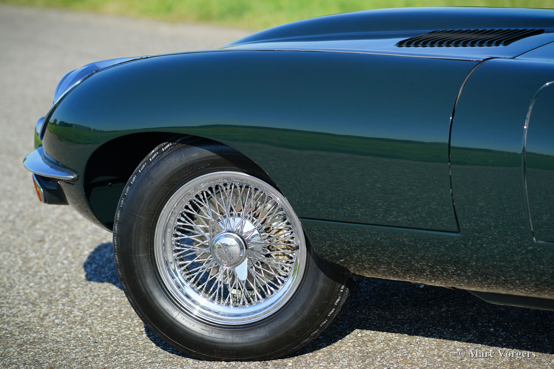 Jaguar E-Type 4.2 Litre OTS série 2, année 1970. Couleur British Racing Green avec un intérieur cuir noir et tapis. Capot mohair noir et le couvercle de la hotte noir. Cette impressionnante Jaguar E-Type 4.2 Litre Open Two Seater (OTS, également appelé Roadster), a été restaure détaillée et « body-off » dans le passé. Plus récemment, la voiture a été donné une nouvelle peinture parfaite commandée par Lex Classics. Photos de cette restauration partielle sont présents. Cette très belle Jaguar E-type a été caressé par un seul propriétaire depuis 25 ans ; la voiture est en superbe état ! La voiture dispose des roues larges en de fil de chrome, chrome écrous de roue ‘knock-off’, un ‘trip master’ et de radio avec antenne. Un Jaguar E-type magnifique et une merveilleuse voiture de pilote !
