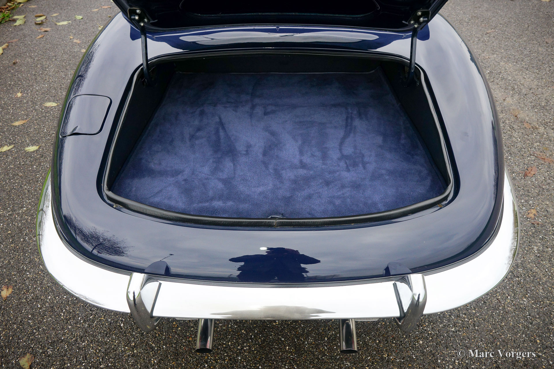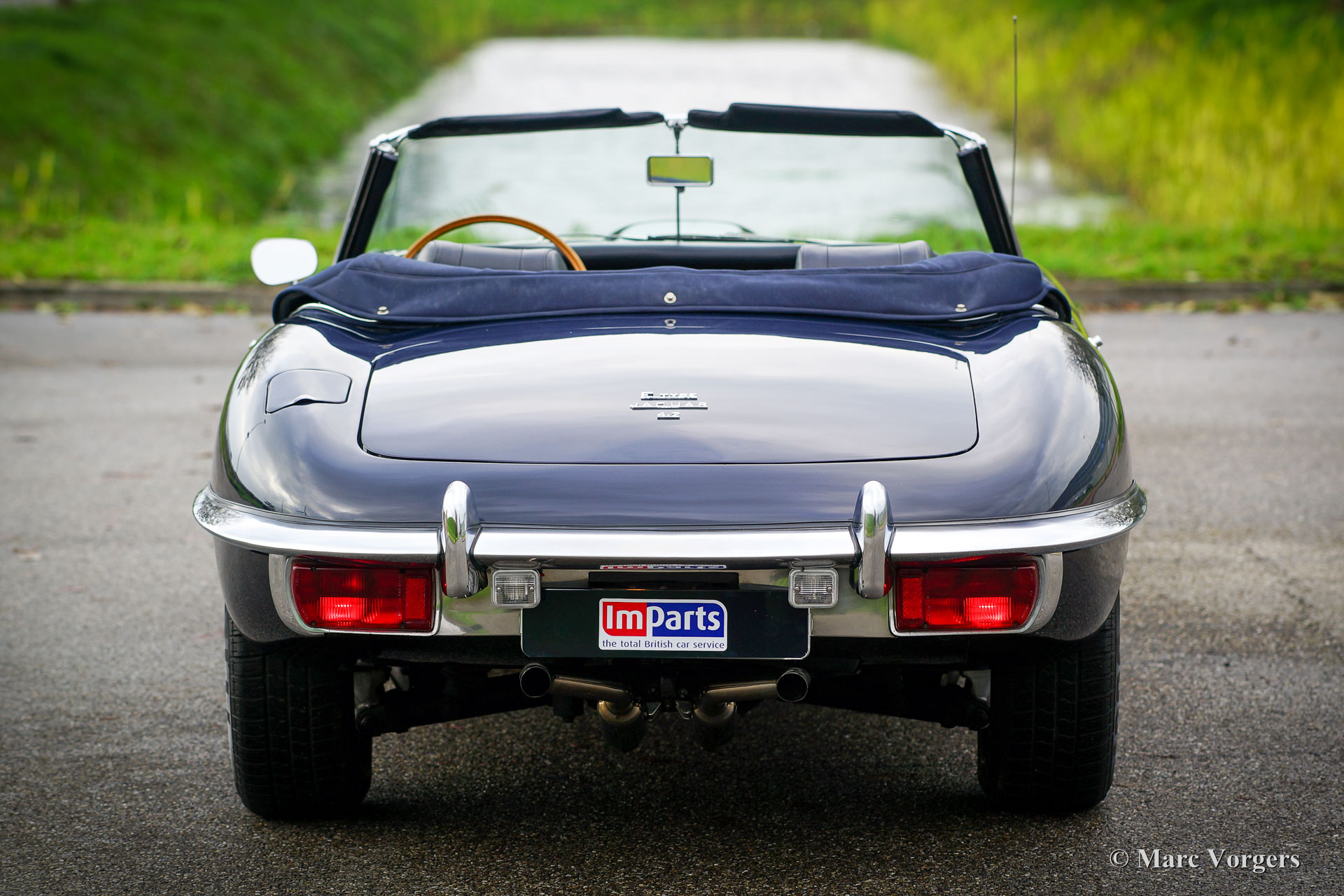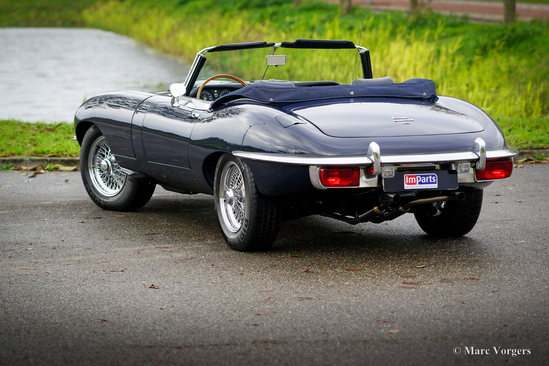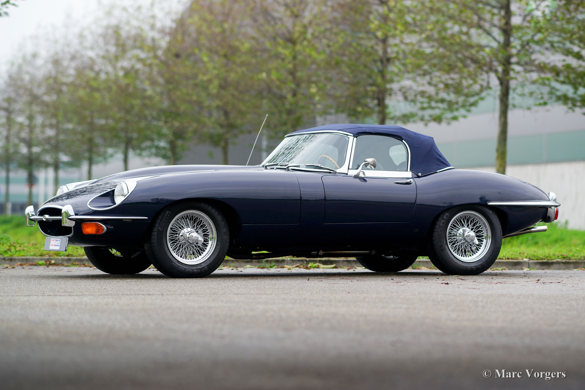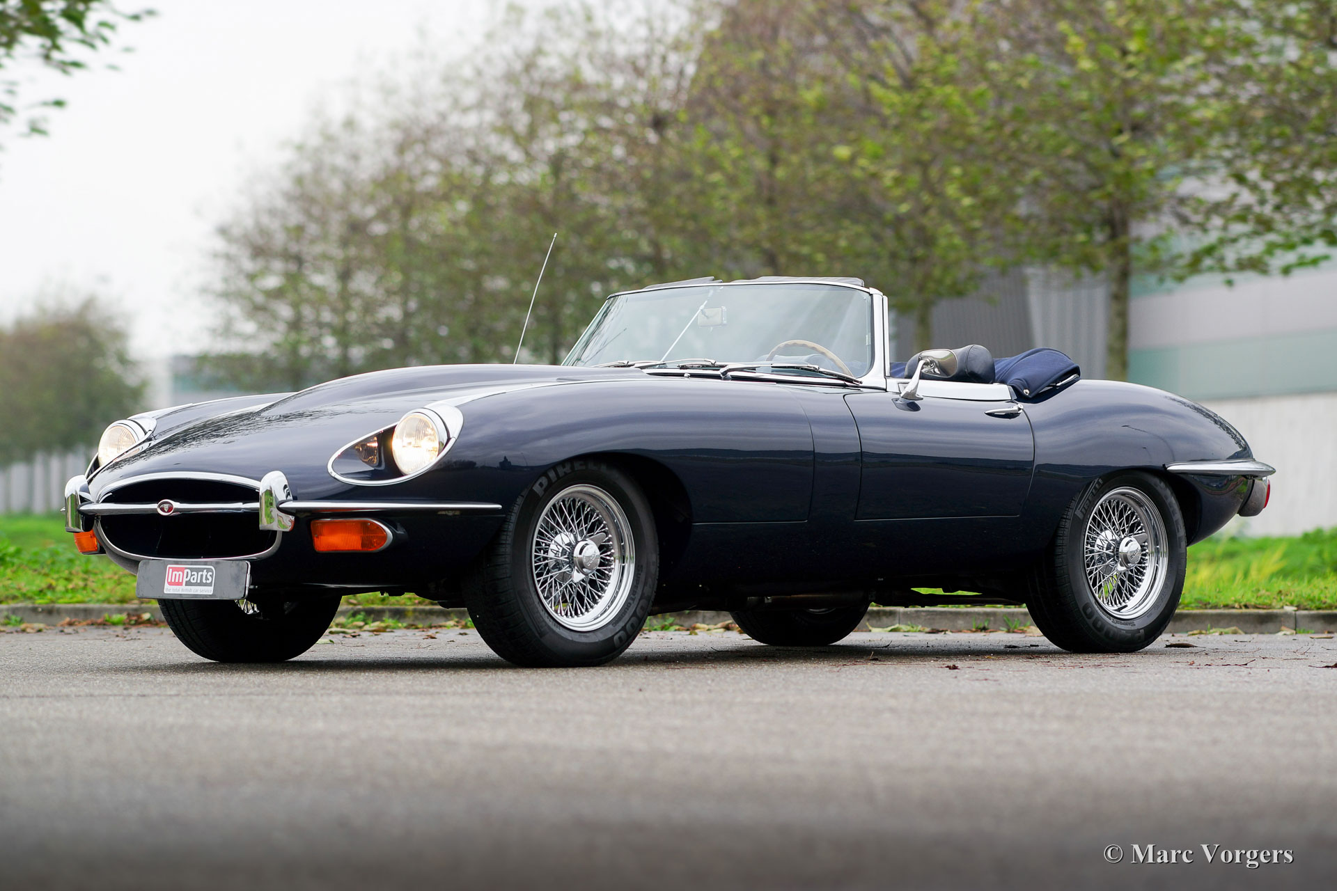 Jaguar E-Type 4.2 litres série 2 OTS (roadster), année 1970. Couleur bleu foncé combiné avec un intérieur en cuir bleu foncé et tapis bleu foncé. Capot et capuche en mohair bleu foncé. Cette magnifique Jaguar E-Type Open Two Seater (OTS, aussi appelé roadster) fut importée aux Pays-Bas en l'an 1990. Le moteur et la boîte de vitesses sont toujours les unités originales montées en usine : «Matching numbers»! Dans les années 1990, l'automobile était restaurée détaillée et parfaitement ; La voiture est toujours dans un état superbe ! La carrosserie présente une forme de panneau nette, une superbe peinture et une magnifique finition chromée. L'intérieur est excellent tout au long et la salle des machines affiche très bien entretenu. Le moteur fut modifié pour fonctionner à l'essence sans plomb. En commençant par la série 2, le E-Type était disponible avec une direction assistée en option, le premier propriétaire l'avait monté en usine ; une option souhaitable qui ajoute à une expérience de conduite confortable considérablement ! La série 2 comprend également des sièges améliorés, des freins améliorés et un système de refroidissement amélioré. Ce magnifique Jaguar E-Type est doté de larges roues de fil chromées, de pneus Pirelli P4000 (205 / 70-15), d'un échappement en acier inoxydable, de trois carburateurs SU, d'un indicateur de vitesse km / h et du magnifique volant E-Type original bordé de bois. C'est un spécimen excellent !