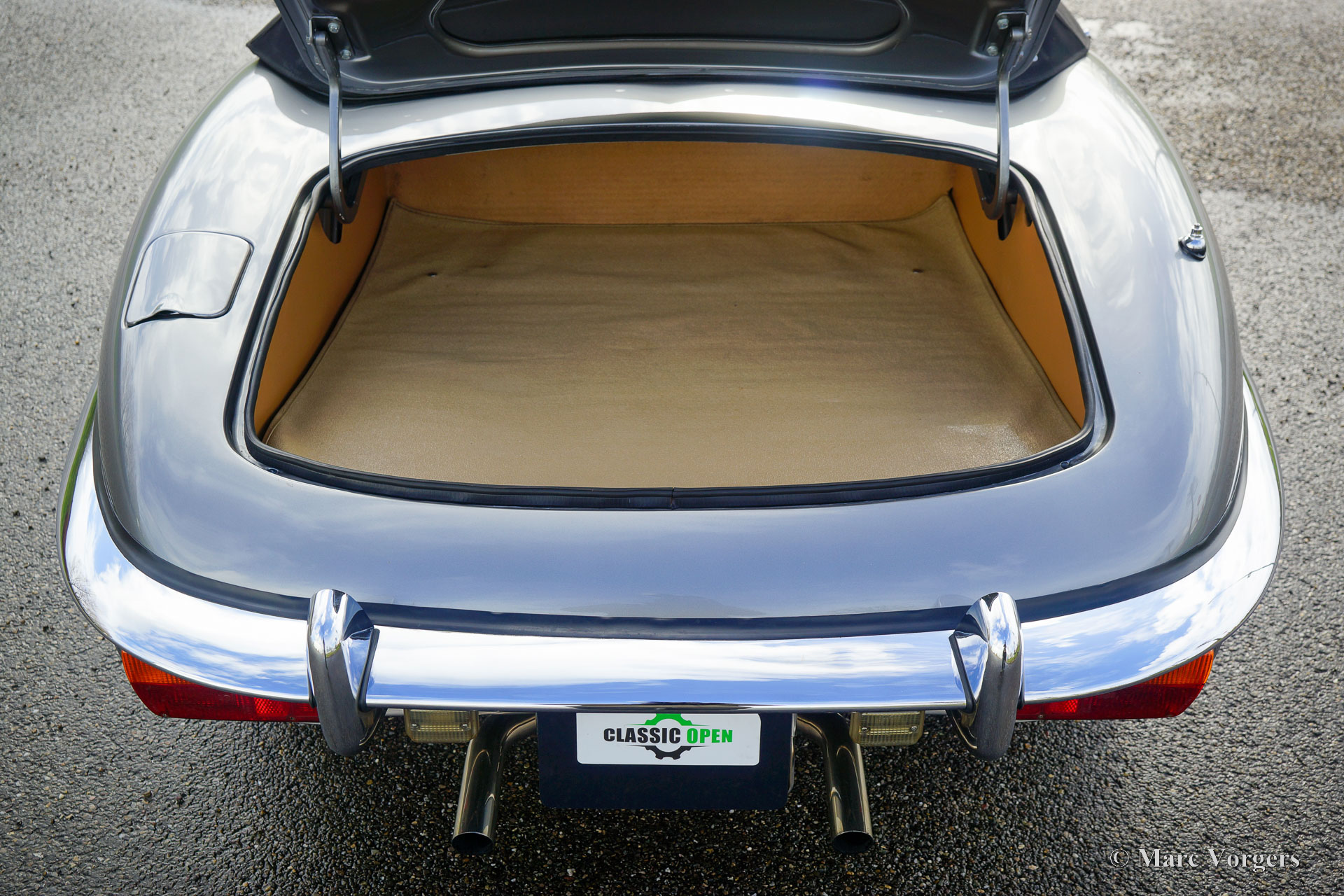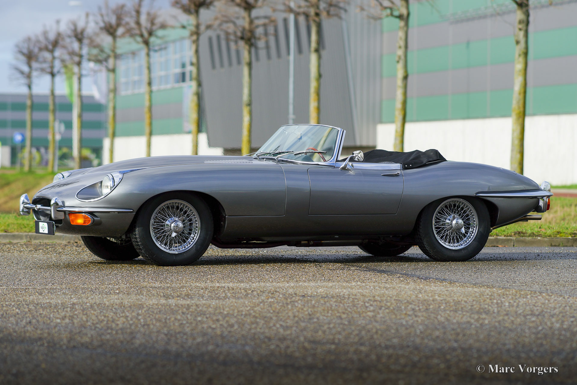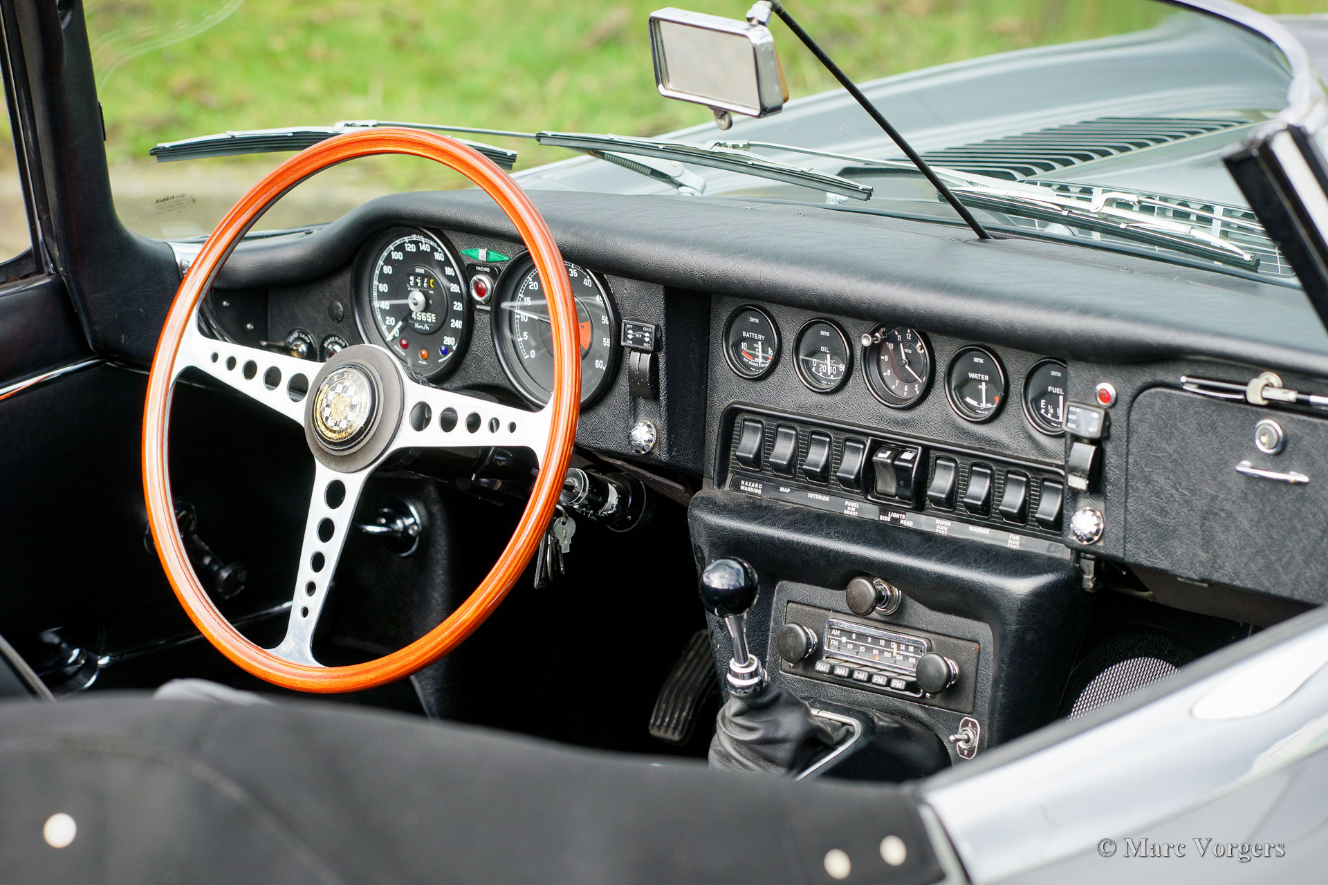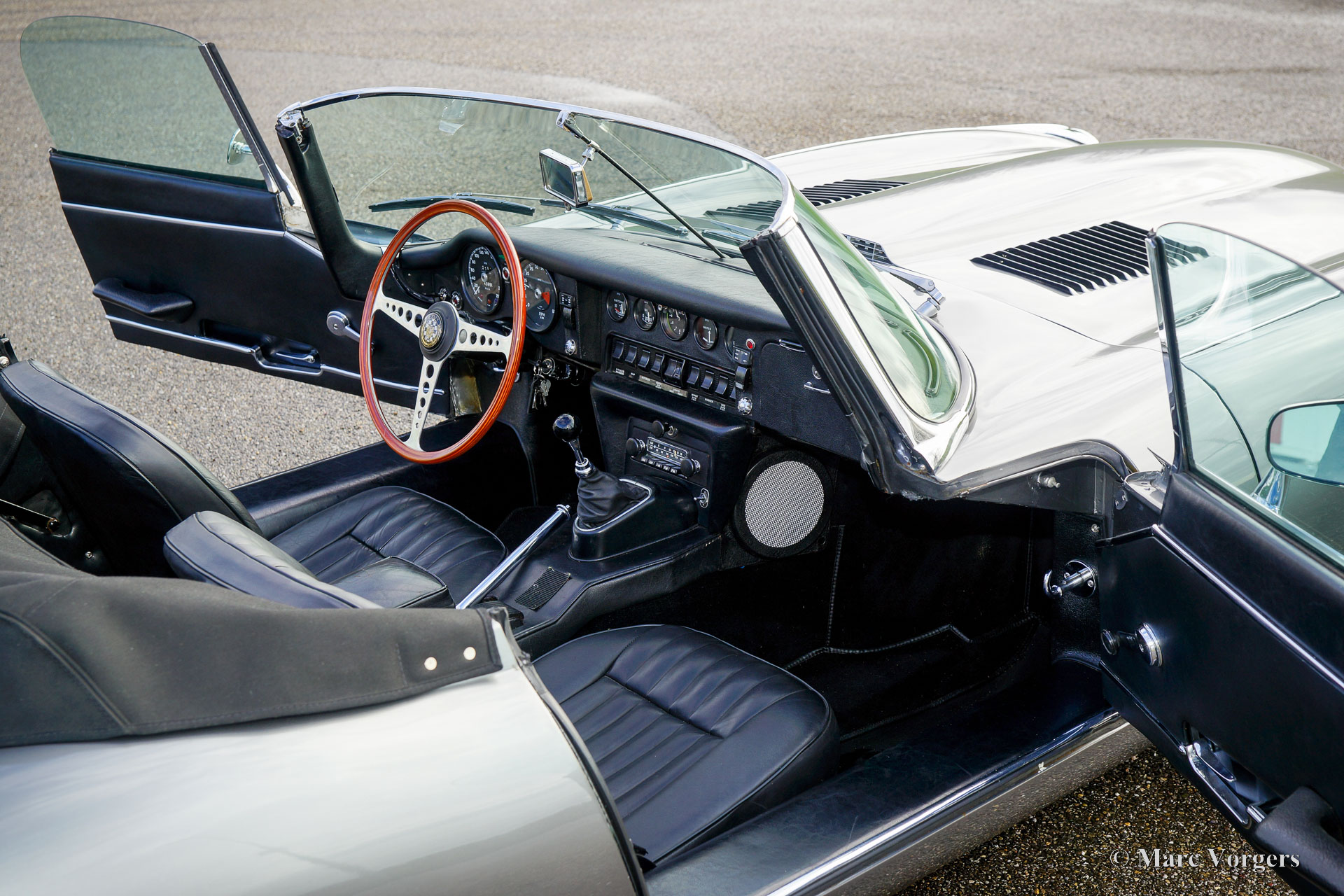 Jaguar E-type 4,2 litres OTS (Open Two-Seater), année 1970. Couleur gris métallisé (Gunmetal grey) combinée à un intérieur en cuir noir et un tapis noir. Capote et housse de capote en mohair noir. Cette magnifique Jaguar E-type a été vendue neuve à New York, aux États-Unis. Aux États-Unis, le E-type est également connu sous le nom de XK-E et le biplace ouvert (OTS) est connu sous le nom de « roadster ». Cette magnifique Jaguar E-Type fut restaurée détaillée dans le passé, le travail fut effectué selon les spécifications d'origine de l'usine. Un important dossier historique/restauration est présent avec un reportage photo de restauration complet et des factures confirmant la qualité de la restauration. La voiture fut importée aux Pays-Bas en 2014 et elle fut achetée par le propriétaire actuel en 2019. Cette Jaguar de E-type roule et se manie parfaitement, et la voiture est dans un état très bon à excellent ! Cette Jaguar E-type est une voiture à numéros concordants, un certificat « Heritage » est présent confirmant que des composants importants comme le moteur et la boîte de vitesses sont d'origine pour cette voiture. En 2021, la voiture a reçu un rapport de pont arrière plus élevé (spécification européenne) qui a réduit les révolutions du moteur à tous des vitesses de conduite d'environ 10%. Le puissant moteur six cylindres de 4,2 litres entraîne les roues arrière via une boîte de vitesses manuelle à 4 rapports. Cette merveilleuse Jaguar E-Type est une voiture magnifiquement restaurée et une voiture de conducteur fantastique, une excellente trouvaille pour les passionnés de Jaguar !