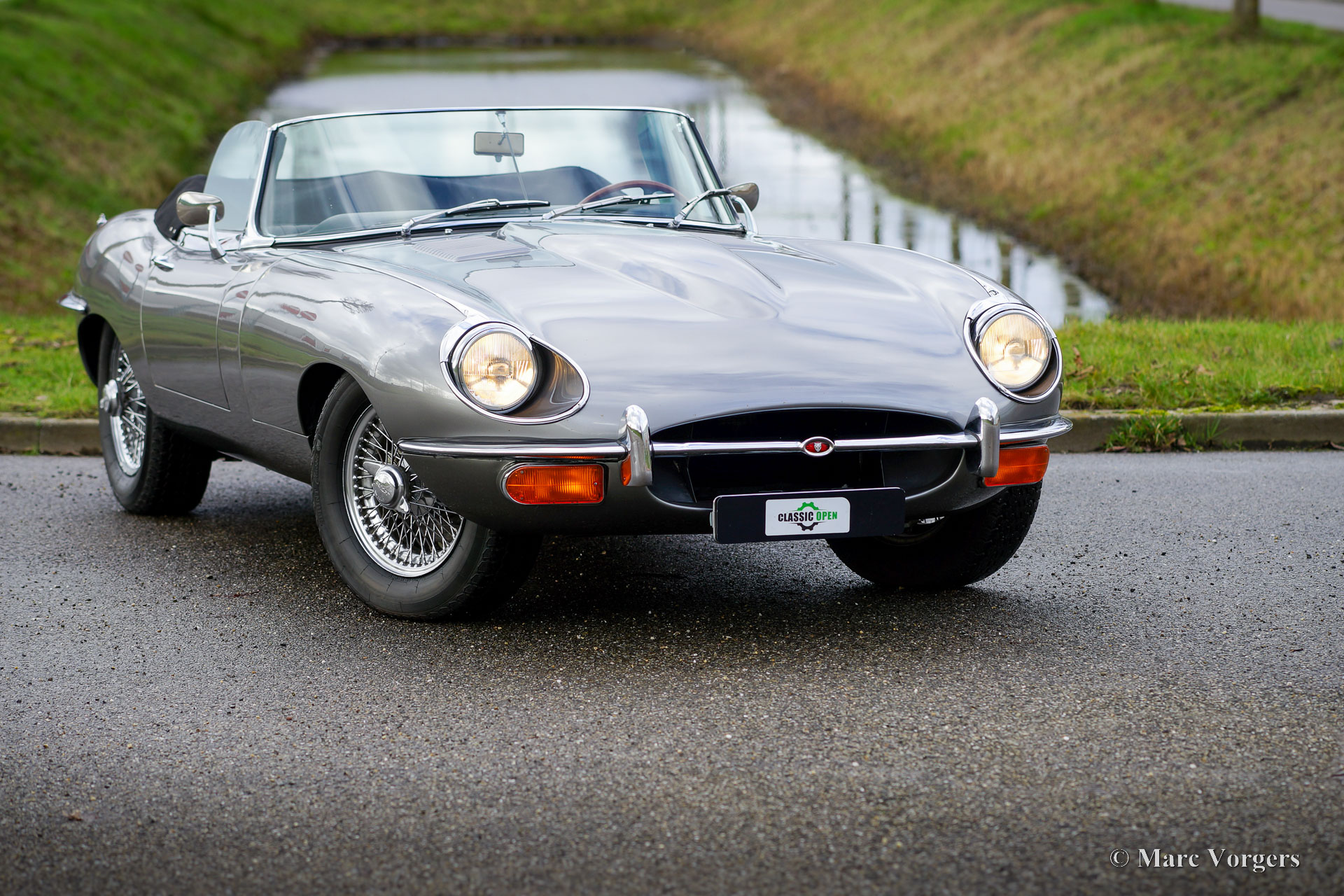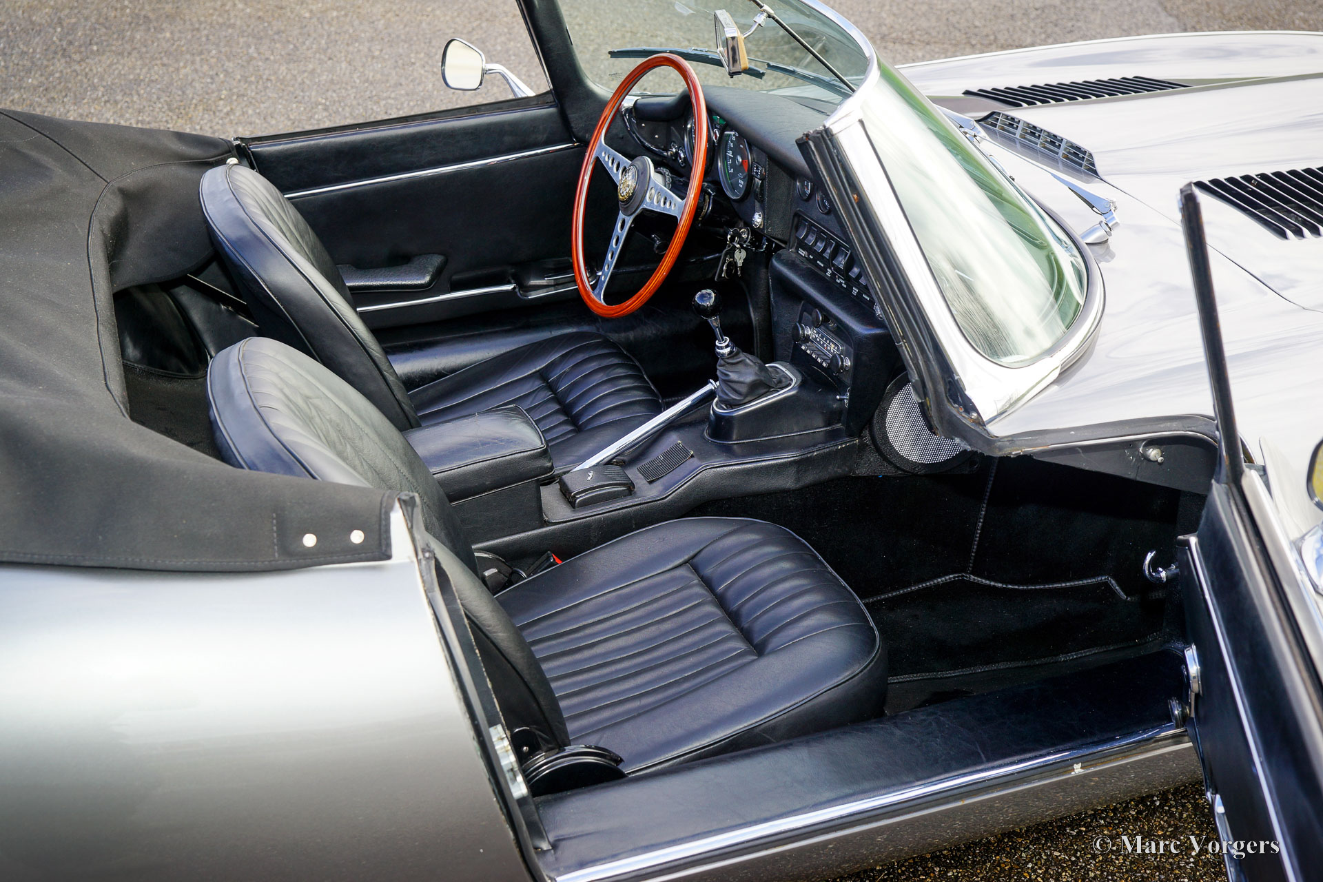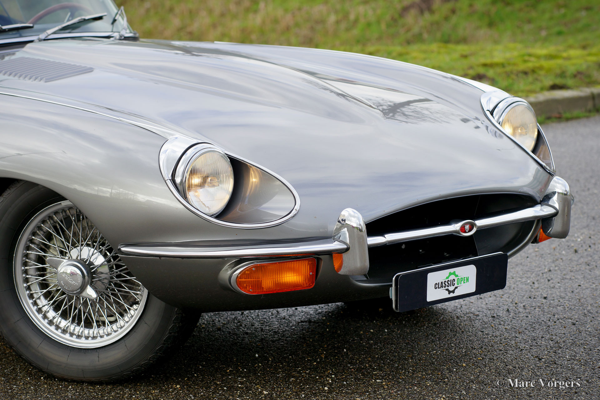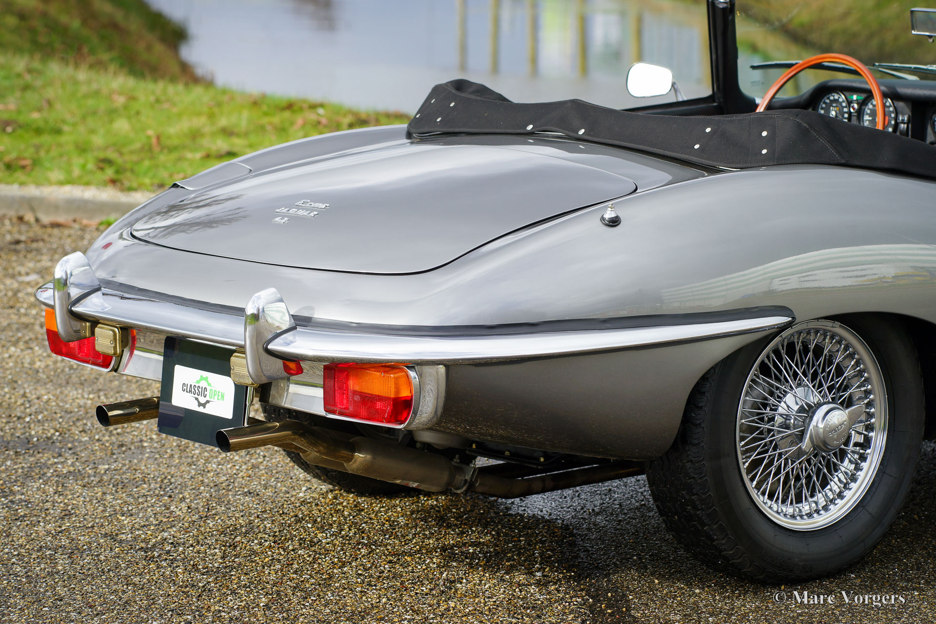 Jaguar E-type 4,2 litres OTS (Open Two-Seater), année 1970. Couleur gris métallisé (Gunmetal grey) combinée à un intérieur en cuir noir et un tapis noir. Capote et housse de capote en mohair noir. Cette magnifique Jaguar E-type a été vendue neuve à New York, aux États-Unis. Aux États-Unis, le E-type est également connu sous le nom de XK-E et le biplace ouvert (OTS) est connu sous le nom de « roadster ». Cette magnifique Jaguar E-Type fut restaurée détaillée dans le passé, le travail fut effectué selon les spécifications d'origine de l'usine. Un important dossier historique/restauration est présent avec un reportage photo de restauration complet et des factures confirmant la qualité de la restauration. La voiture fut importée aux Pays-Bas en 2014 et elle fut achetée par le propriétaire actuel en 2019. Cette Jaguar de E-type roule et se manie parfaitement, et la voiture est dans un état très bon à excellent ! Cette Jaguar E-type est une voiture à numéros concordants, un certificat « Heritage » est présent confirmant que des composants importants comme le moteur et la boîte de vitesses sont d'origine pour cette voiture. En 2021, la voiture a reçu un rapport de pont arrière plus élevé (spécification européenne) qui a réduit les révolutions du moteur à tous des vitesses de conduite d'environ 10%. Le puissant moteur six cylindres de 4,2 litres entraîne les roues arrière via une boîte de vitesses manuelle à 4 rapports. Cette merveilleuse Jaguar E-Type est une voiture magnifiquement restaurée et une voiture de conducteur fantastique, une excellente trouvaille pour les passionnés de Jaguar !